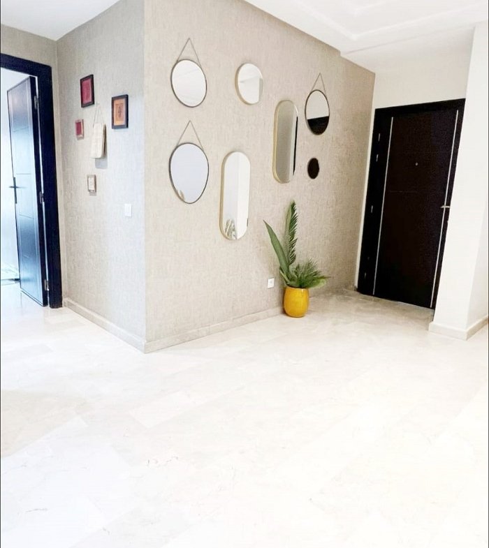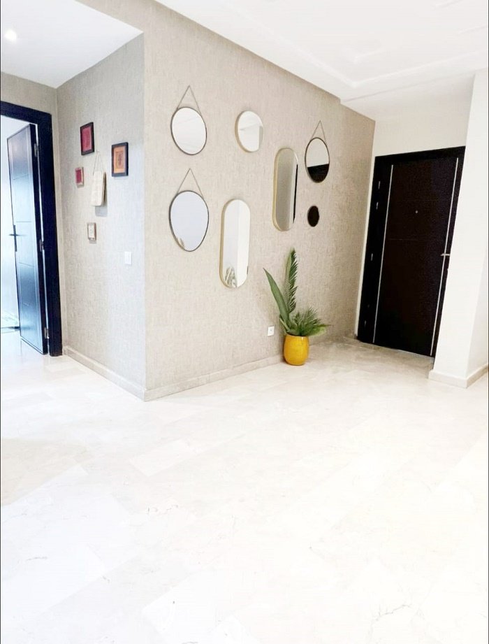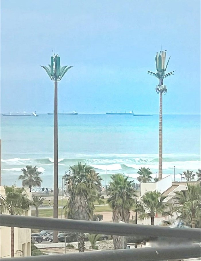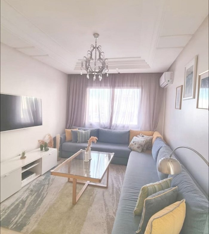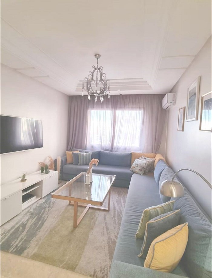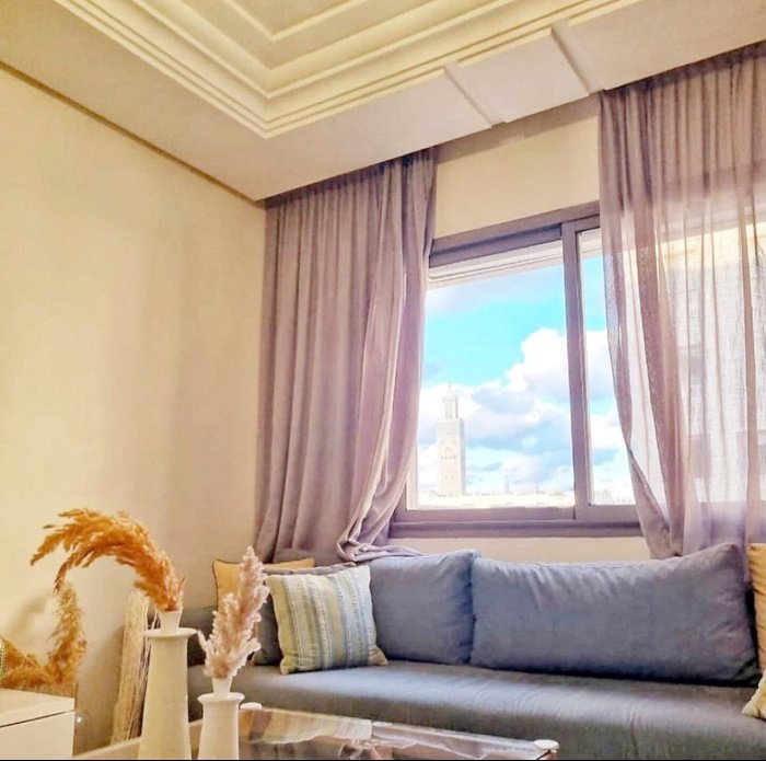 appartement à louer meublé bourgogne casablanca, situé au 5ème étage avec une vue dégagée sur la Mosquée Hassan II et un aperçu sur la mer.