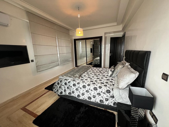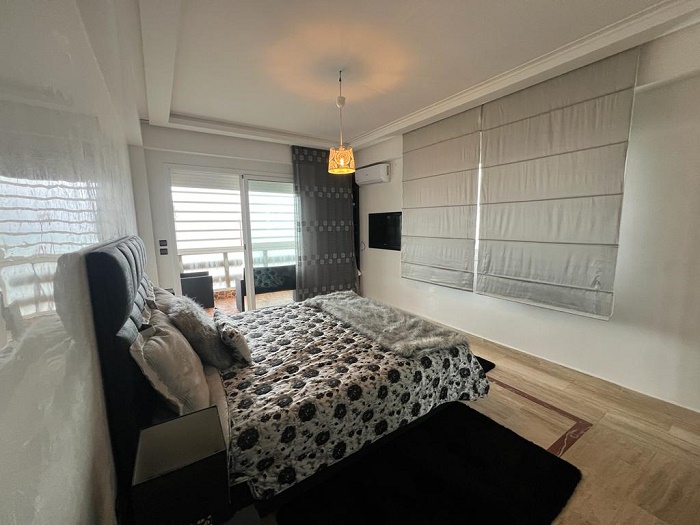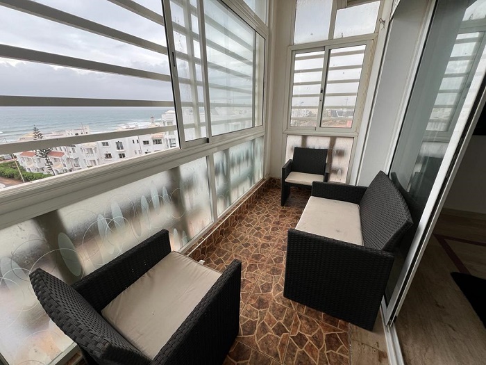 Appartement-à-louer-meublé-Dar Bouazza est dans une résidence sécurisée avec espace vert et piscine, cet appartement est en location meublée comprend un salon spacieux et lumineux avec Balcon offrant une vue imprenable sur l’océan, un coin salle à manger, une cuisine entièrement équipée avec électroménagers, une suite parentale dont salle de bain moderne, placard et balcon avec vue sur mer, une autre chambre avec placards, une autre salle de bain avec cabine douche, place au parking