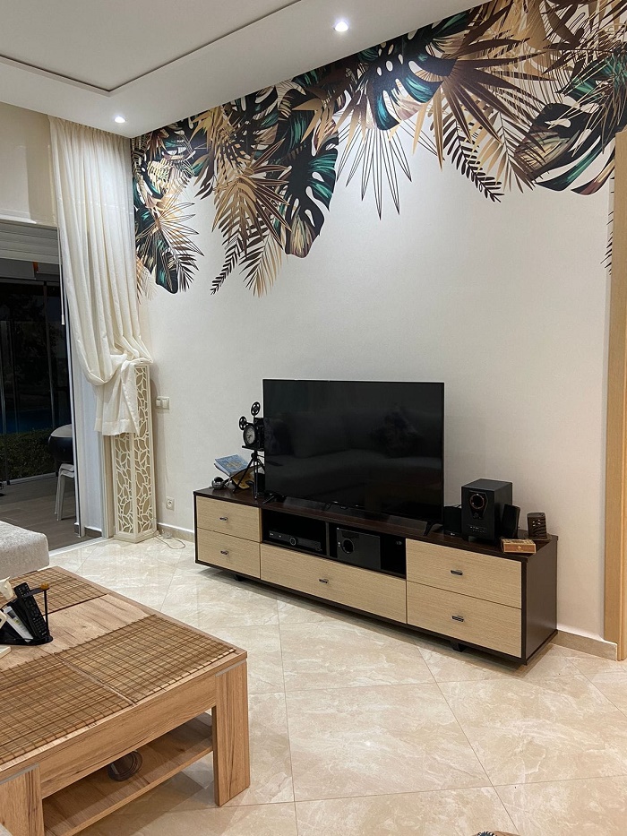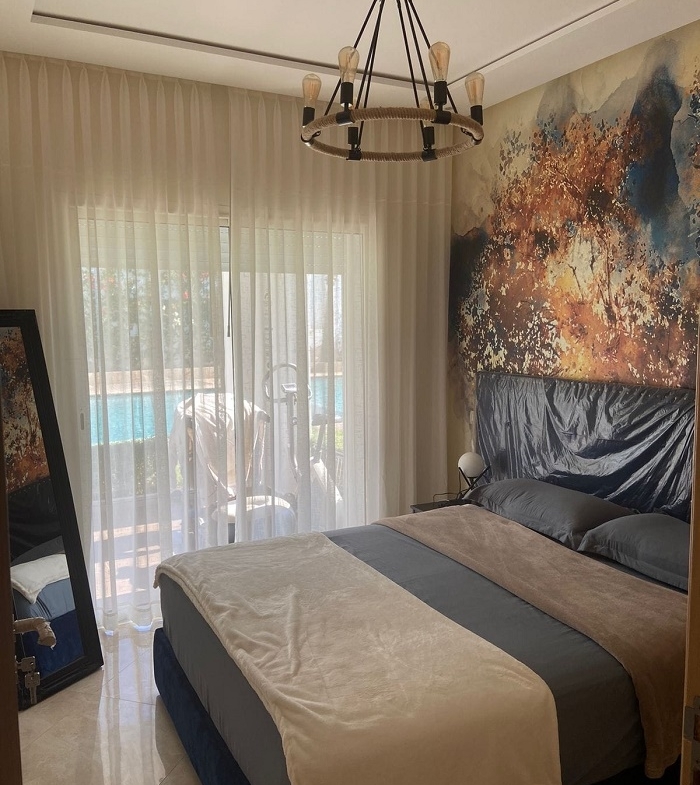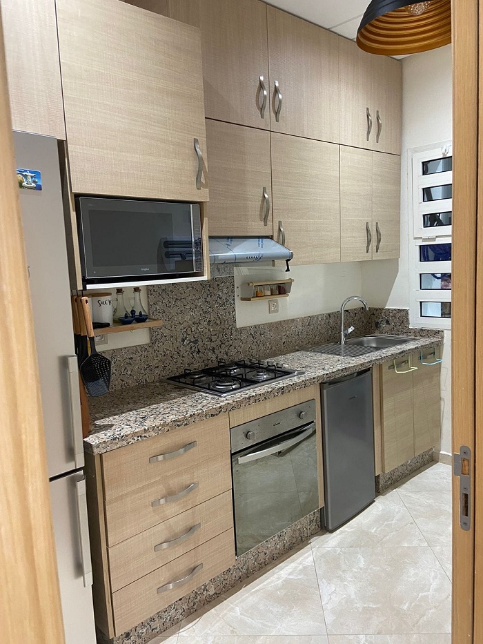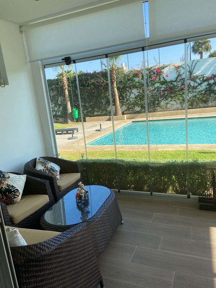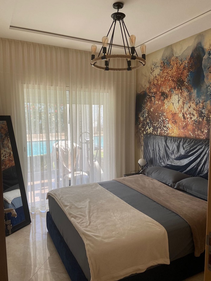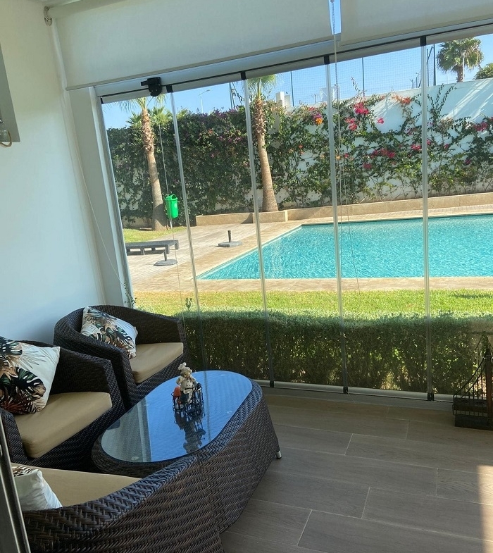Appartement-à-vendre-meublé-sur-Sidi-Rahal, une charmante ville balnéaire d’une superficie de 78m², se trouvant en rez de jardin, dans une résidence sécurisée avec piscine et espace vert, proche de toutes les commodités, comprenant un salon lumineux donnant sur une terrasse aménagée avec baies vitrées en accordéon et vue directe sur le jardin et la piscine, coin salle à manger, deux chambres à coucher spacieuses avec placards intégrés, Salle de bain moderne avec douche à l’italienne, cuisine entièrement équipée avec électroménagers modernes avec coin buanderie, Meubles de qualité inclus dans le prix de vente