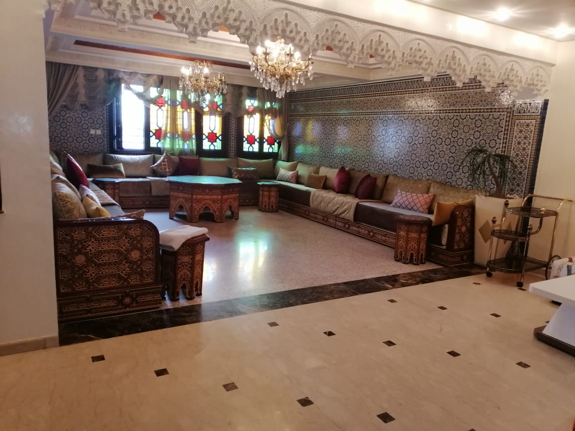 Immobilier au Maroc, location appartement sur Casablanca, quartier des Hôpitaux (Mly Idriss 1er), meublé, d’une superficie de 170m² se trouvant au huitième et dernier étage plein sud seul au palier se composant d’un hall avec salle à manger, séjour, deux salons, WC réception, cuisine entièrement équipée, deux chambres avec placards, toilettes, suite parentale dont dressing et salle de bain, place de parking