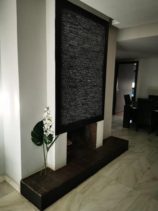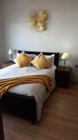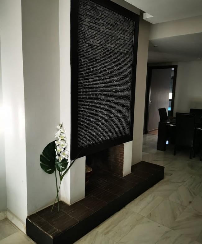 Bouskoura-Location-Appartement-Meublé-Sur-Ville Verte, d’une superficie totale de 148m², se trouvant au premier étage, avec vue dégagée, dans une résidence calme et sécurisée avec piscine collective, se composant d’un double salon avec coin cheminée et espace salle à manger, une salle d’eau invités, une cuisine entièrement équipée, deux chambres pour enfants avec rangements et terrasse, salle de bain avec cabine douche, une suite parentale dont dressing et salle de bain avec baignoire, une place au parking