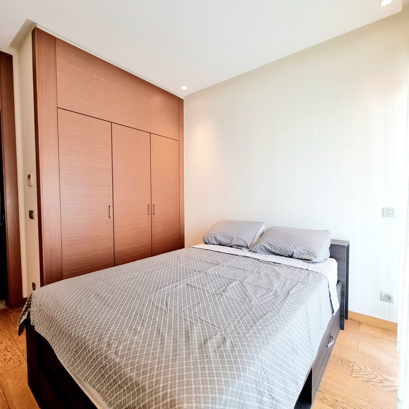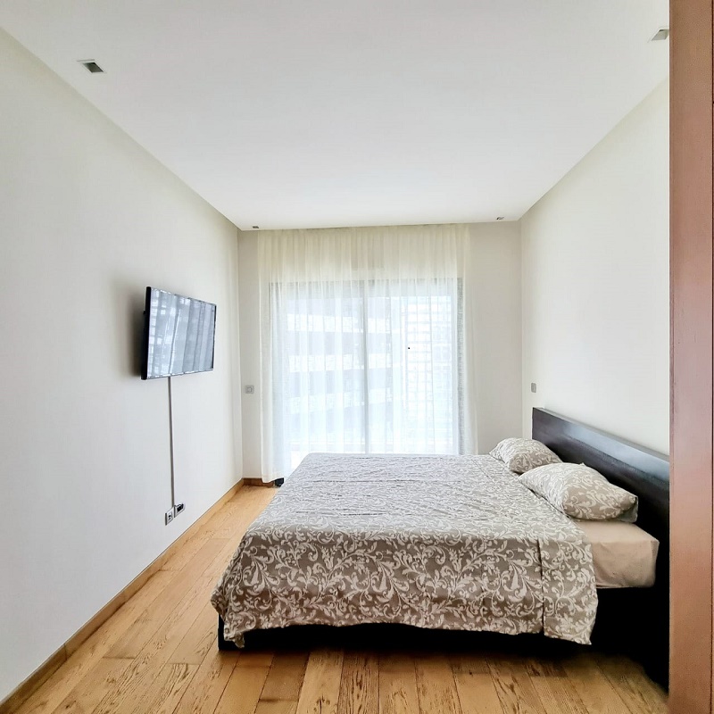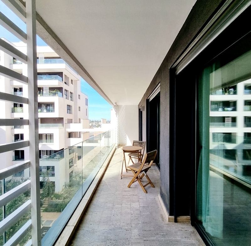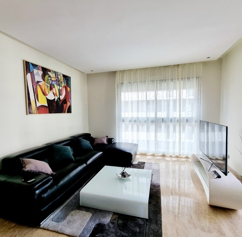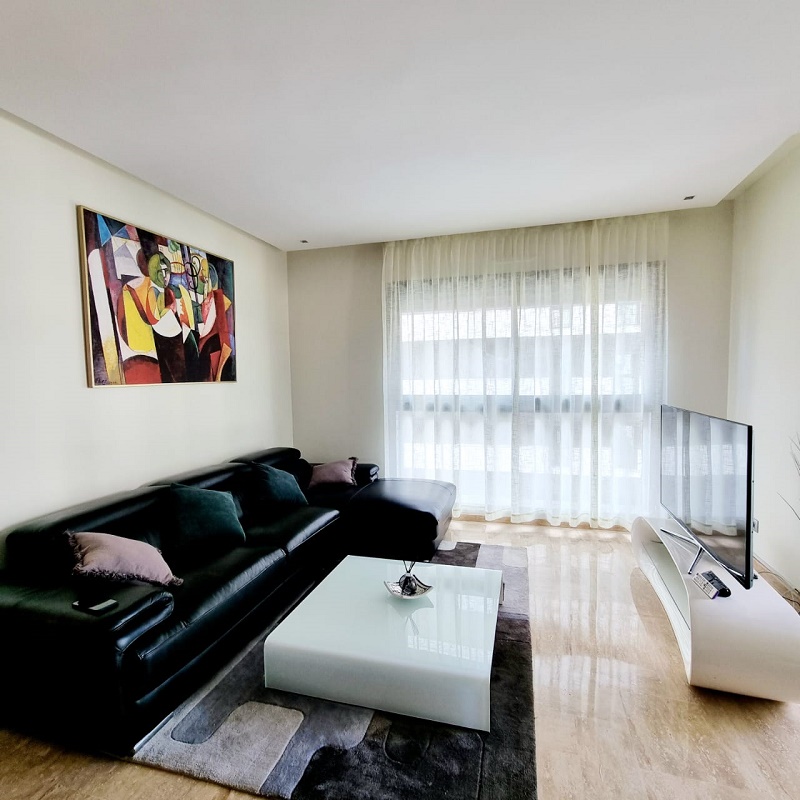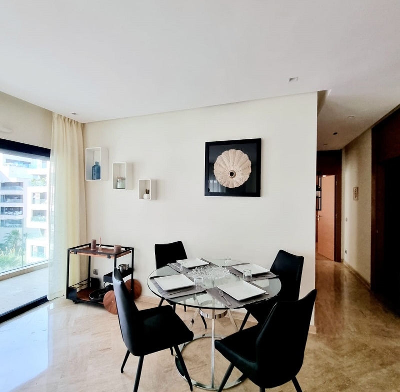 CFC-Location-Bel-Appartement-Meublé, situé sur Casa Finance City, dans une résidence sécurisée, proche de toutes les commodités, avec espace vert, l’appartement est joiment meublé comprenant un Salon européen en L avec espace salle à manger (table et chaises) donnant sur une belle terrasse, une cuisine entièrement équipée, une chambre parentale dont placards et salle de bain avec baignoire, une autre chambre avec placards, salle de bain avec cabine douche, et une place au parking