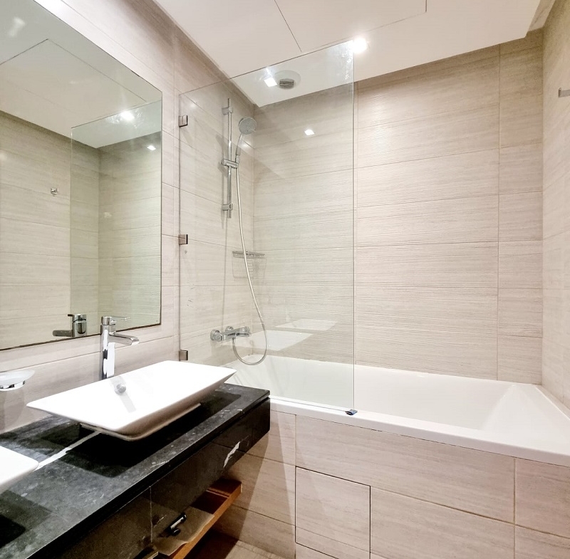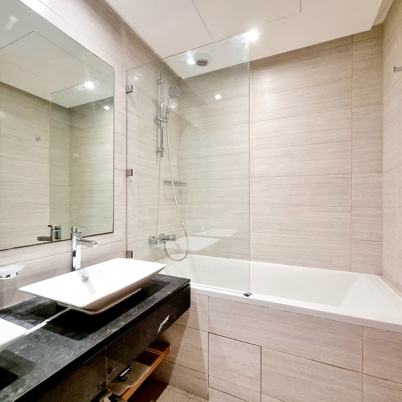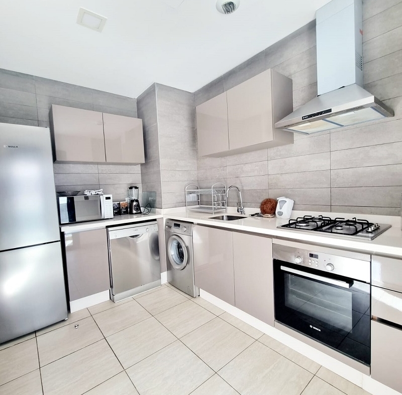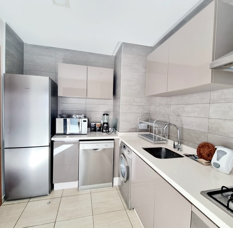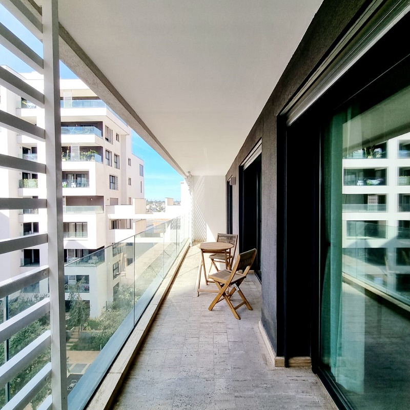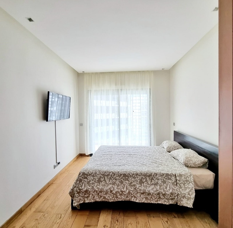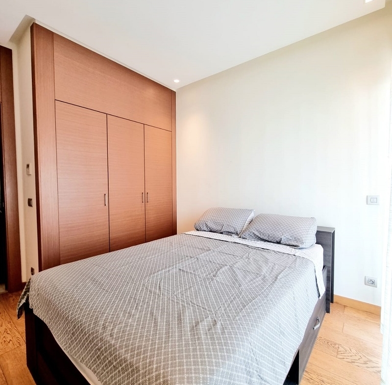 CFC-Location-Bel-Appartement-Meublé, situé sur Casa Finance City, dans une résidence sécurisée, proche de toutes les commodités, avec espace vert, l’appartement est joiment meublé comprenant un Salon européen en L avec espace salle à manger (table et chaises) donnant sur une belle terrasse, une cuisine entièrement équipée, une chambre parentale dont placards et salle de bain avec baignoire, une autre chambre avec placards, salle de bain avec cabine douche, et une place au parking