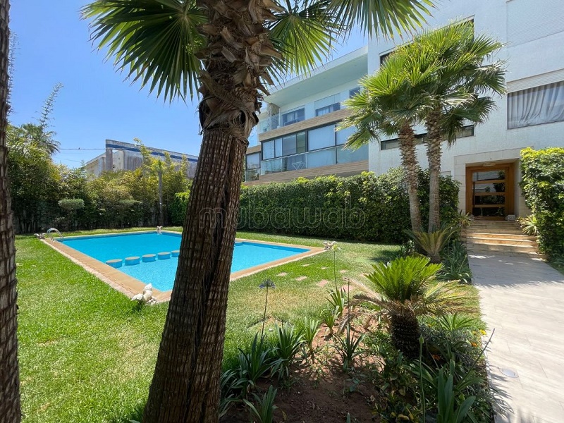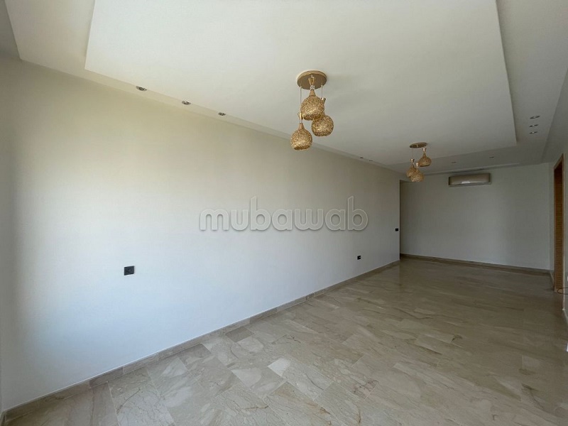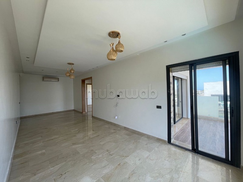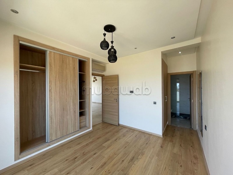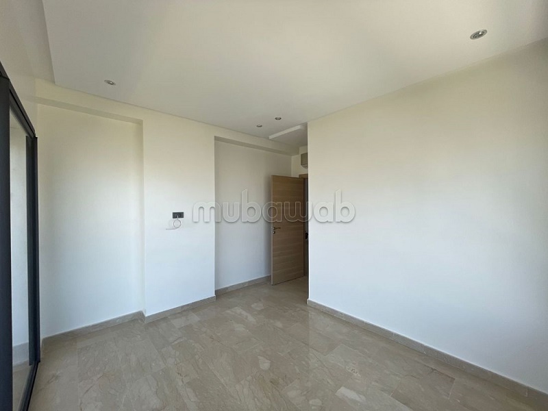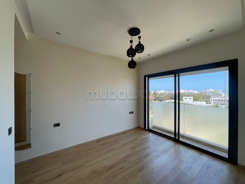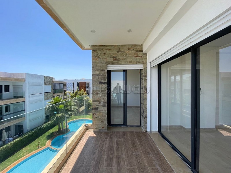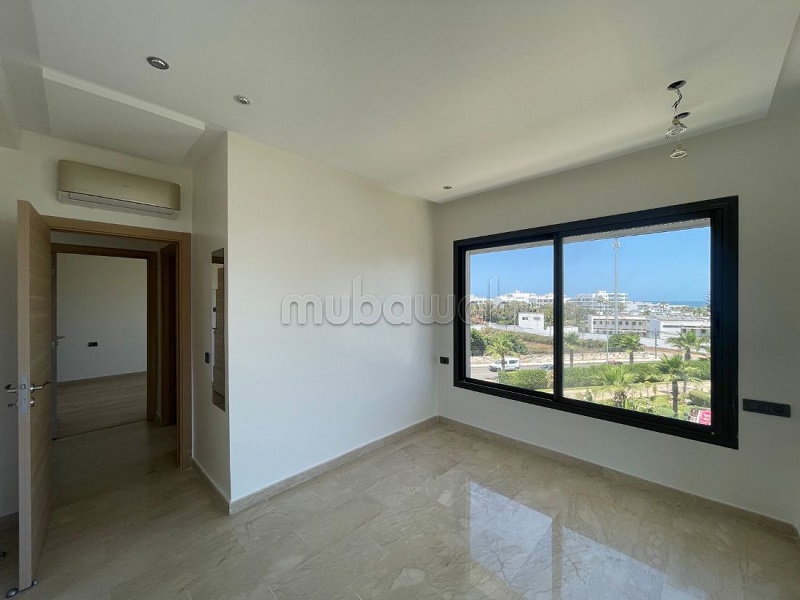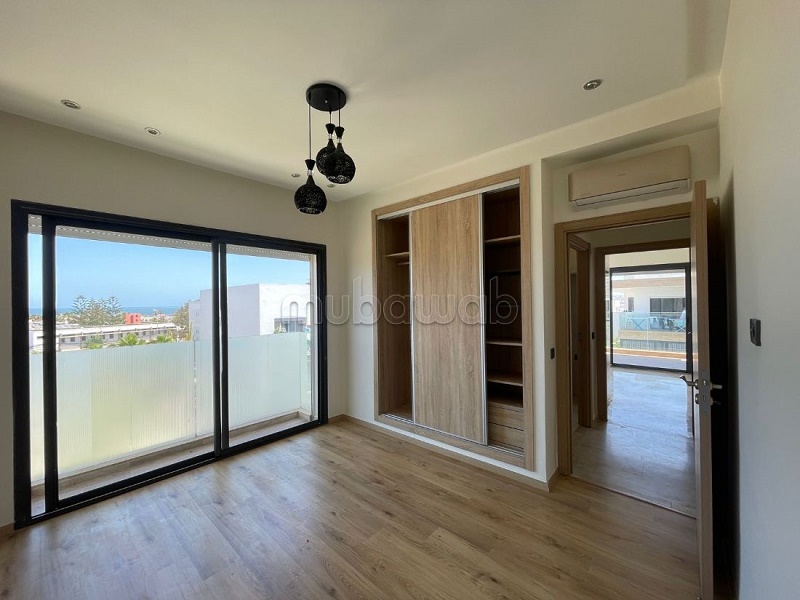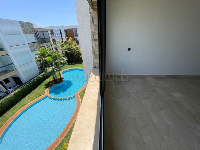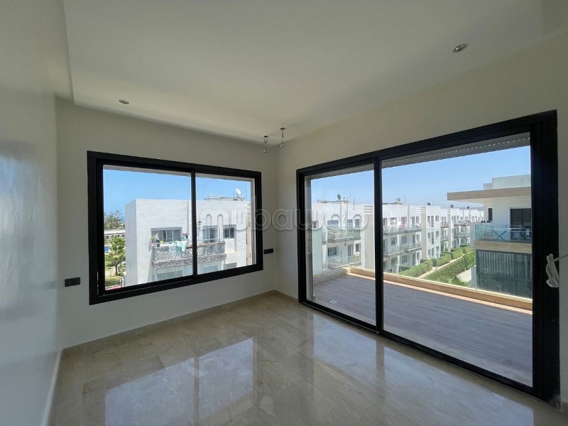 Dar Bouazza-Location-Appartement-2CH-Terrasse, résidence de construction récente avec espace vert et plusieurs piscines, proche de toutes les commodités, se trouvant en étage élevé avec vue imprenable, comprenant un grand salon avec baies vitrées et accès direct à la terrasse, cuisine équipée, chambre parentale dont placards et salle de bain avec cabine douche, une chambre à coucher avec placards donnant sur la terrasse, salle de bain avec cabine douche, et place au parking