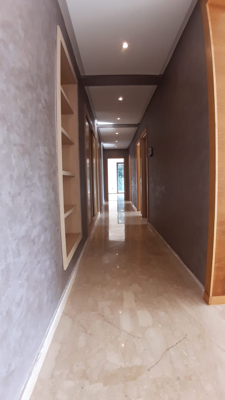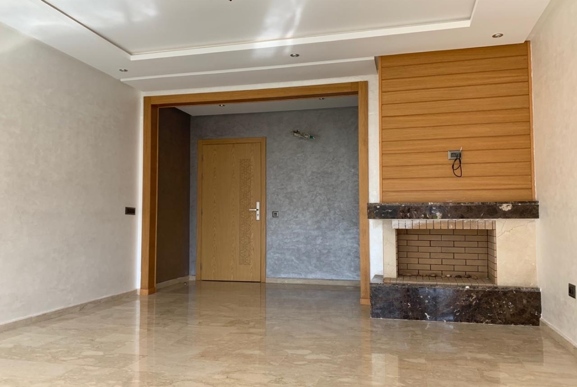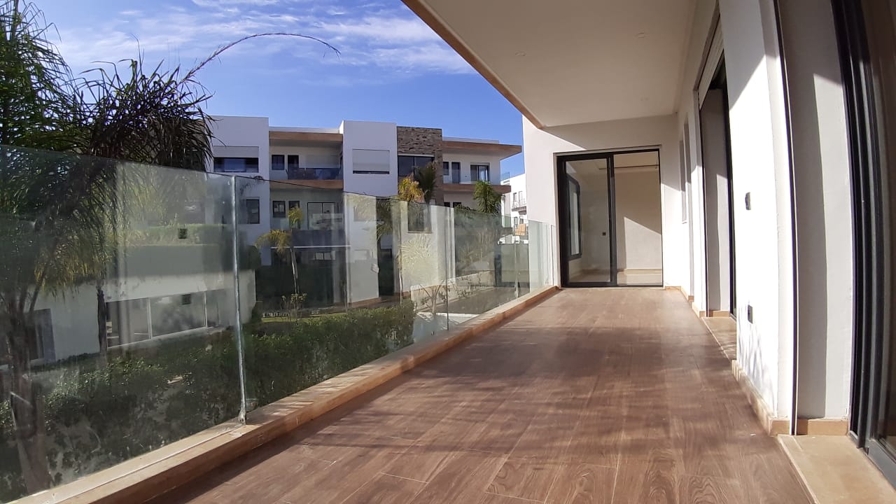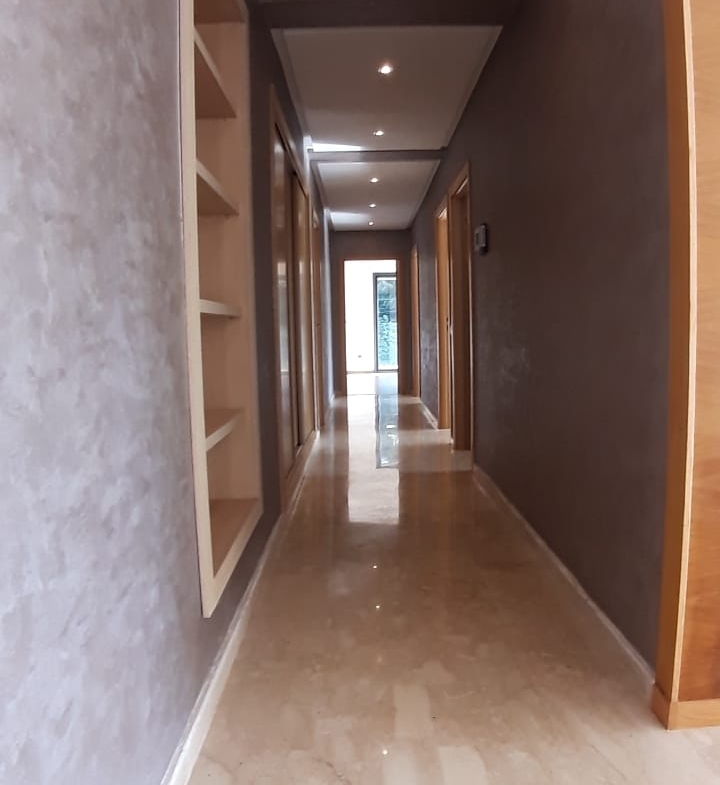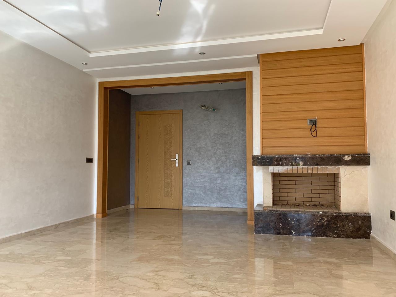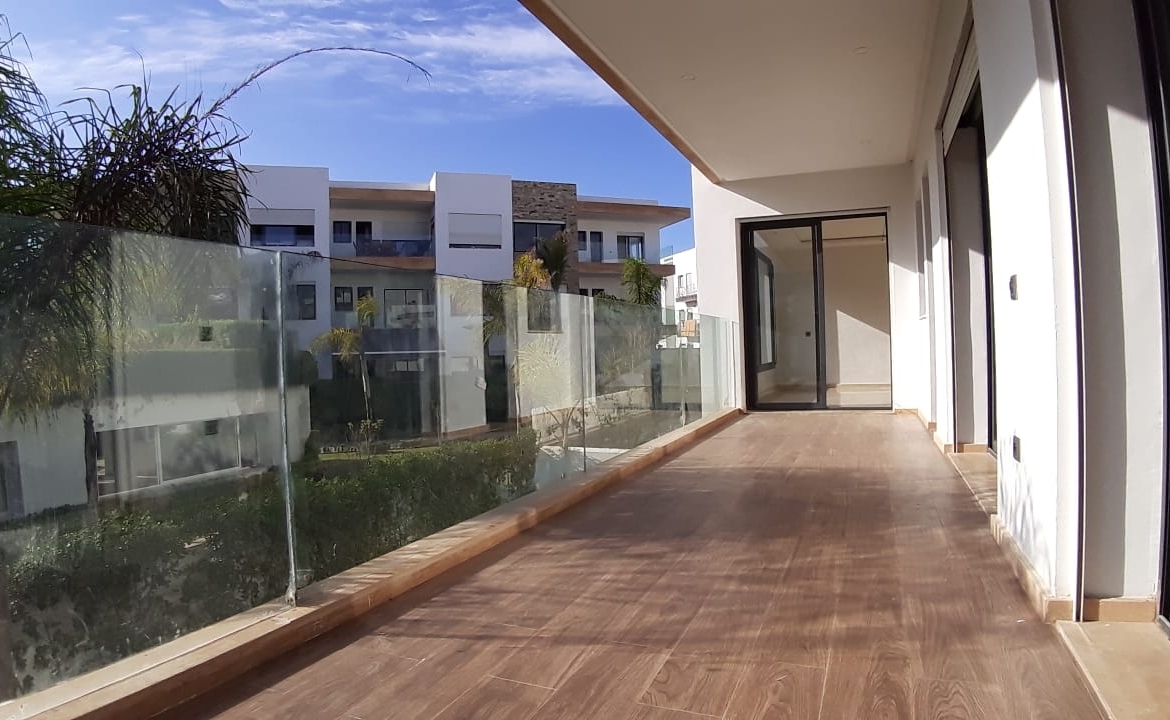 Dar Bouazza-Location-Appartement-Avec-Terrasse-Piscine, d’une superficie de 160m² dont 25m² de terrasse se trouvant au premier étage, dans une résidence sécurisée 24h/24 avec espace vert et piscines, l’appartement comprend un double salon avec cheminée donnant sur une terrasse, espace salle à manger, un grand couloir, cuisine équipée, suite parentale dont dressing et salle de bain avec douche à l’italienne, deux chambres avec placards, salle de bain avec cabine douche, place au parking,
