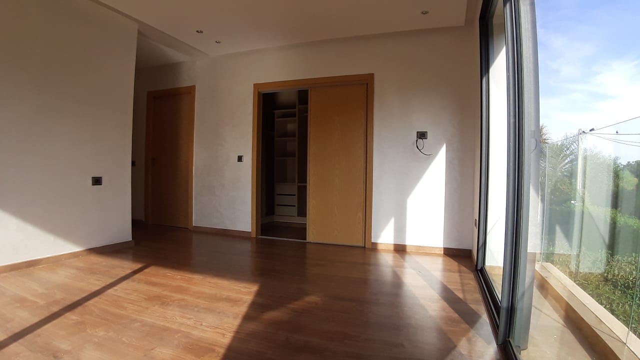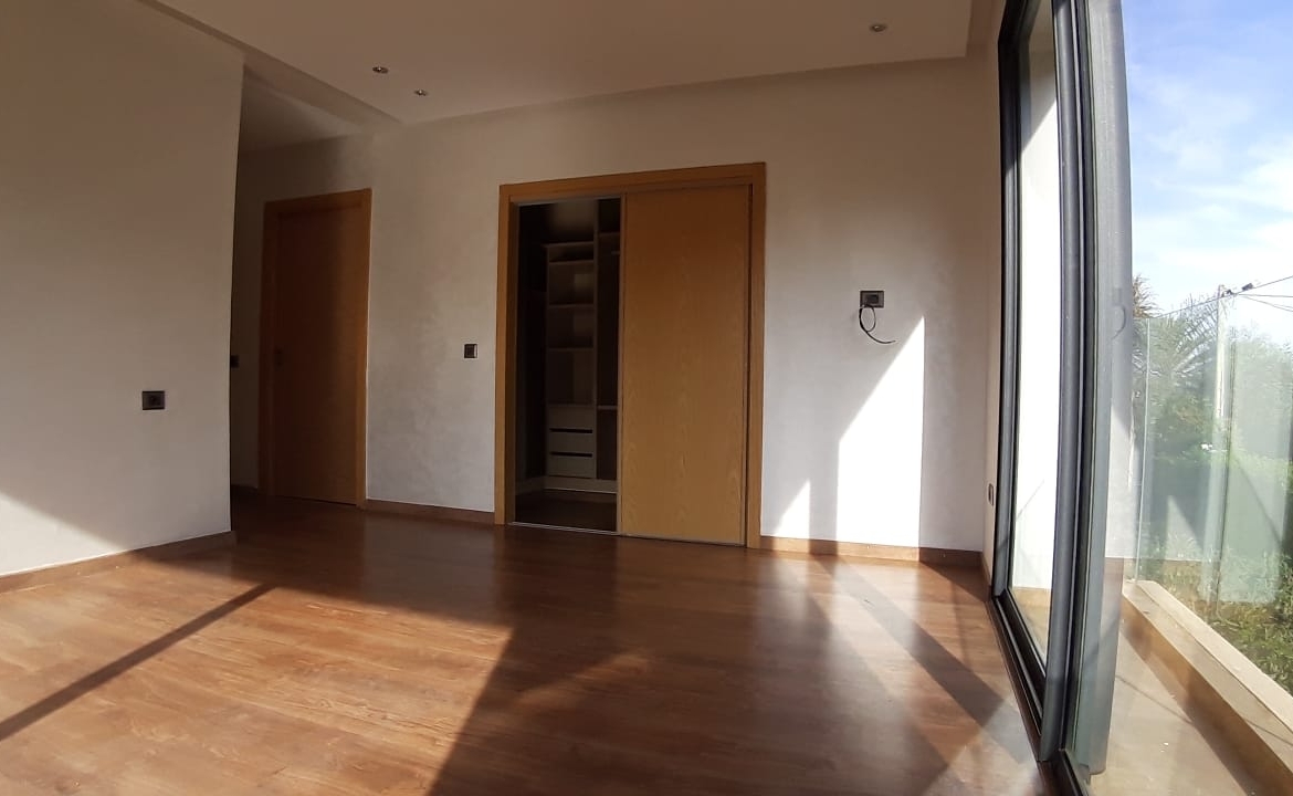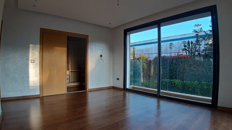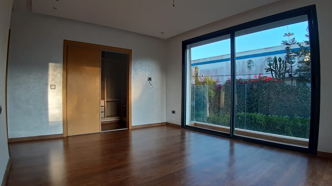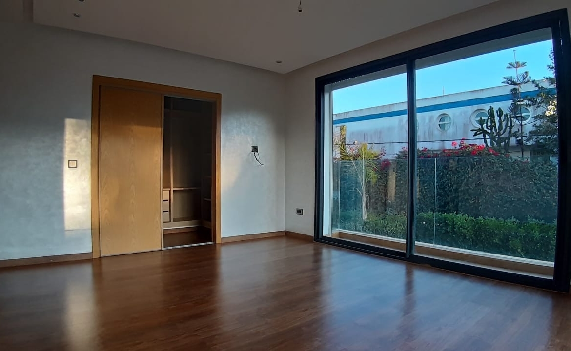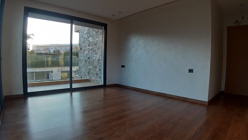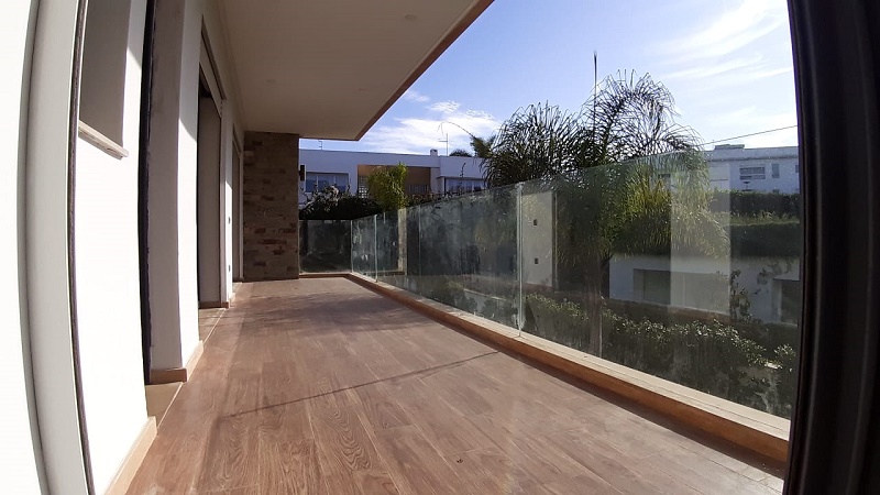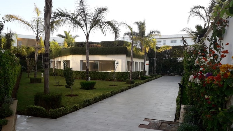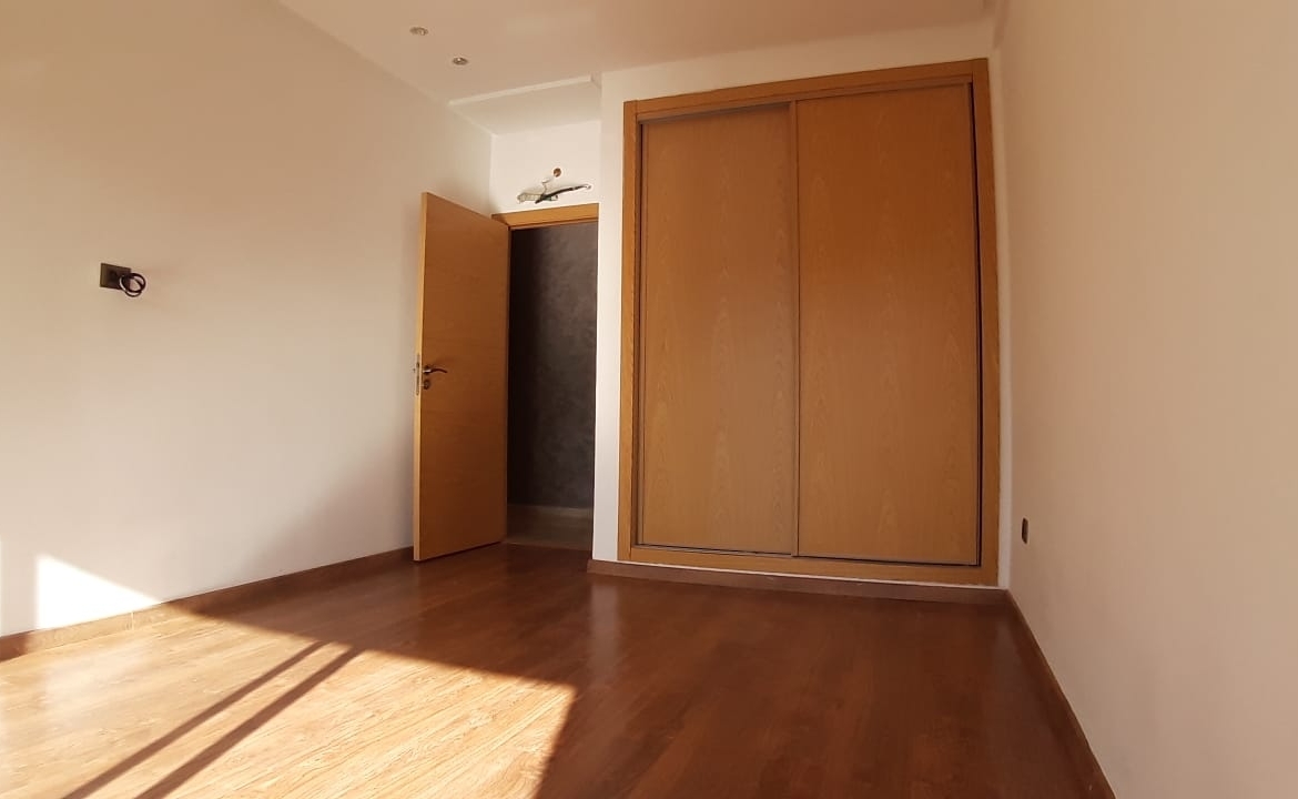 Dar Bouazza-Location-Appartement-Avec-Terrasse-Piscine, d’une superficie de 160m² dont 25m² de terrasse se trouvant au premier étage, dans une résidence sécurisée 24h/24 avec espace vert et piscines, l’appartement comprend un double salon avec cheminée donnant sur une terrasse, espace salle à manger, un grand couloir, cuisine équipée, suite parentale dont dressing et salle de bain avec douche à l’italienne, deux chambres avec placards, salle de bain avec cabine douche, place au parking,