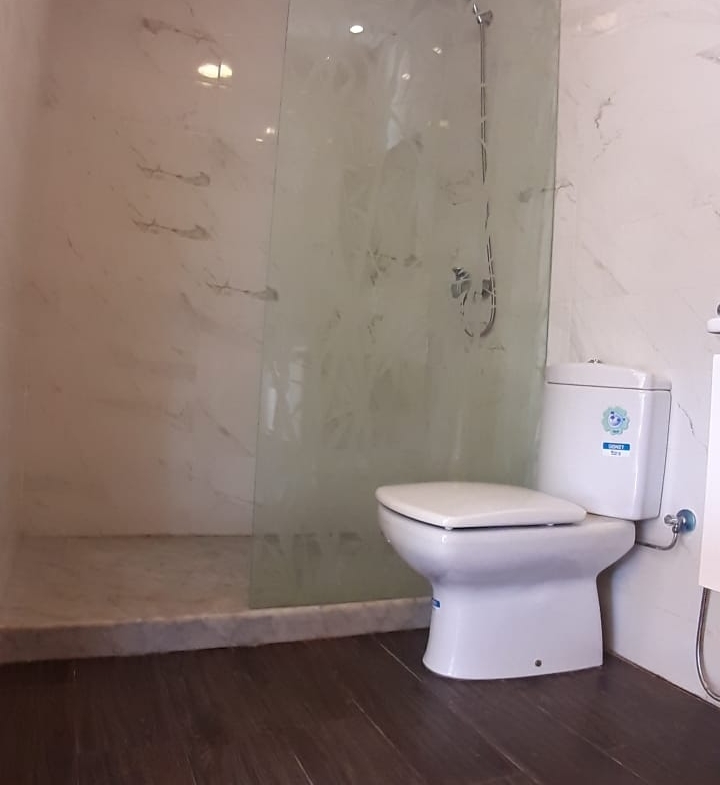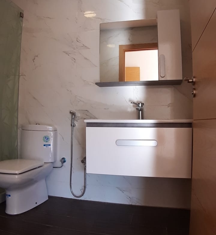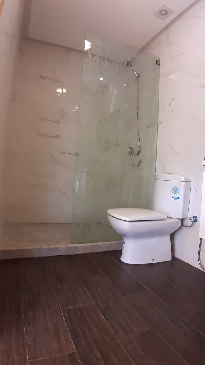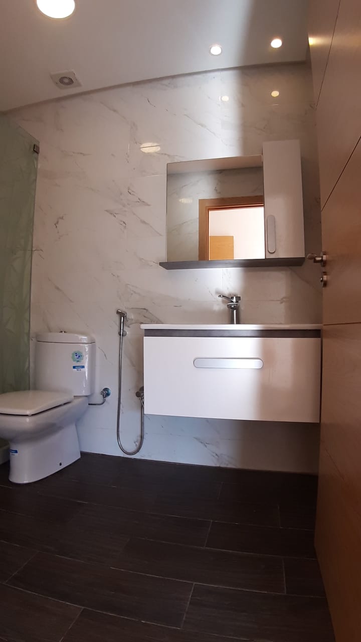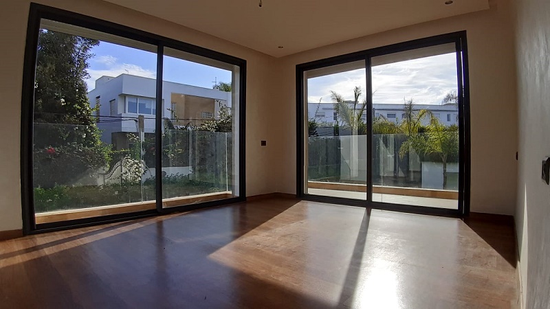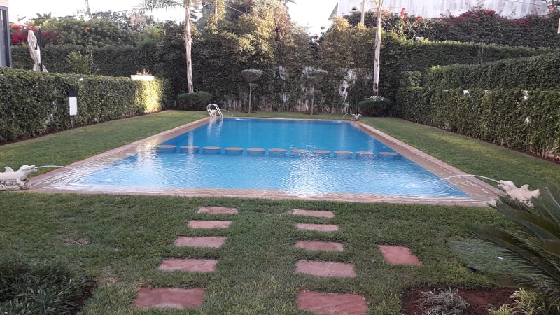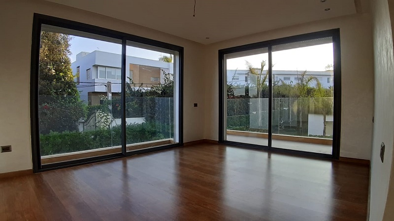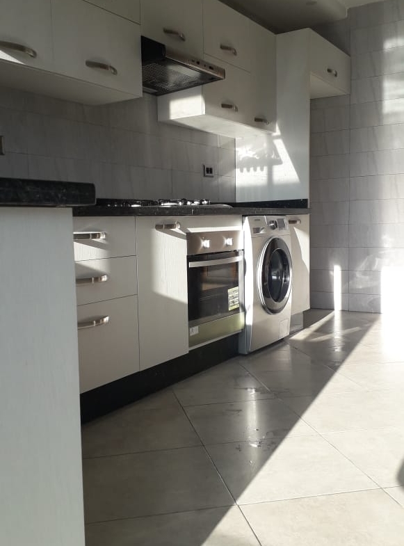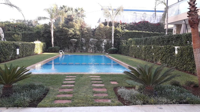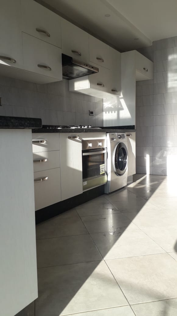 Dar Bouazza-Location-Appartement-Avec-Terrasse-Piscine, d’une superficie de 160m² dont 25m² de terrasse se trouvant au premier étage, dans une résidence sécurisée 24h/24 avec espace vert et piscines, l’appartement comprend un double salon avec cheminée donnant sur une terrasse, espace salle à manger, un grand couloir, cuisine équipée, suite parentale dont dressing et salle de bain avec douche à l’italienne, deux chambres avec placards, salle de bain avec cabine douche, place au parking,