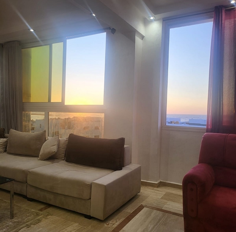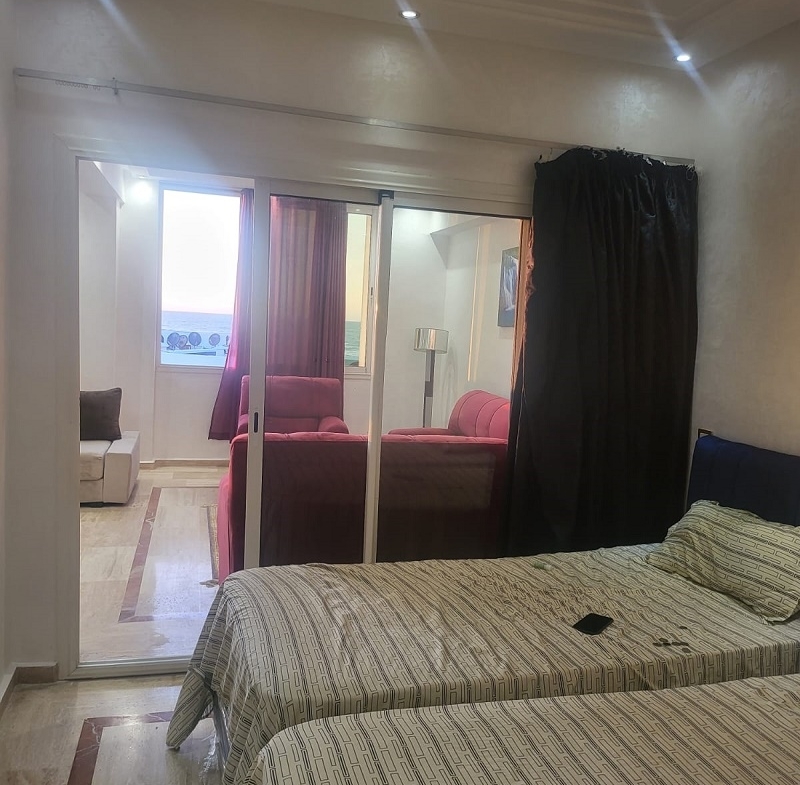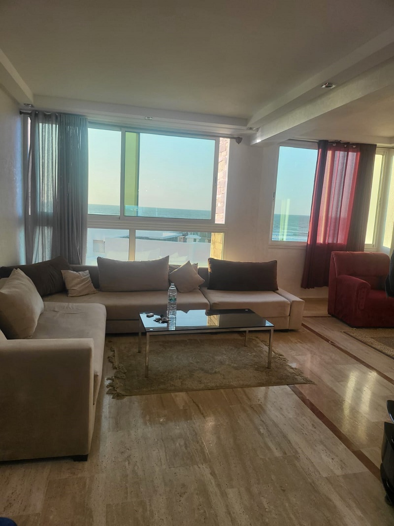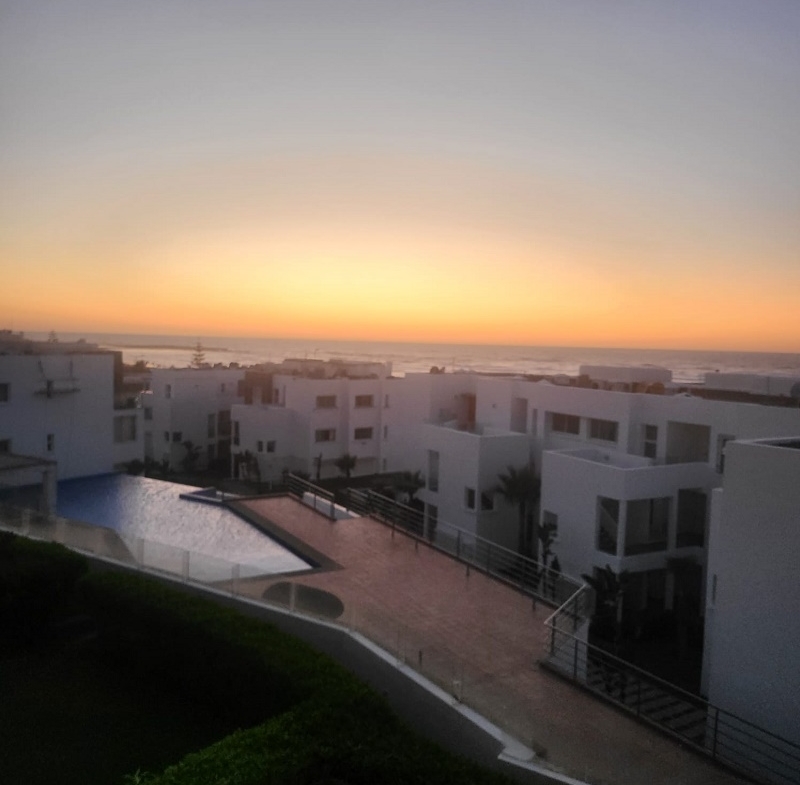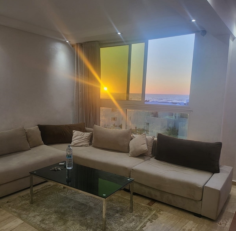 Dar Bouazza-Location-Appartement-Meublé-Front Mer, dans une résidence sécurisée avec espace vert et piscines, cet appartement a une vue imprenable sur mer, proche de toutes les commodités et plages privées, se trouvant au premier étage , comprenant un salon européen, une cuisine entièrement équipée, deux chambres avec placards, salle de bain avec cabine douche, et une place au parking