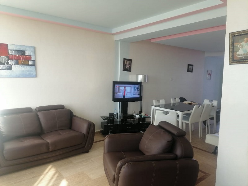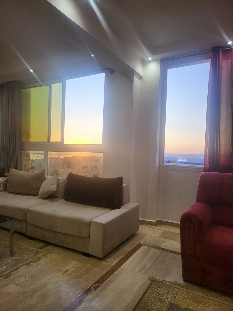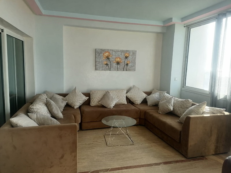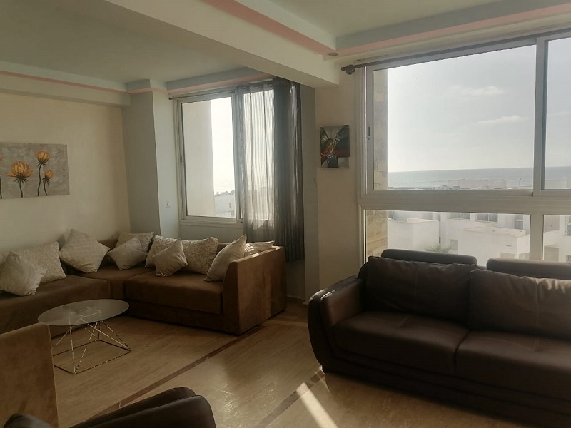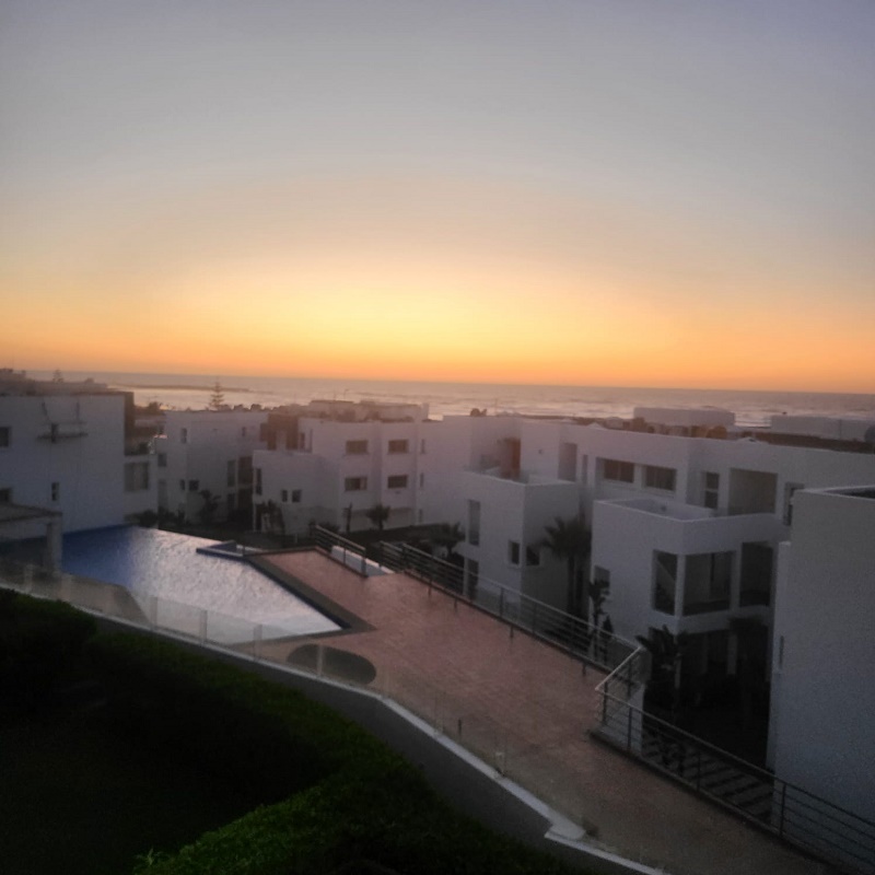 Dar Bouazza-Location-Appartement-Meublé-Front Mer, dans une résidence sécurisée avec espace vert et piscines, cet appartement a une vue imprenable sur mer, proche de toutes les commodités et plages privées, se trouvant au premier étage , comprenant un salon européen, une cuisine entièrement équipée, deux chambres avec placards, salle de bain avec cabine douche, et une place au parking