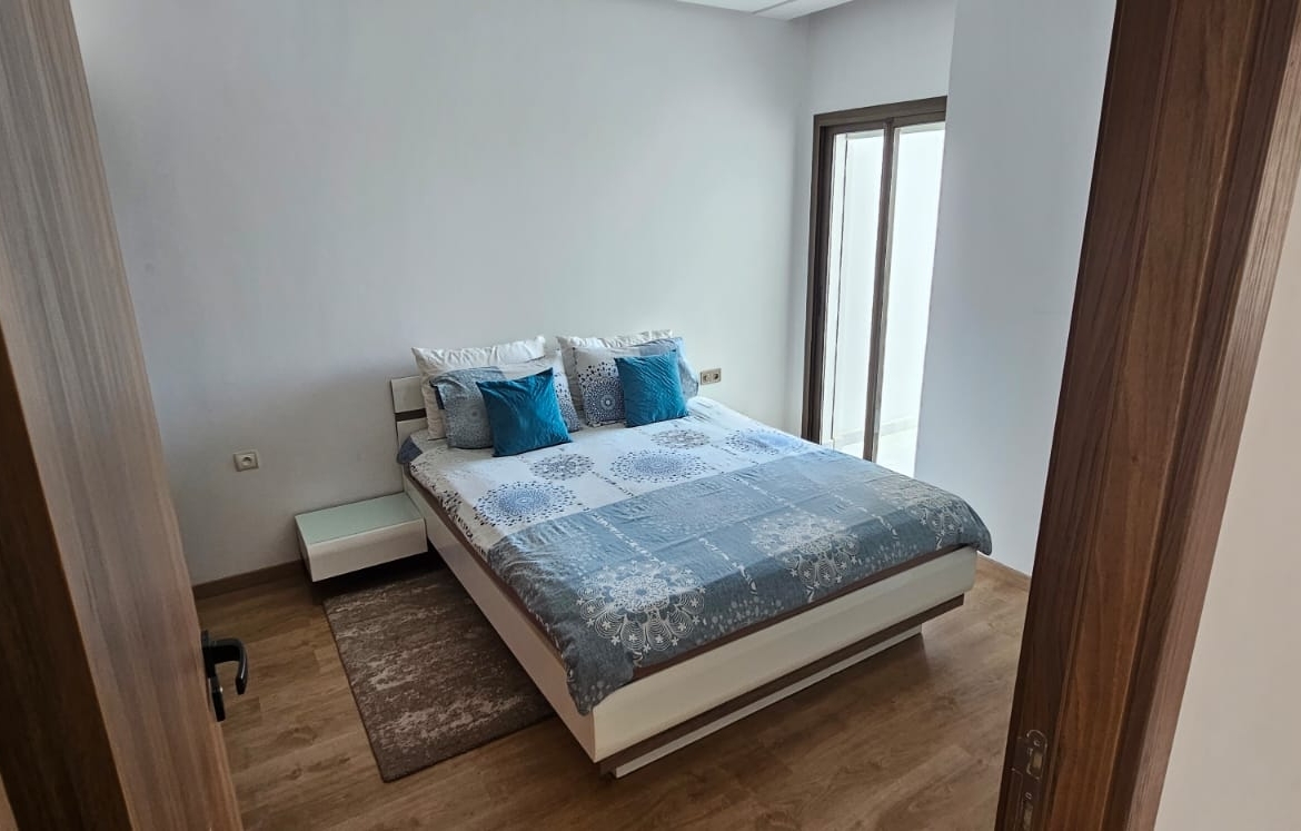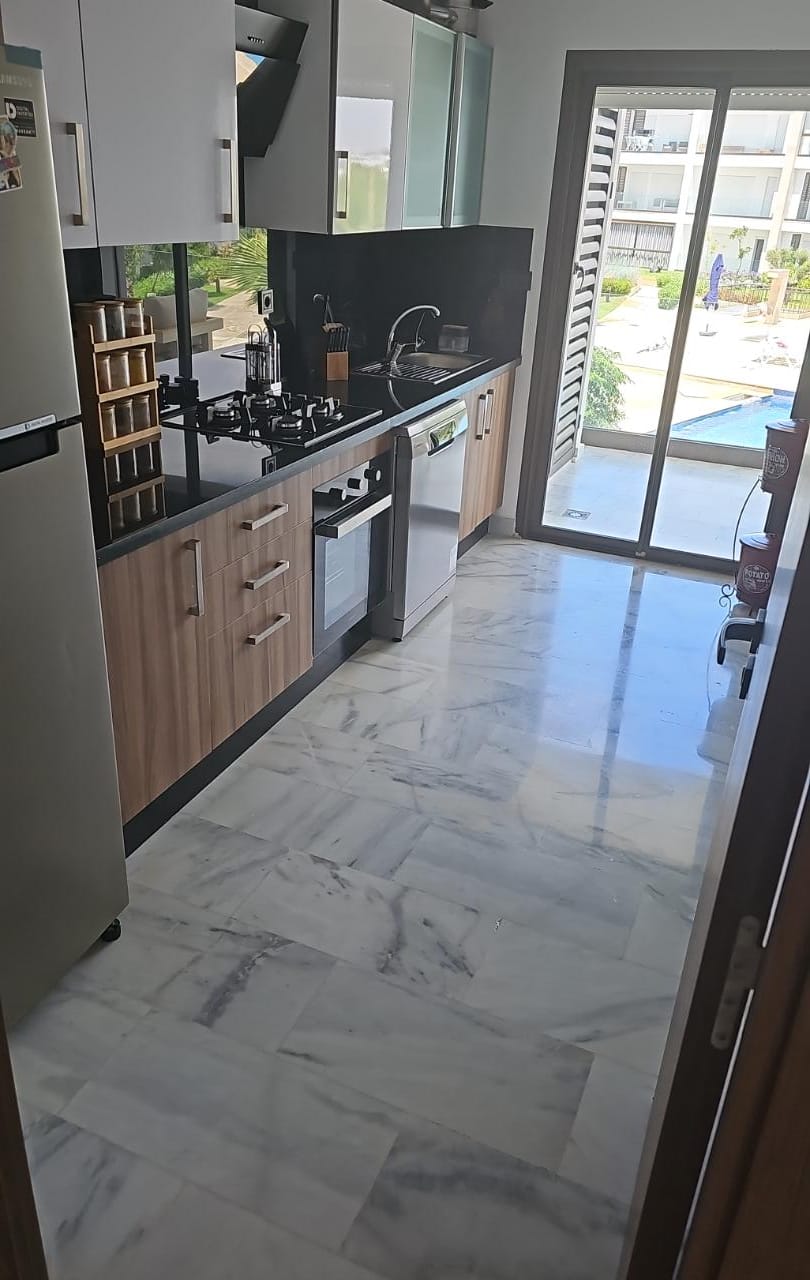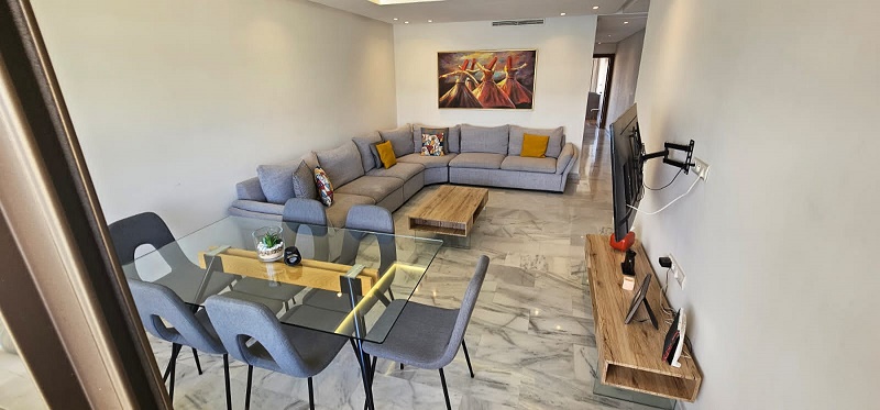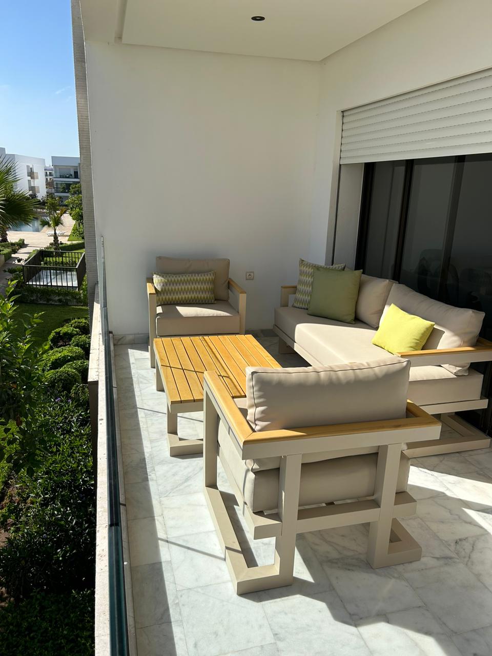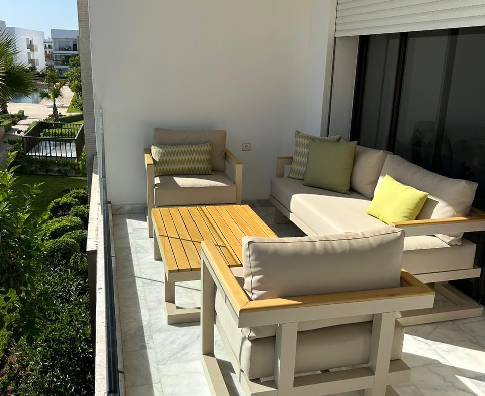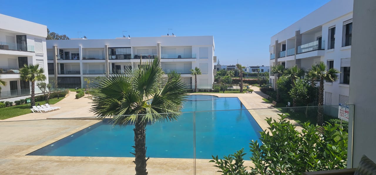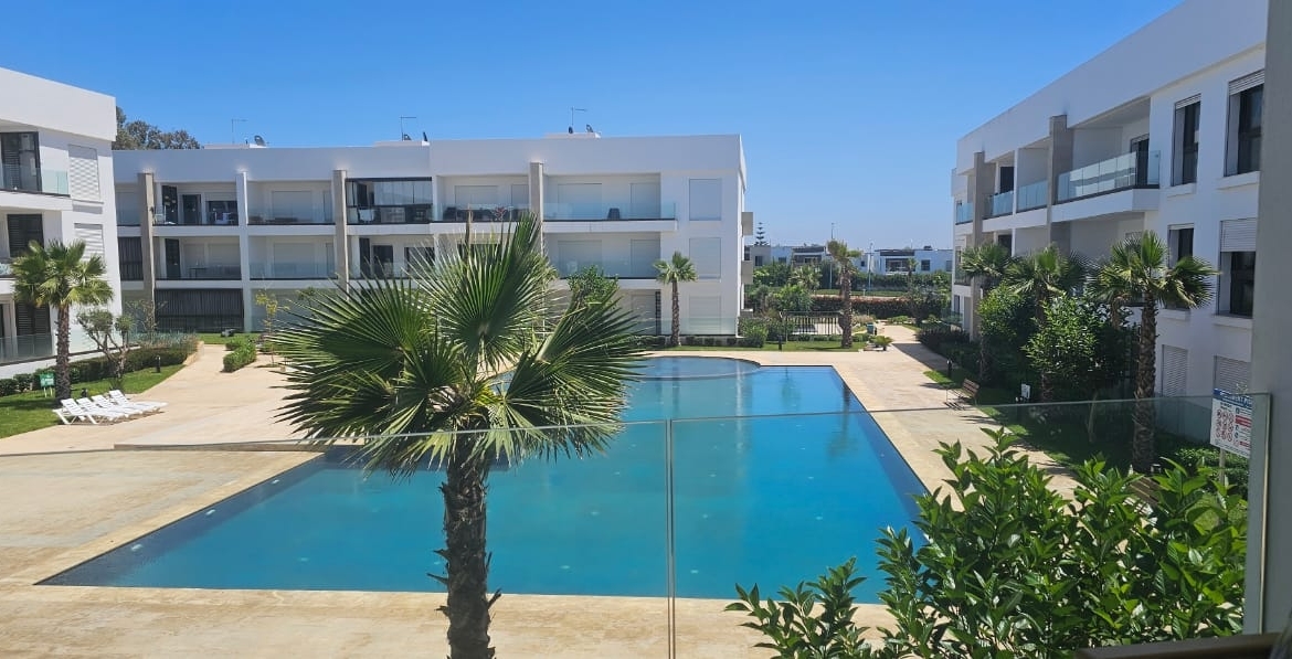 Dar Bouazza-Location-Appartement-Meublé-Piscine-2CH, résidence sécurisée avec espace vert et piscine, comprenant un double salon donnant sur la terrasse et vue directe sur la piscine, espace salle à manger, cuisine entièrement équipée, une chambre parentale dont placards et salle de bain avec douche à l’italienne , une autre chambre avec placards, salle de bain avec cabine douche, et place au parking