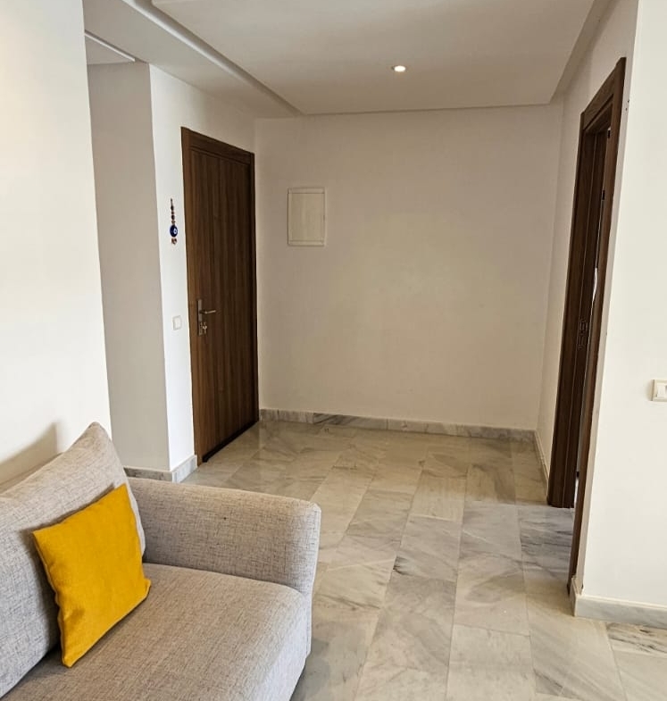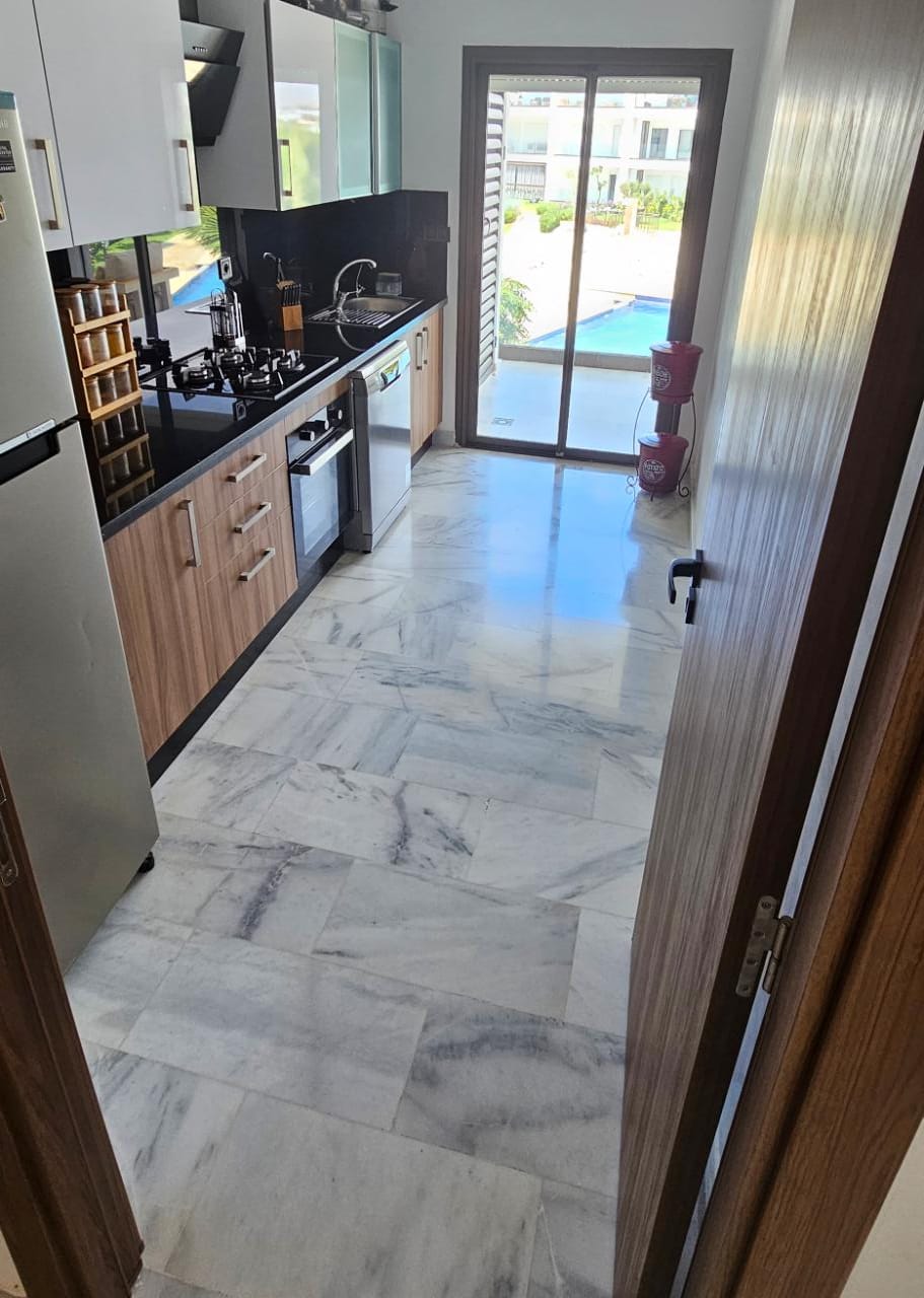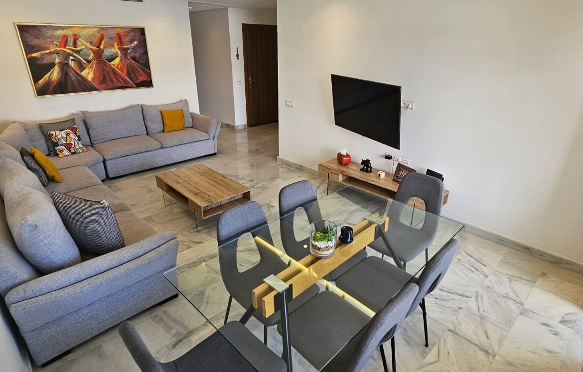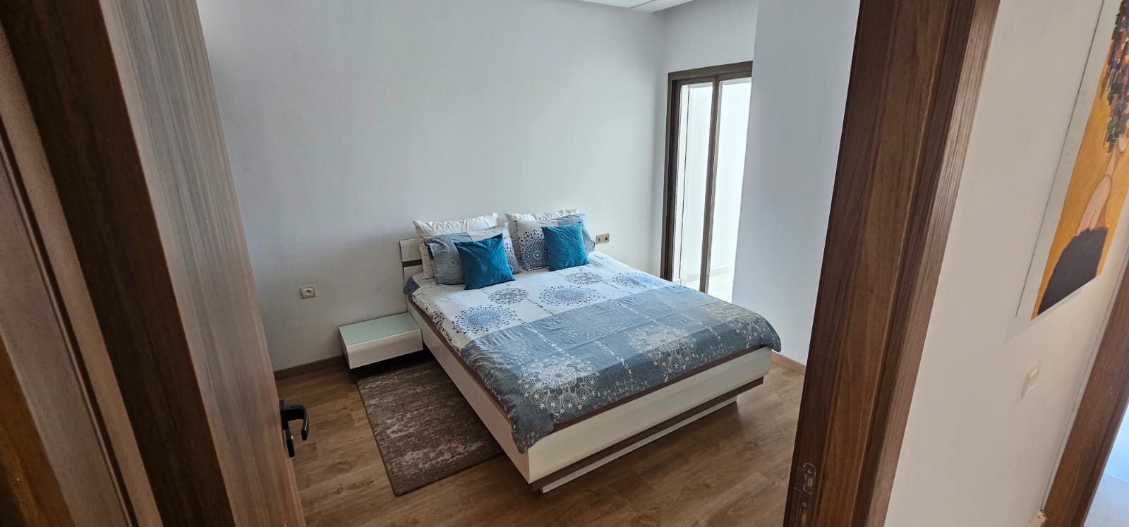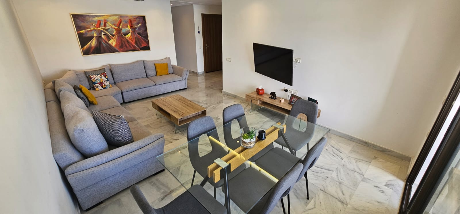 Dar Bouazza-Location-Appartement-Meublé-Piscine-2CH, résidence sécurisée avec espace vert et piscine, comprenant un double salon donnant sur la terrasse et vue directe sur la piscine, espace salle à manger, cuisine entièrement équipée, une chambre parentale dont placards et salle de bain avec douche à l’italienne , une autre chambre avec placards, salle de bain avec cabine douche, et place au parking