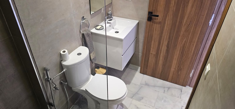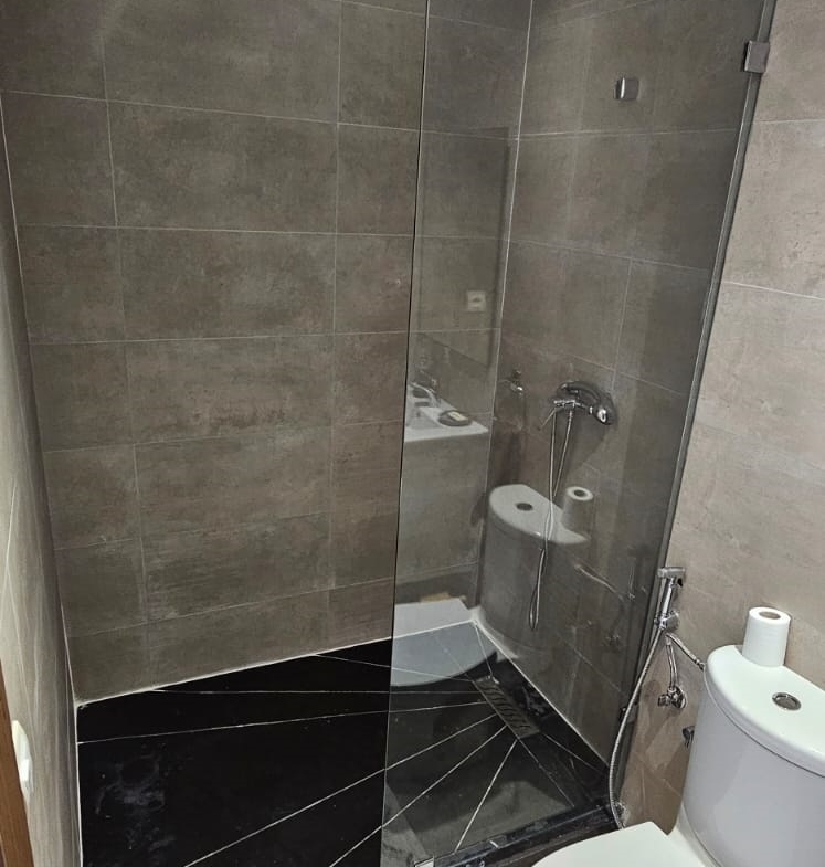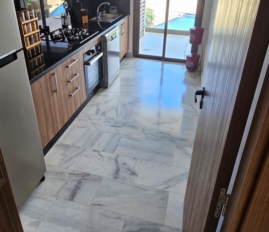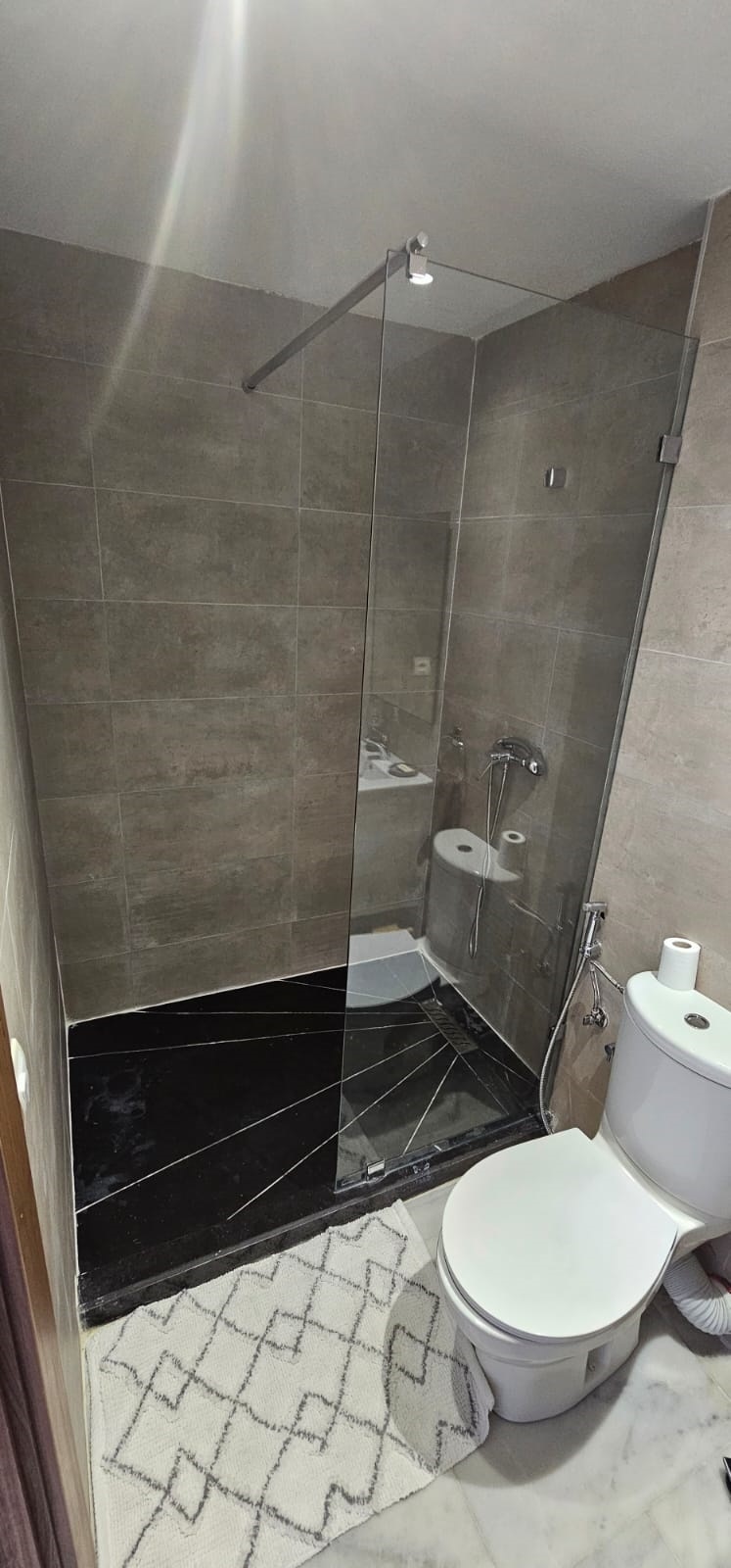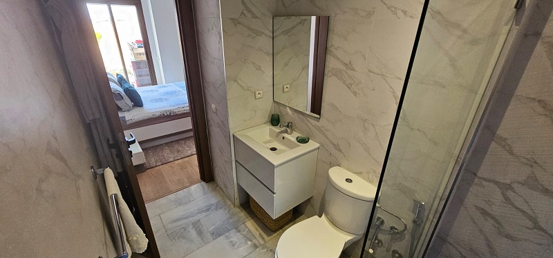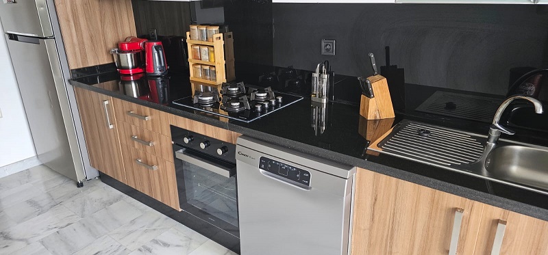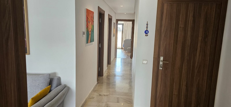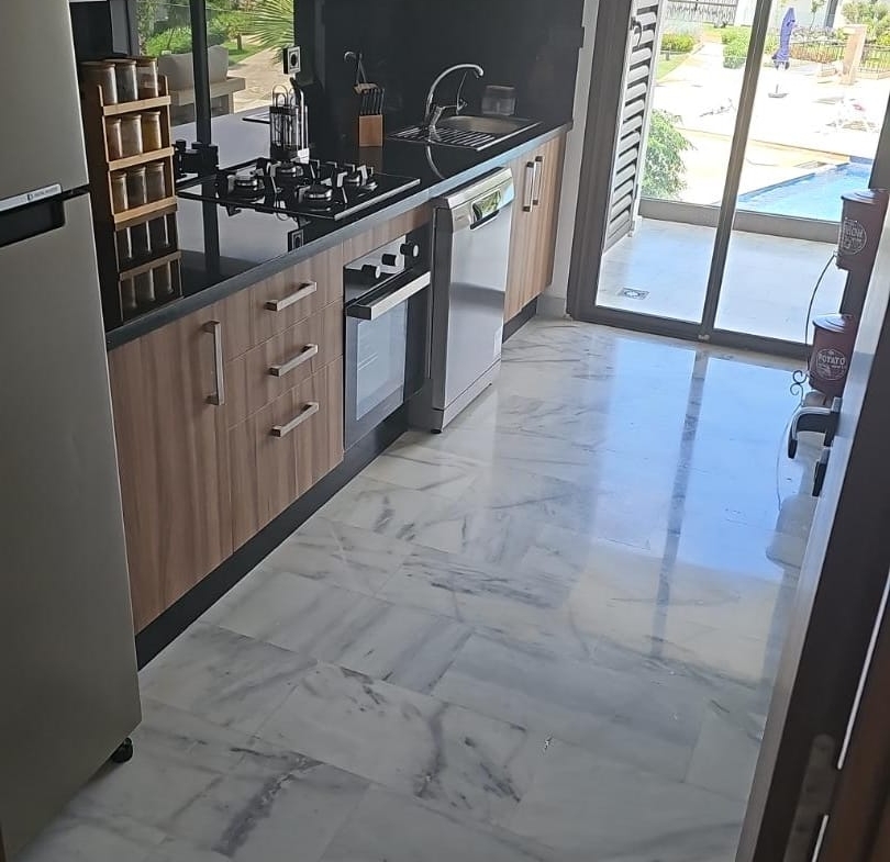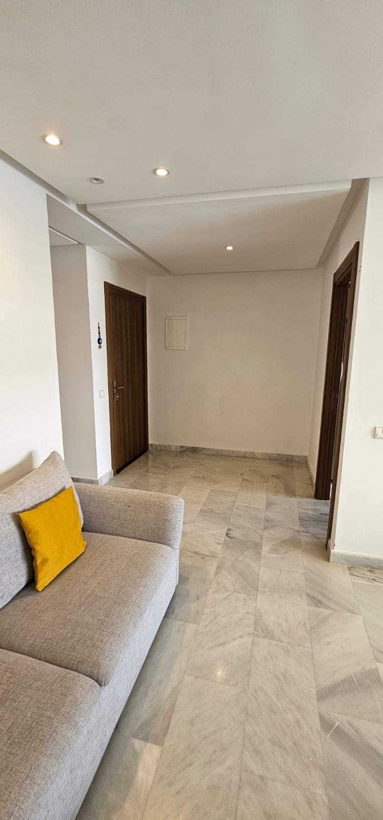 Dar Bouazza-Location-Appartement-Meublé-Piscine-2CH, résidence sécurisée avec espace vert et piscine, comprenant un double salon donnant sur la terrasse et vue directe sur la piscine, espace salle à manger, cuisine entièrement équipée, une chambre parentale dont placards et salle de bain avec douche à l’italienne , une autre chambre avec placards, salle de bain avec cabine douche, et place au parking