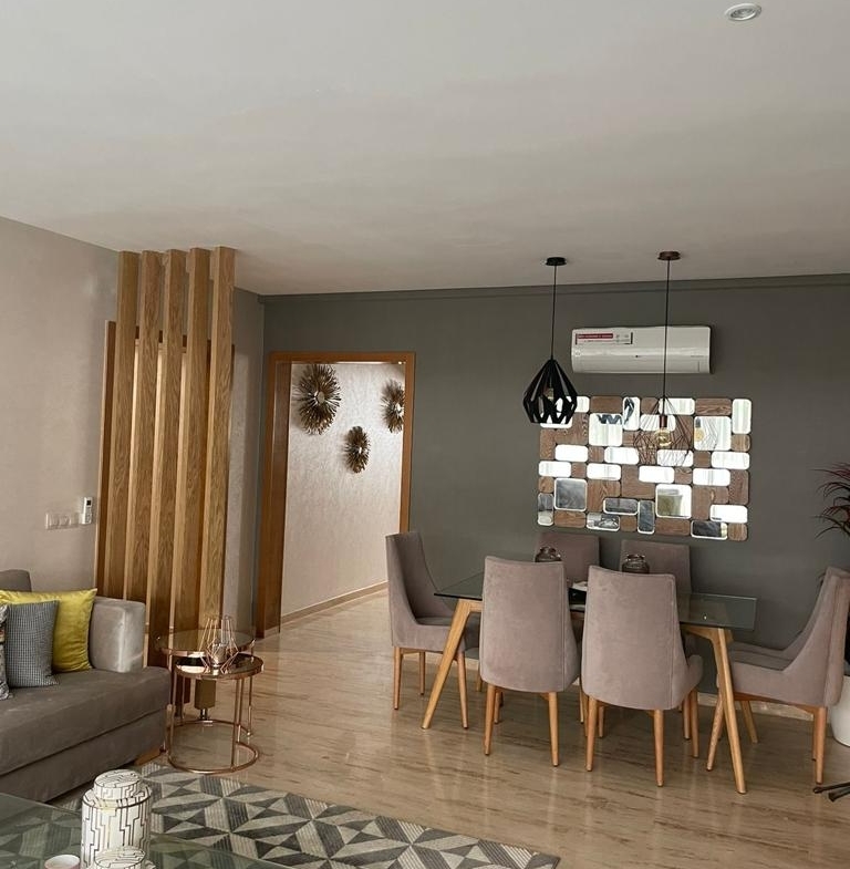 Dar Bouazza-Location-Appartement-RDJ-Meublé, d’une superficie de 134m², avec espace jardin dans une résidence sécurisée, proche de toutes les commodités, l’appartement comprend un Salon européen avec espace salle à manger donnant sur une belle terrasse couverte avec baies vitrées qui peut faire office de séjour, salle d’eau invités, cuisine entièrement équipée, chambre parentale avec placards et salle de bain avec baignoire, une autre chambre à coucher avec placards, salle de bain avec cabine douche, et une place au parking de 12m²