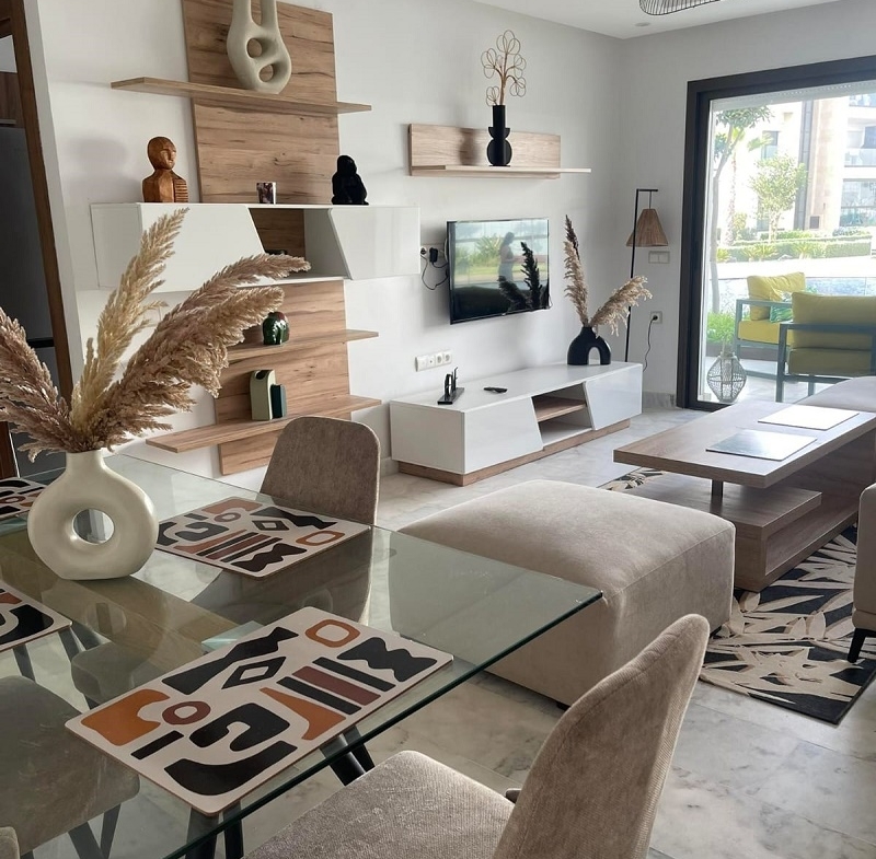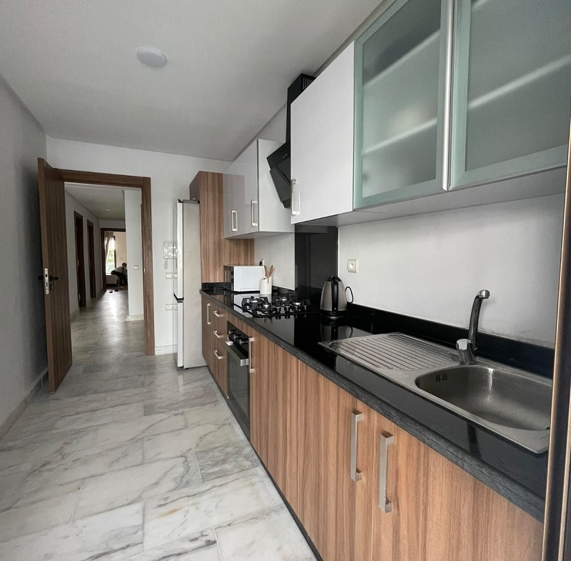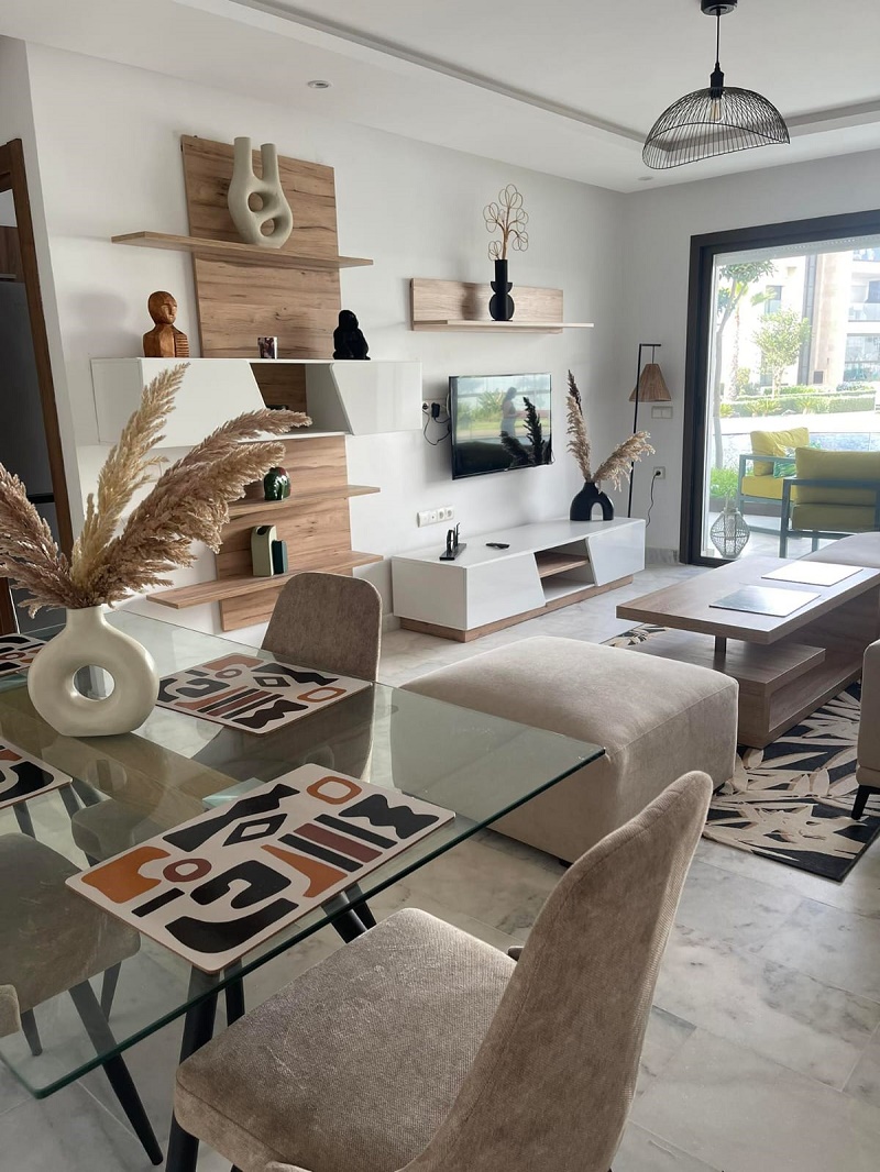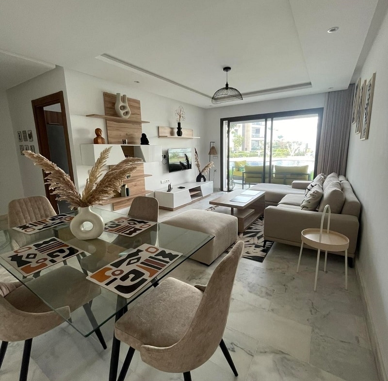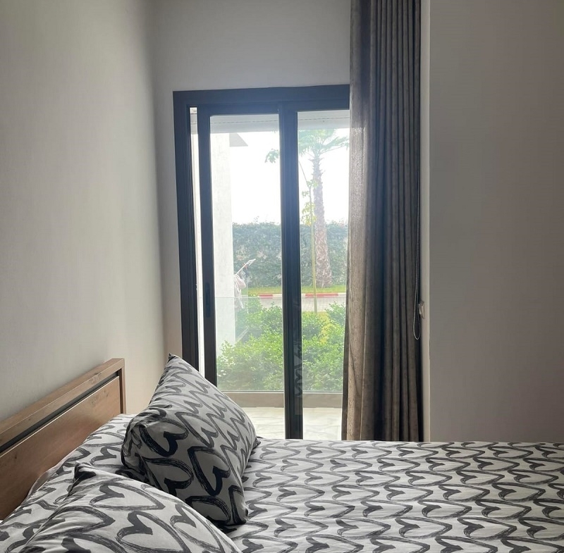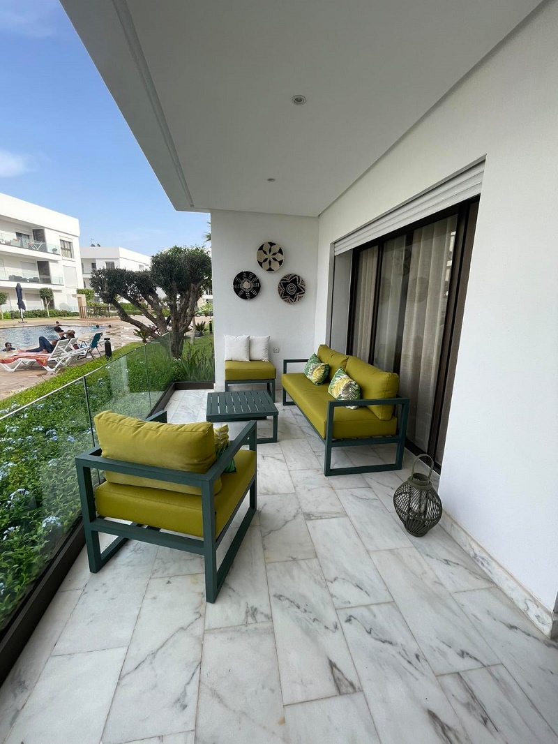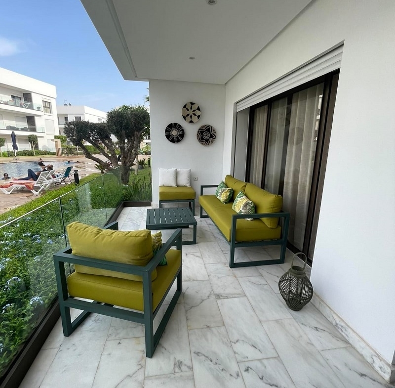 Dar Bouazza-Location-Bel-Appartement-Meublé-RDJ, situé dans une résidence sécurisée, proche des commodités carrefour Dar Bouazza, d’une superficie de 120m dont 15m de terrasse se trouvant en rez-de-jardin, comprenant un double salon européen avec espace salle à manger (table et chaises) donnant sur une terrasse avec salon jardin et vue sur la piscine de la résidence, une cuisine entièrement équipée, une chambre parentale avec grand lit dont placards et salle de bain avec douche à l’italienne, une autre chambre avec placards, salle de bain avec cabine douche, et place au parking titrée