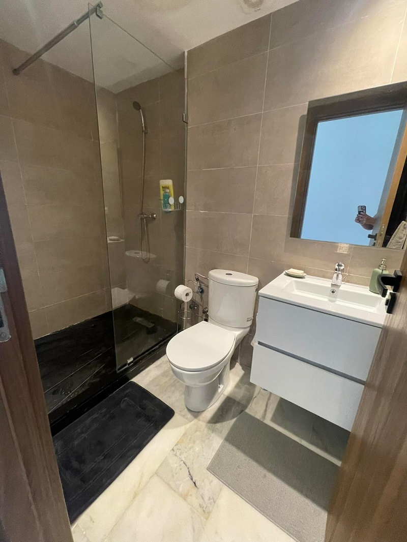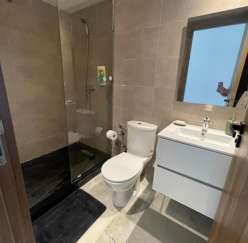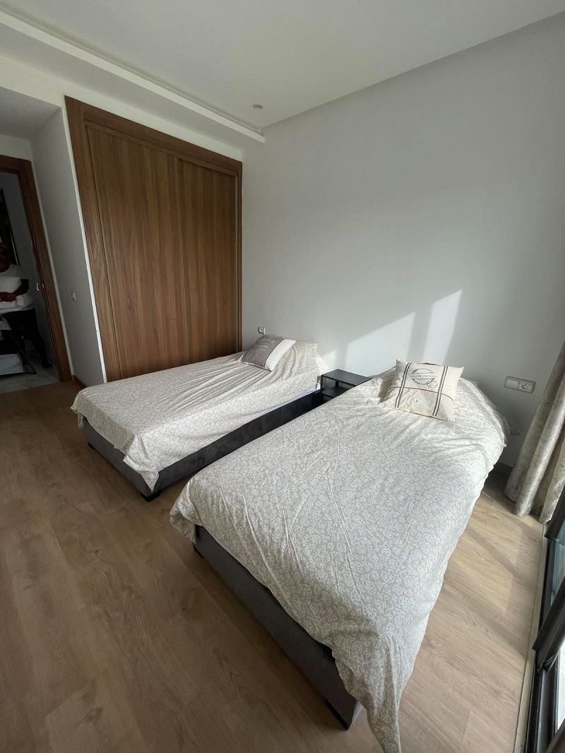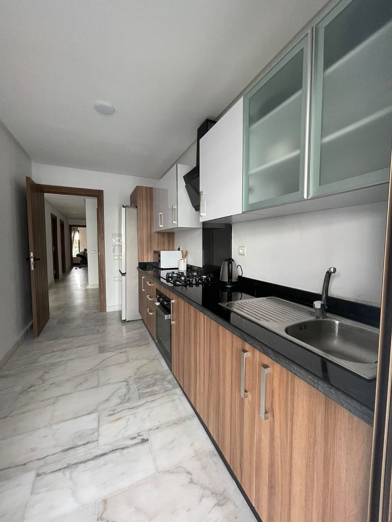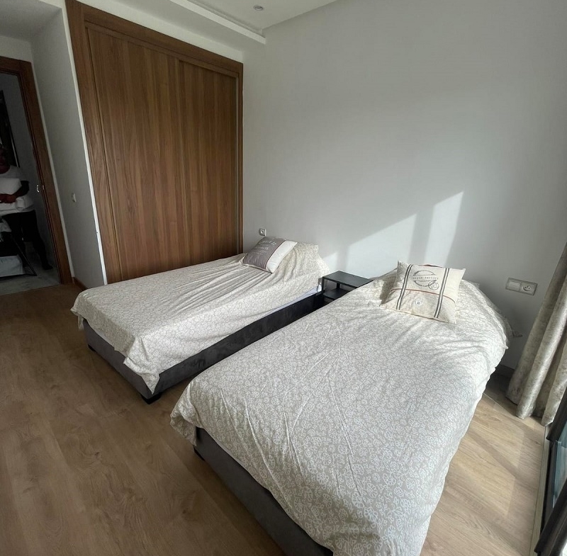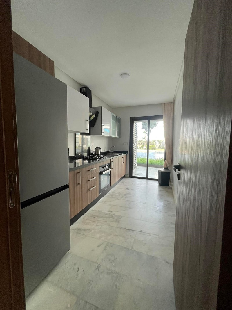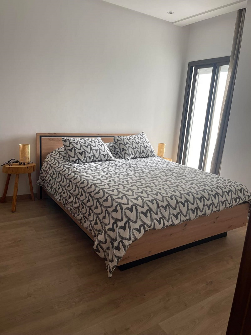 Dar Bouazza-Location-Bel-Appartement-Meublé-RDJ, situé dans une résidence sécurisée, proche des commodités carrefour Dar Bouazza, d’une superficie de 120m dont 15m de terrasse se trouvant en rez-de-jardin, comprenant un double salon européen avec espace salle à manger (table et chaises) donnant sur une terrasse avec salon jardin et vue sur la piscine de la résidence, une cuisine entièrement équipée, une chambre parentale avec grand lit dont placards et salle de bain avec douche à l’italienne, une autre chambre avec placards, salle de bain avec cabine douche, et place au parking titrée