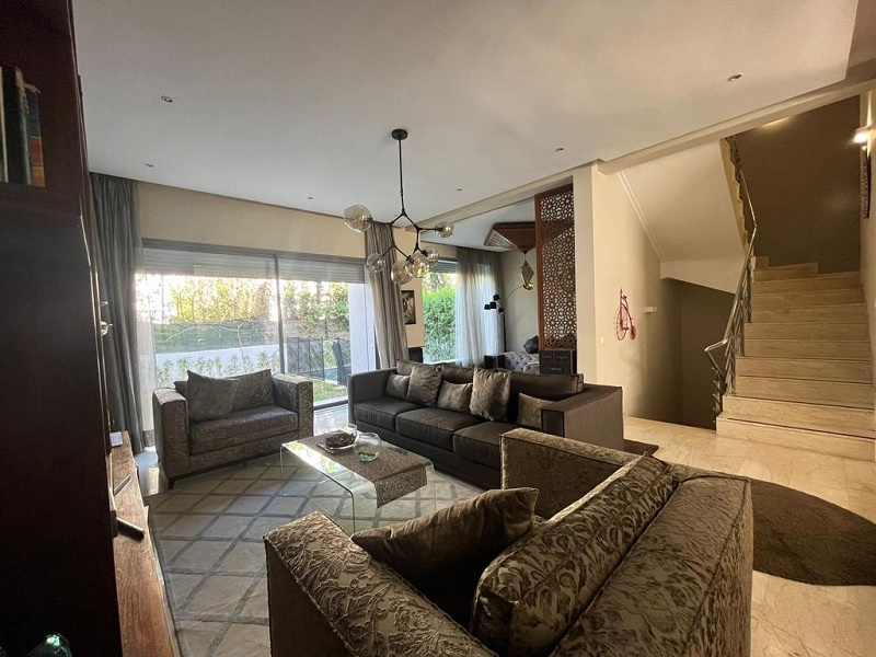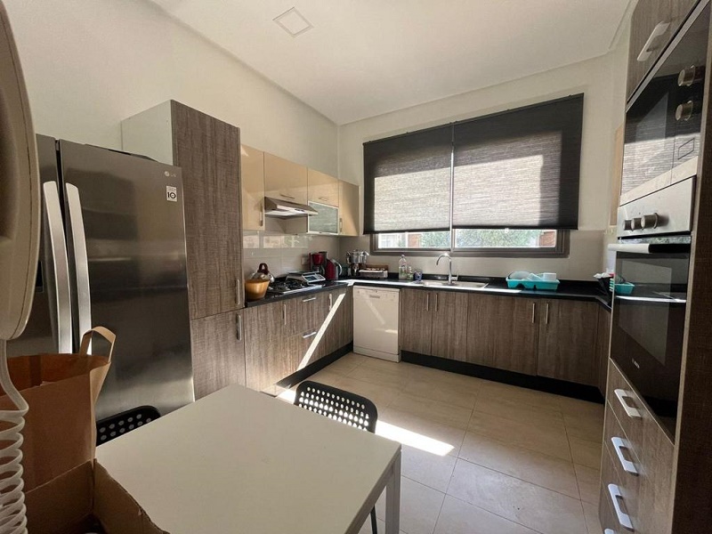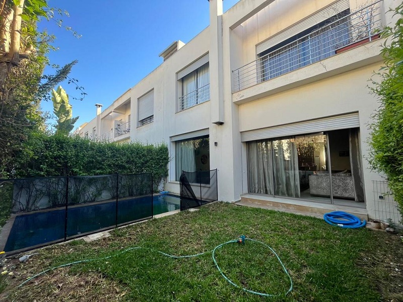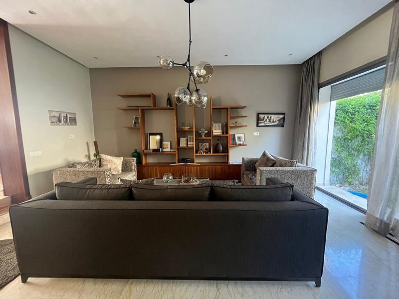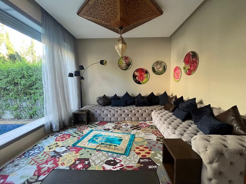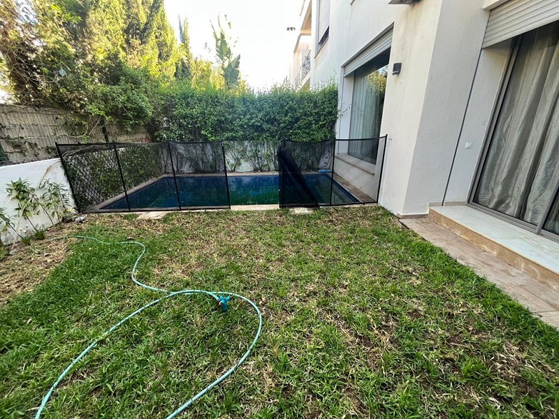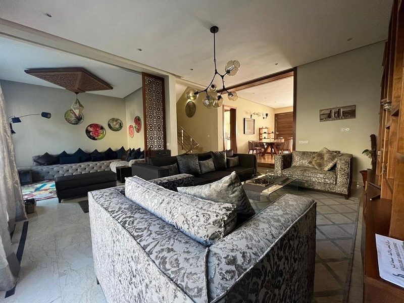 Dar Bouazza-Location-Villa-Meublée-3CH-Piscine, sise dans une résidence sécurisée, d’ une superficie de terrain de 300m et de 360m construite sur trois niveaux répartit comme suit :