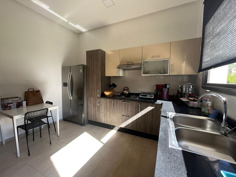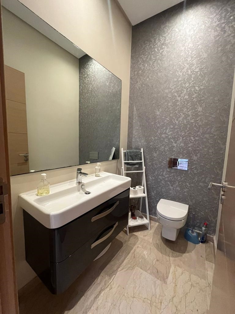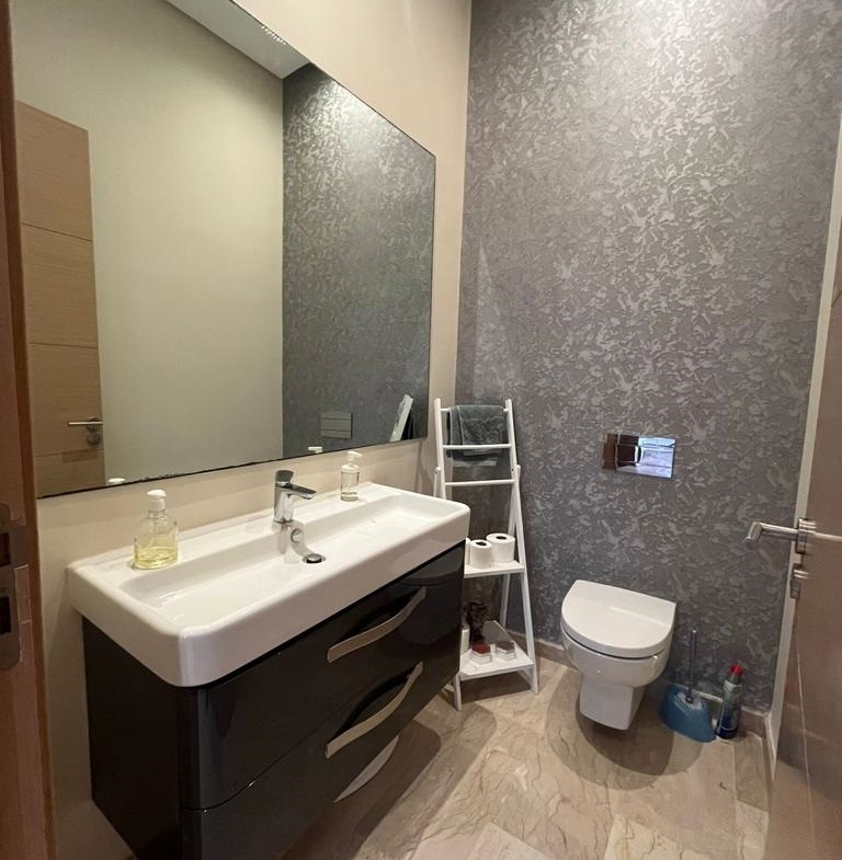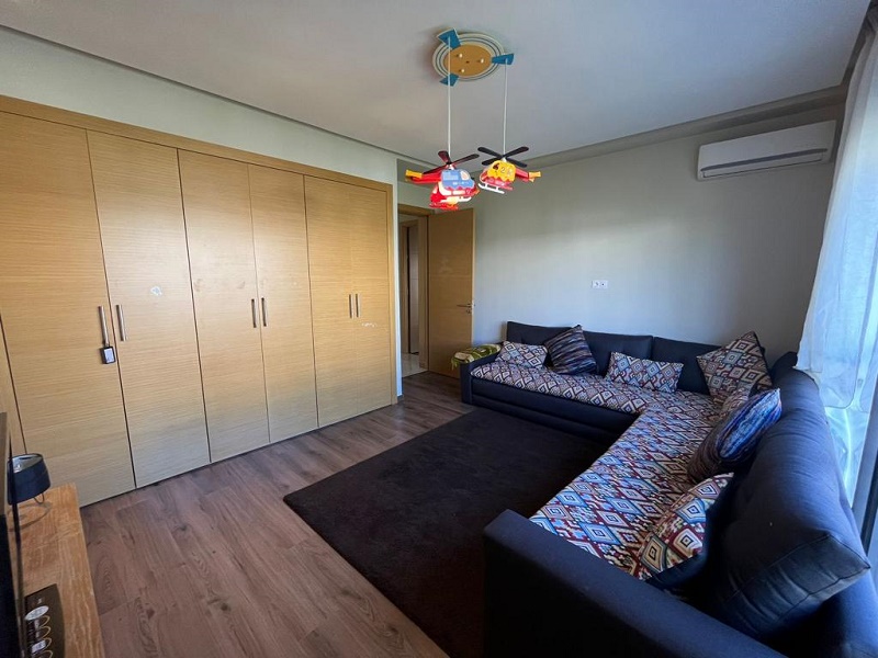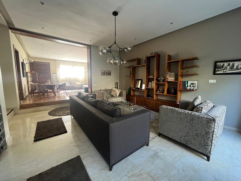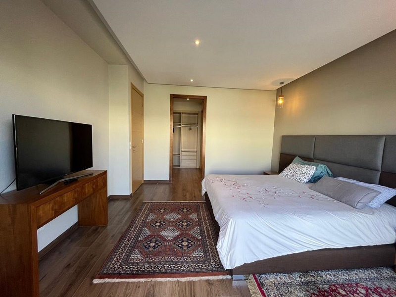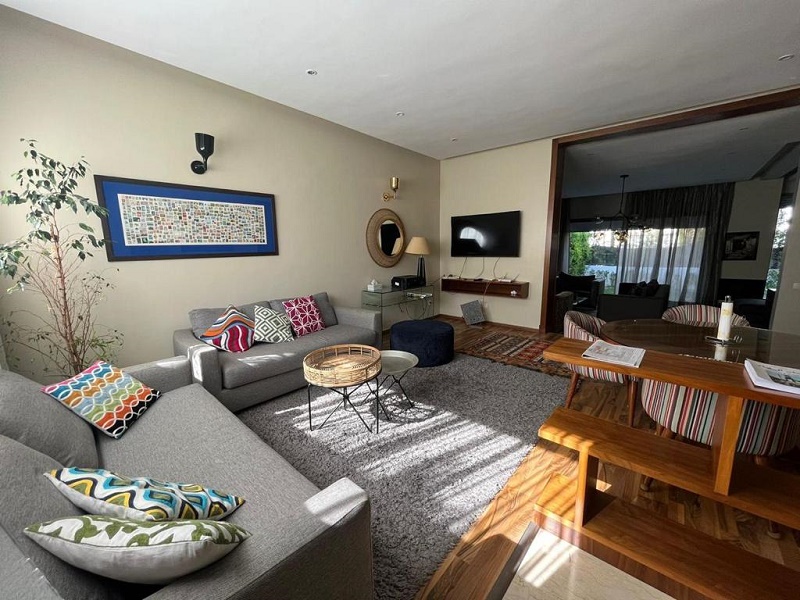 Dar Bouazza-Location-Villa-Meublée-3CH-Piscine, sise dans une résidence sécurisée, d’ une superficie de terrain de 300m et de 360m construite sur trois niveaux répartit comme suit :
