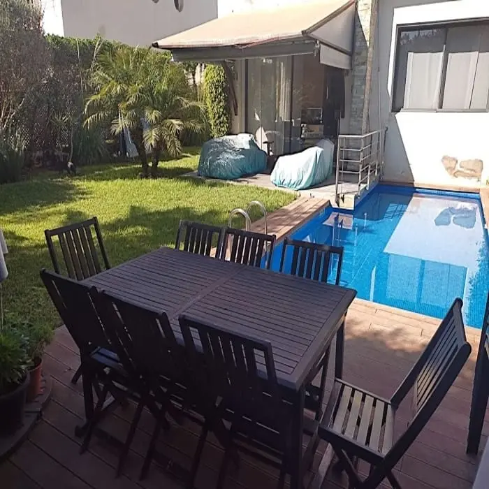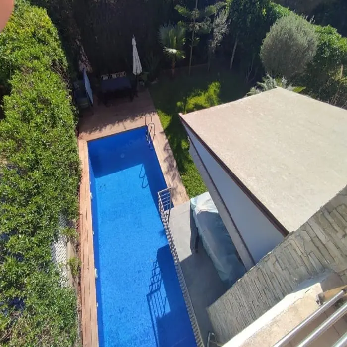 Dar Bouazza-Vente-Belle-Villa-Avec-Piscine, proche de toutes les commodités, située dans une résidence sécurisée et bien entretenue d’une superficie de terrain de 400m², construit 260m² sur deux niveaux, orientée sud, un véritable bijou immobilier.