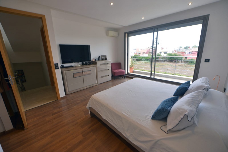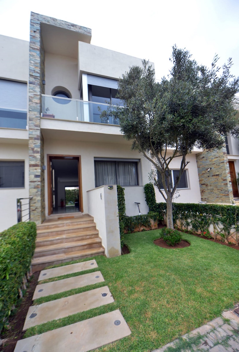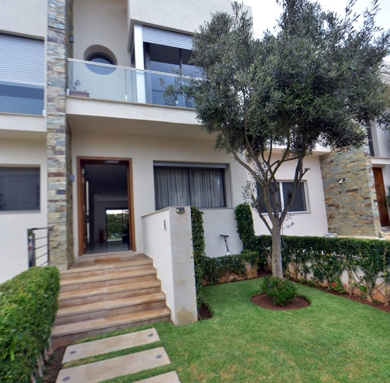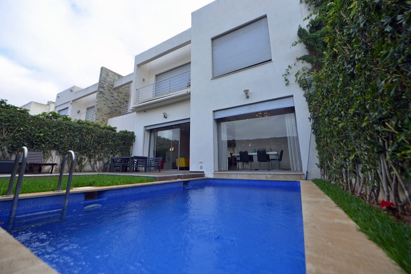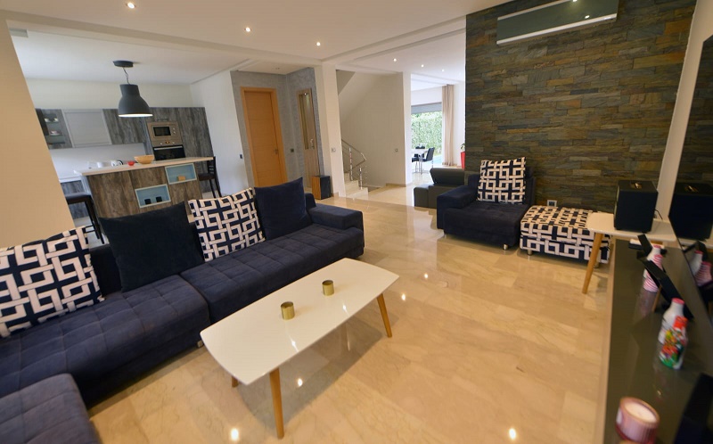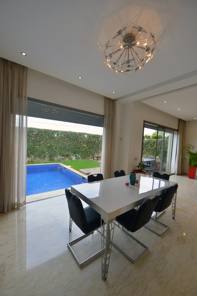 Dar Bouazza-Vente-Villa-En-Résidence-Piscine, sise dans une résidence sécurisée, La villa est d’une superficie habitable de 318m² sur trois niveaux, édifié sur un terrain d’une superficie de 224m² comprenant :