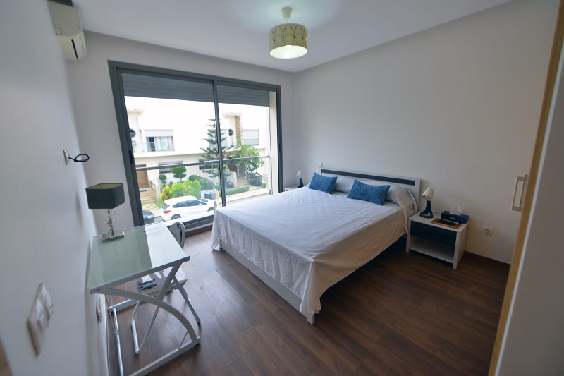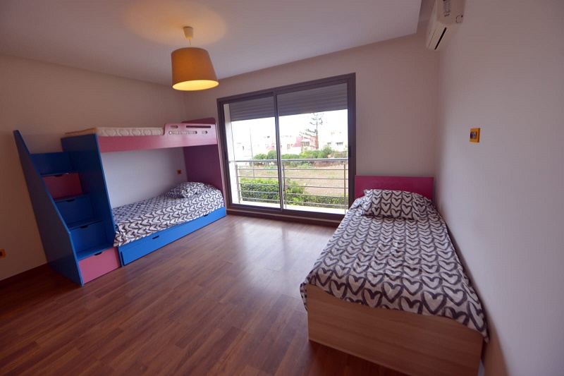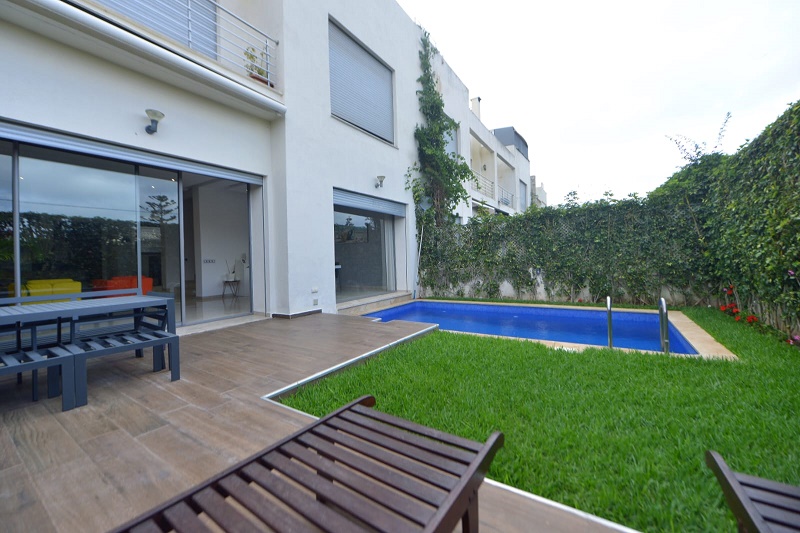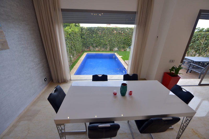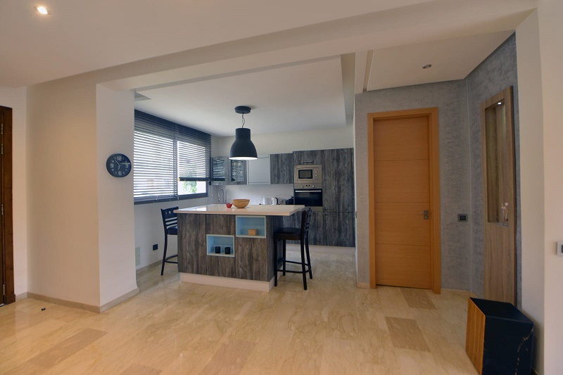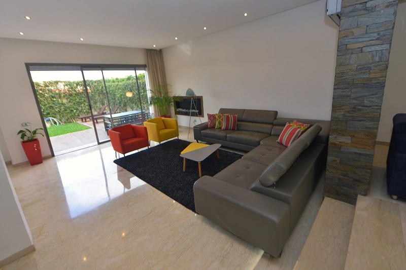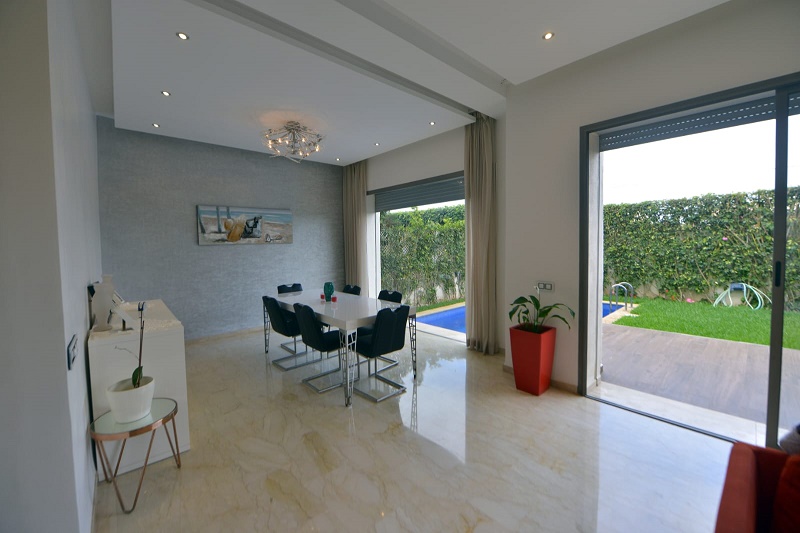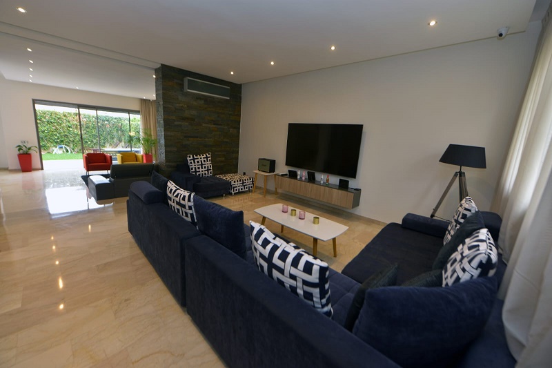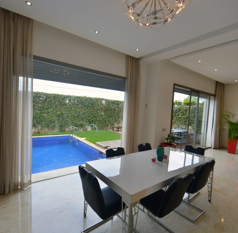 Dar Bouazza-Vente-Villa-En-Résidence-Piscine, sise dans une résidence sécurisée, La villa est d’une superficie habitable de 318m² sur trois niveaux, édifié sur un terrain d’une superficie de 224m² comprenant :