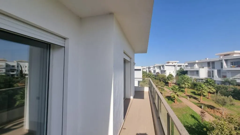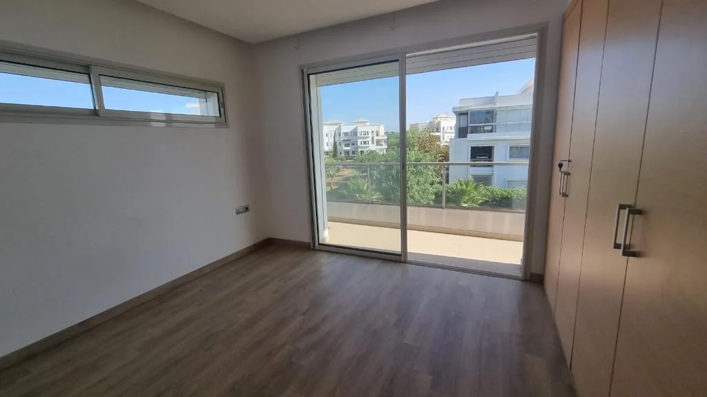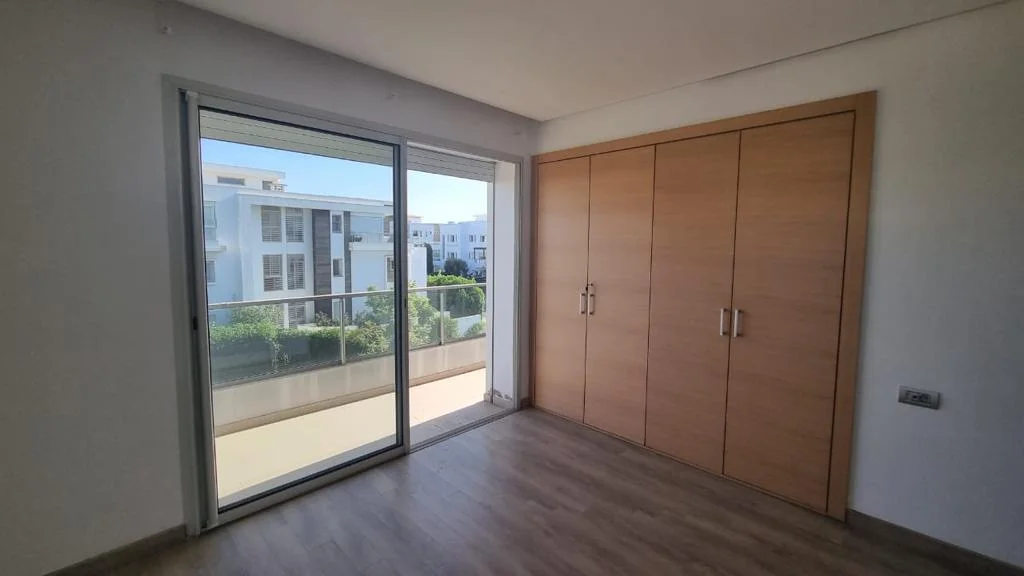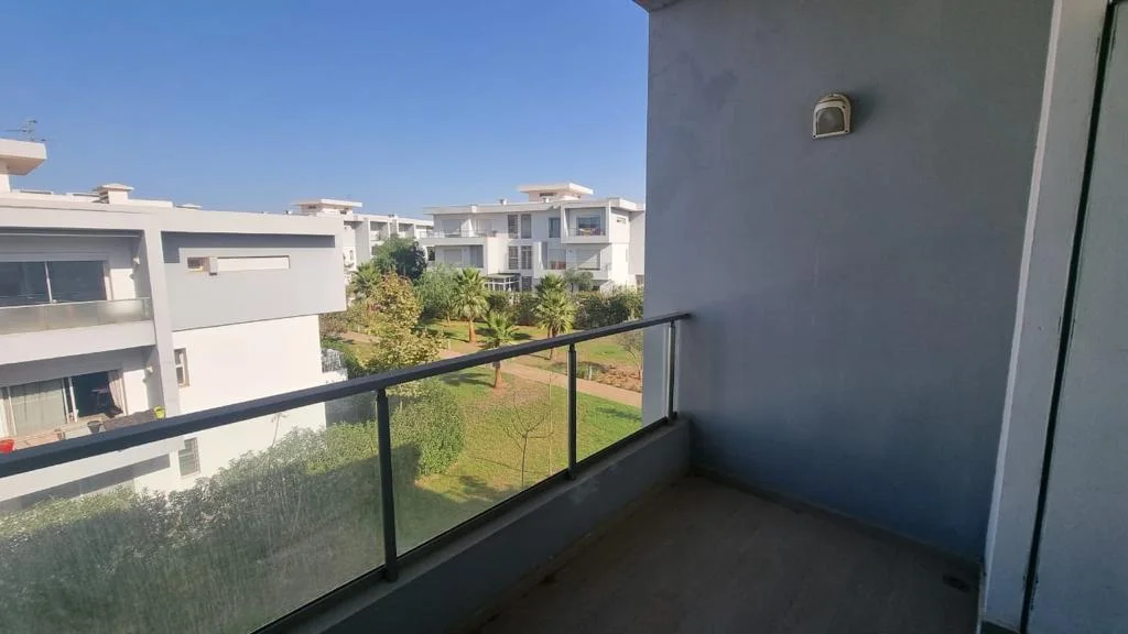 Immobilier-Bouskoura-Location-Appartement-ville-verte, cet appartement est d’une superficie de 110m², se trouvant au deuxième étage, sur Bouskoura, résidence sécurisée avec espace vert, appartement avec vue dégagée, comprenant un grand salon donnant sur une petite terrasse, une cuisine équipée, une chambre parentale dont placards et salle de bain avec baignoire, une autre chambre à coucher avec placards, salle de bain avec cabine douche, toutes les chambres donnent sur un grand balcon,