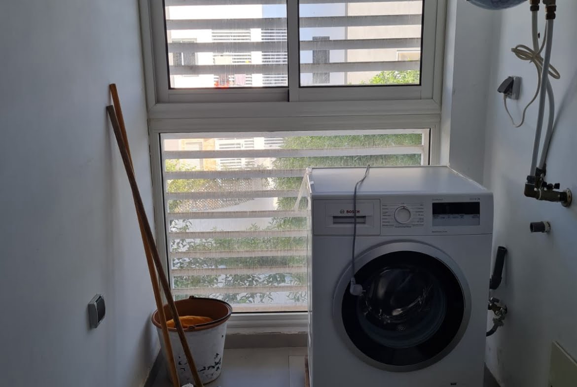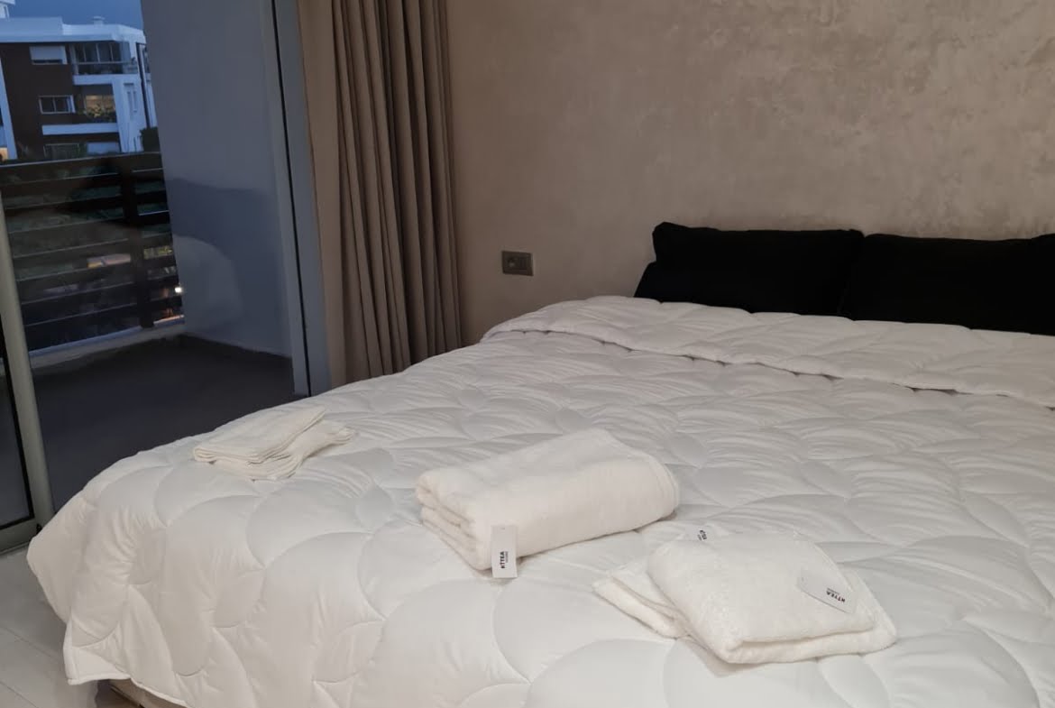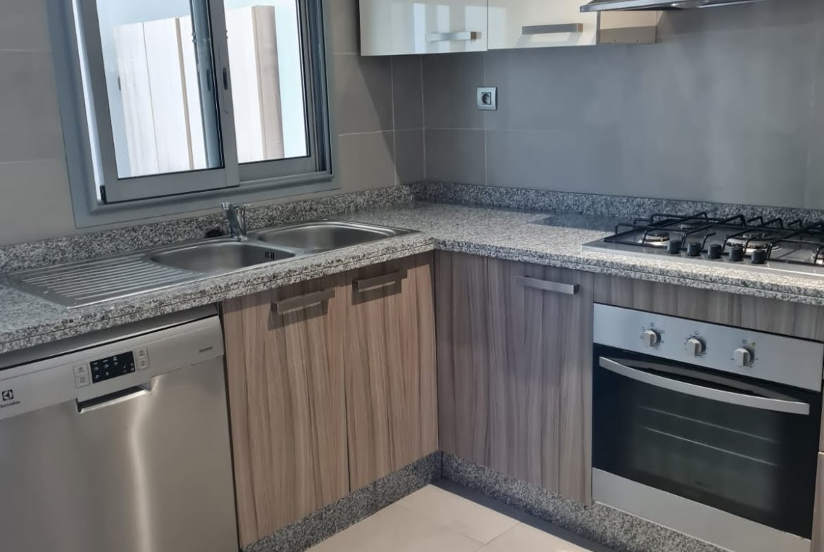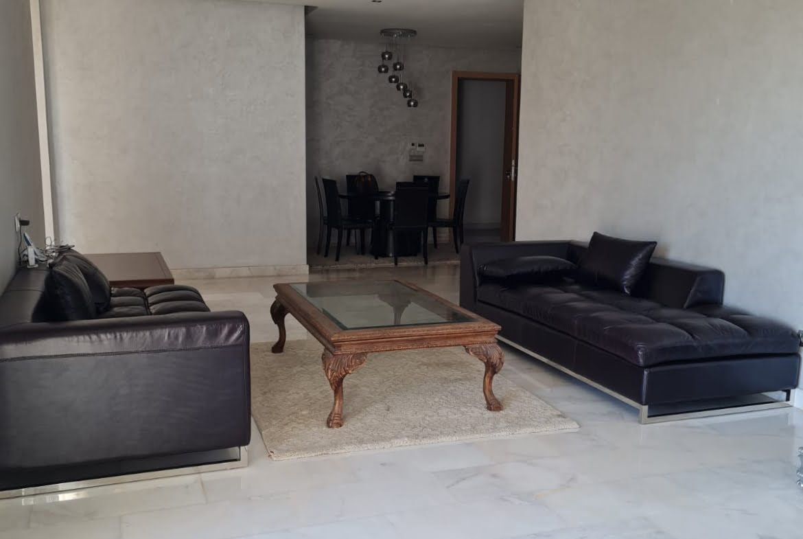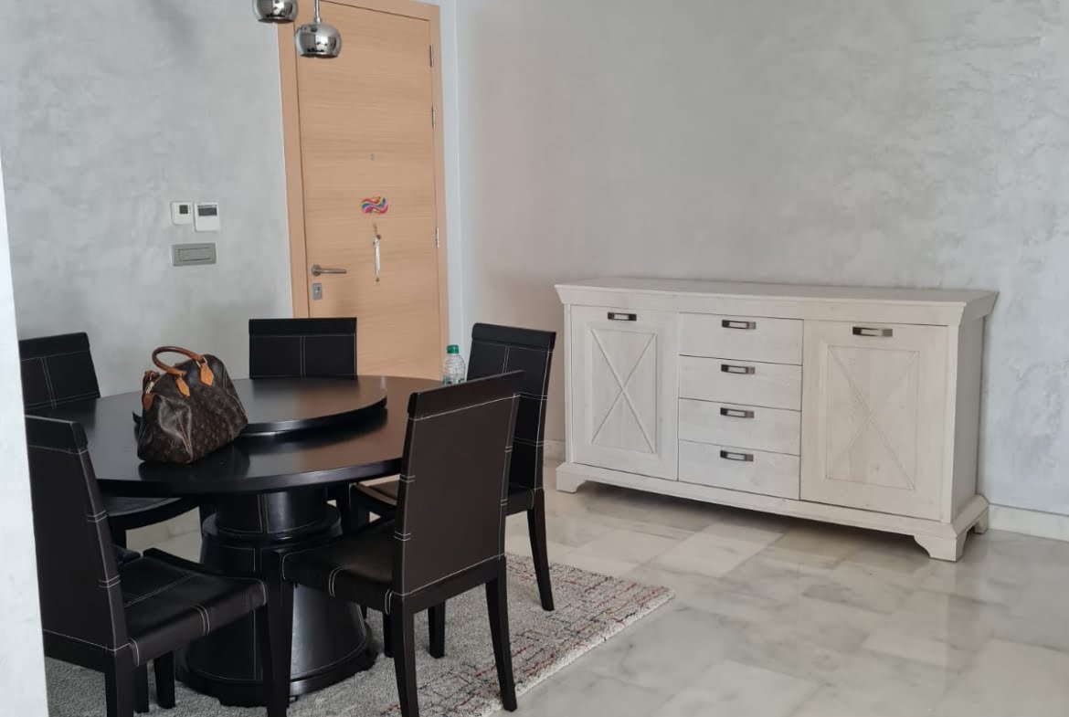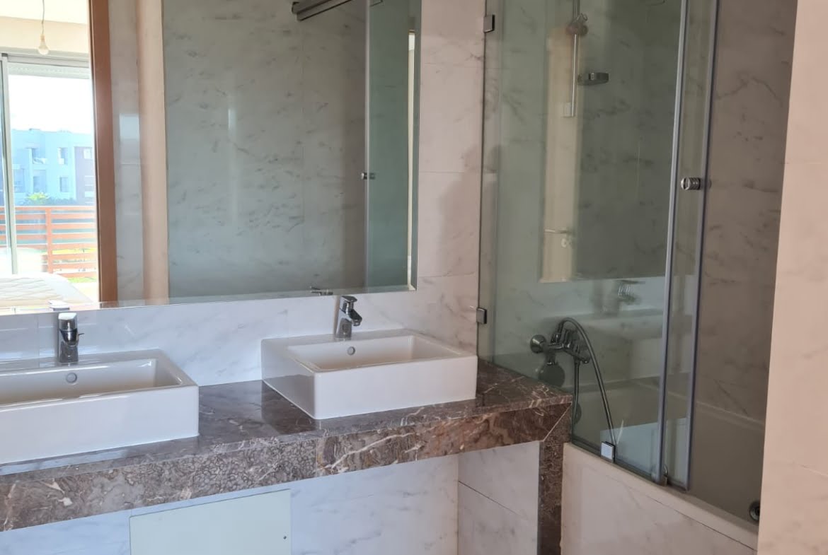 Immobilier-Bouskoura-Location-Bel-Appartement-Meublé-Sur-Ville Verte, d’une superficie totale de 156m², se trouvant au premier étage, avec vue dégagée, dans une résidence calme et sécurisée avec piscine collective, se composant d’un double salon avec coin salle à manger, salle d’eau invités, cuisine entièrement équipée avec coin buanderie, deux chambres pour enfants avec rangements et terrasse, salle de bain avec cabine douche, suite parentale avec terrasse, dressing et salle de bain avec baignoire, deux places au parking