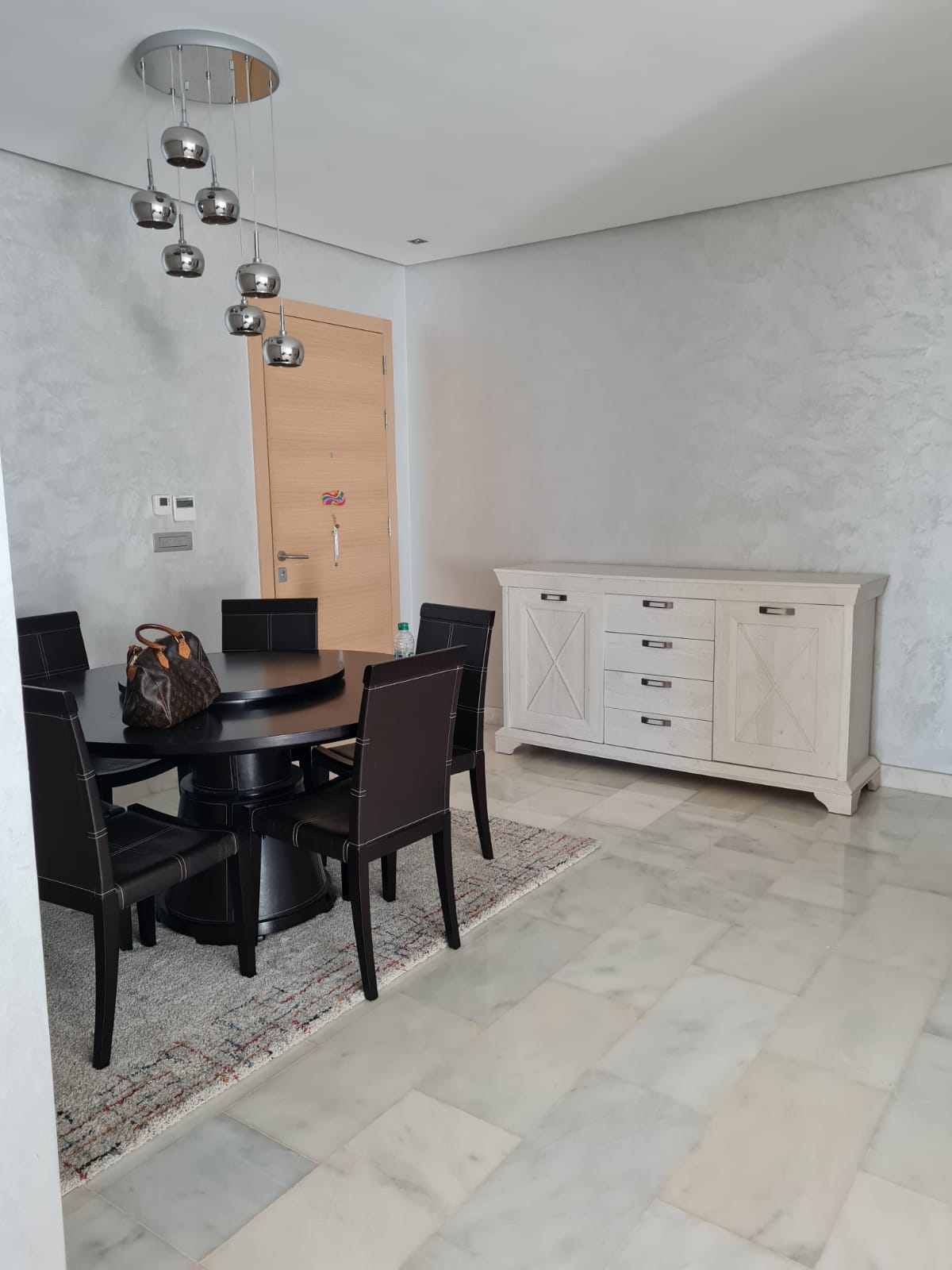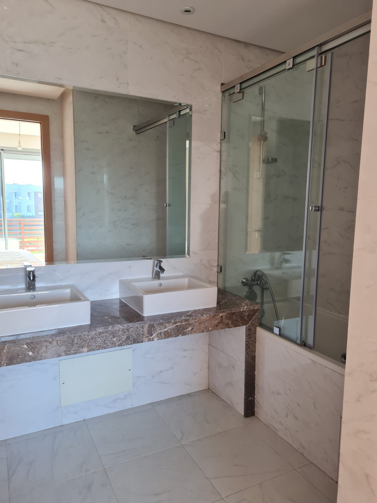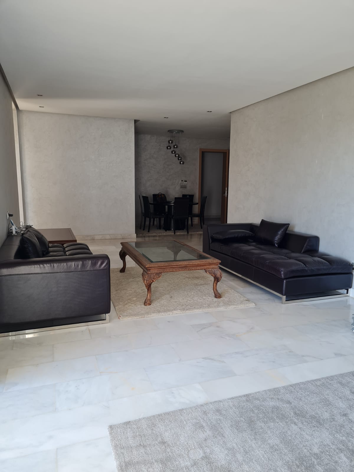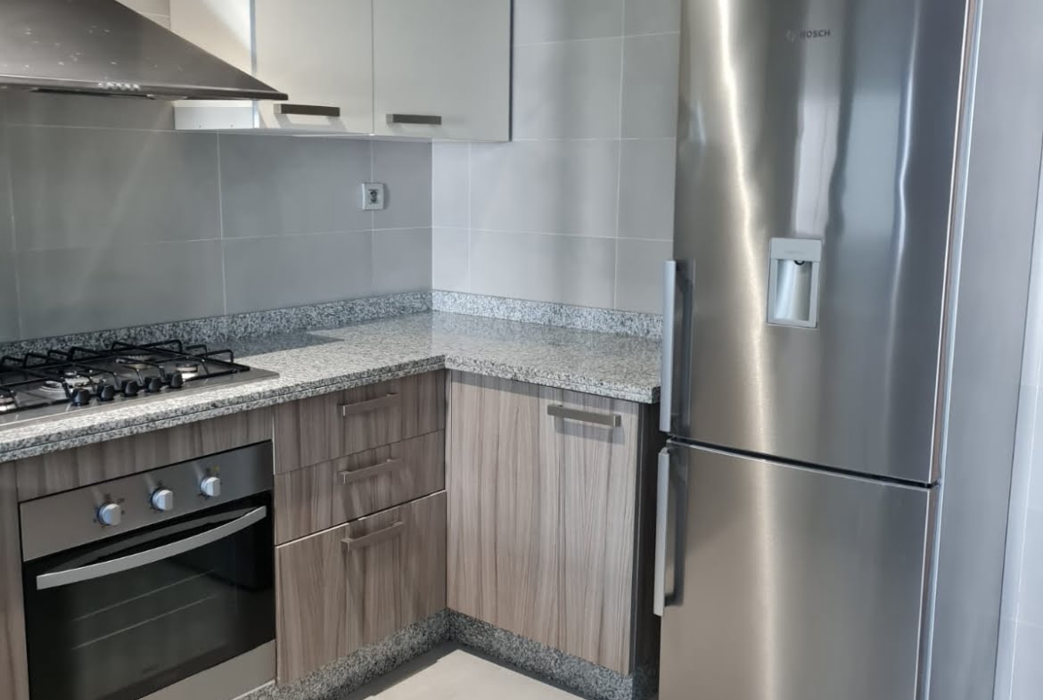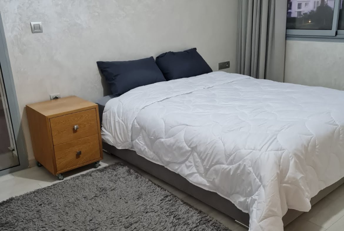 Immobilier-Bouskoura-Location-Bel-Appartement-Meublé-Sur-Ville Verte, d’une superficie totale de 156m², se trouvant au premier étage, avec vue dégagée, dans une résidence calme et sécurisée avec piscine collective, se composant d’un double salon avec coin salle à manger, salle d’eau invités, cuisine entièrement équipée avec coin buanderie, deux chambres pour enfants avec rangements et terrasse, salle de bain avec cabine douche, suite parentale avec terrasse, dressing et salle de bain avec baignoire, deux places au parking