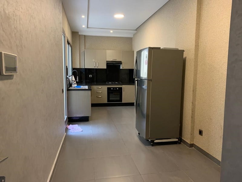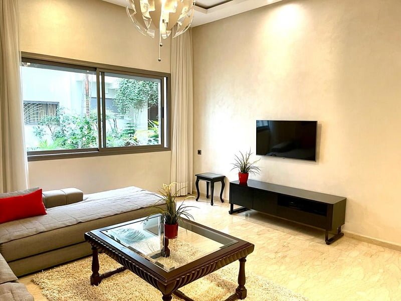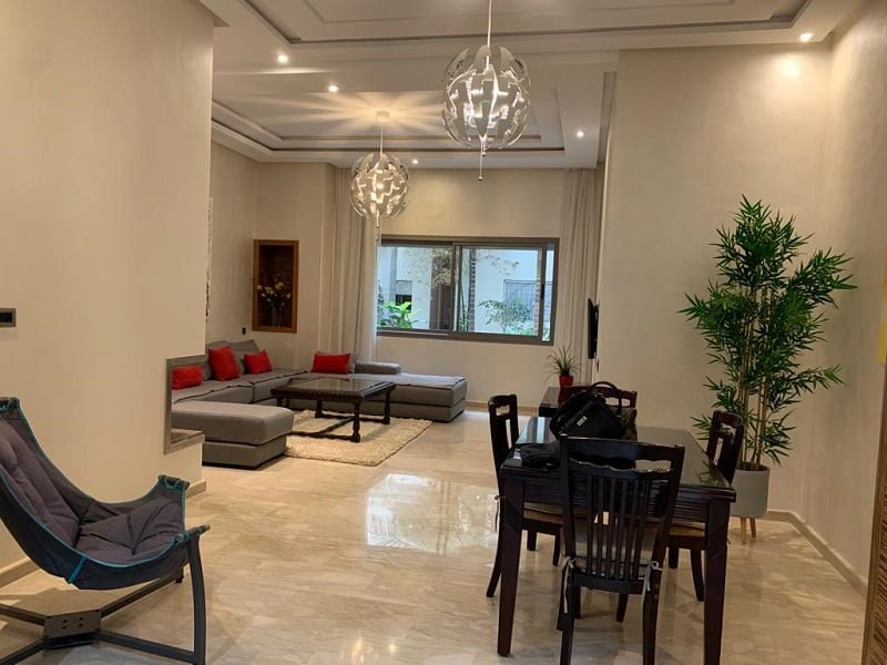 Immobilier-Casablanca-Location-Appartement-Meublé-Bourgogne, cet appartement est d’une superficie de 120m², se trouvant en rez-de-jardin dans une résidence sécurisée avec espace vert, proche de toutes les commodités, sur le beau côté du quartier Bourgogne, comprenant un hall avec espace salle à manger, salon européen, cuisine entièrement équipée, salle d’eau invités avec cabine douche, chambre parentale dont placards et salle de bain à l’italienne, une chambre à coucher avec placards donnant sur une cour, et place au parking,