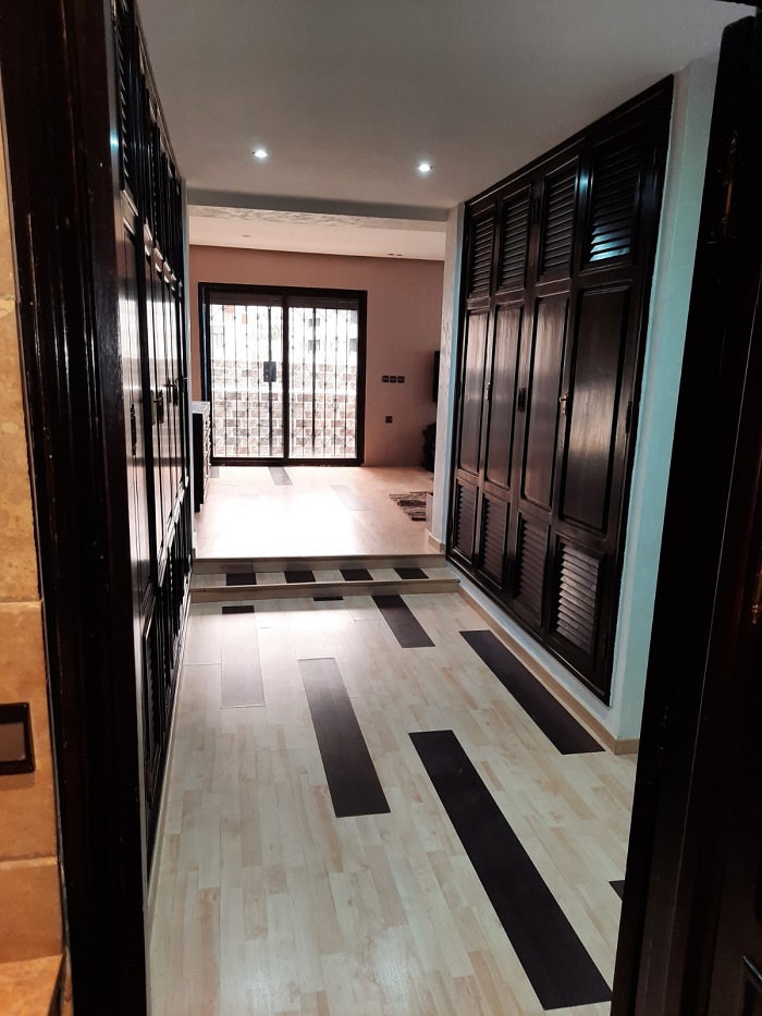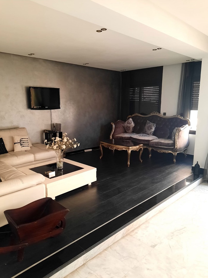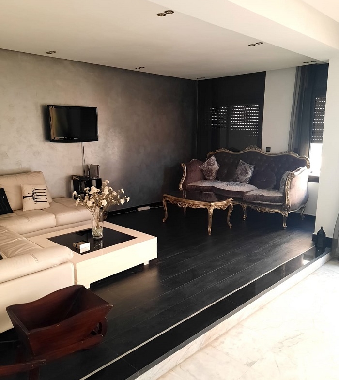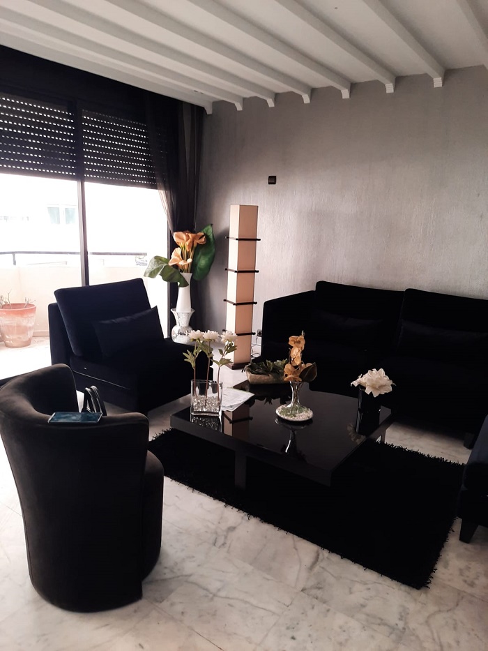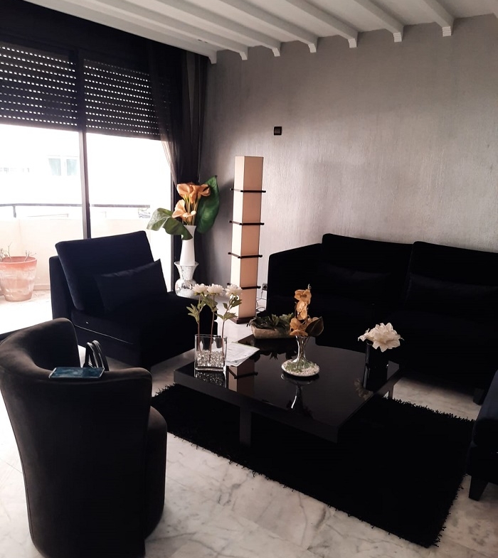 Immobilier-Casablanca-Location-Appartement-Meublé-Palmier, proche de toutes les commodités, se trouvant au premier étage, avec vue dégagée, d’une superficie de 200m², comprenant un triple salon avec balcon, salle d’eau invités, cuisine entièrement équipée, grande suite parentale dont salle de bain avec douche et grand dressing, une autre chambre à coucher avec rangements , salle de bain avec cabine douche, et une place au parking, l’appartement comprend aussi une cour