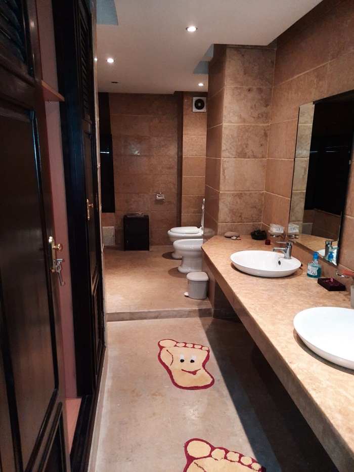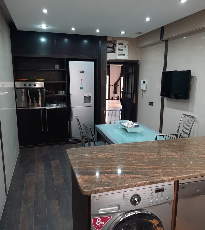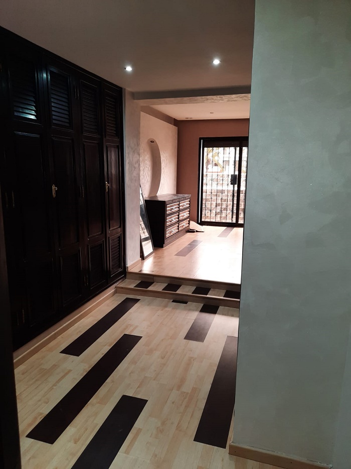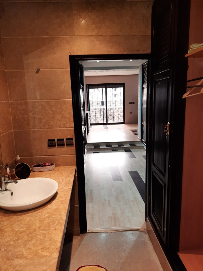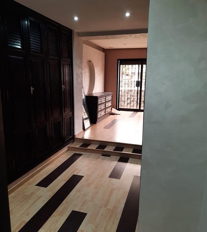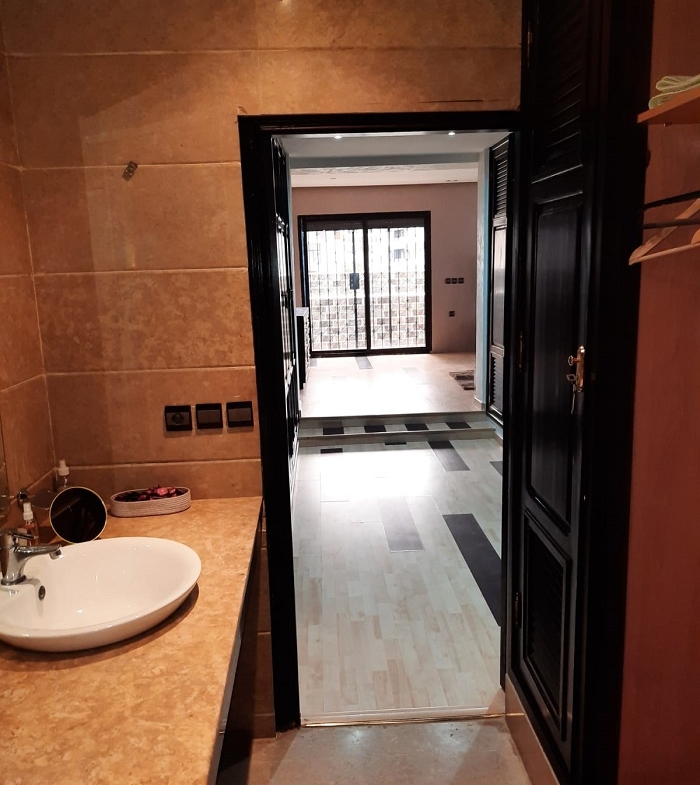 Immobilier-Casablanca-Location-Appartement-Meublé-Palmier, proche de toutes les commodités, se trouvant au premier étage, avec vue dégagée, d’une superficie de 200m², comprenant un triple salon avec balcon, salle d’eau invités, cuisine entièrement équipée, grande suite parentale dont salle de bain avec douche et grand dressing, une autre chambre à coucher avec rangements , salle de bain avec cabine douche, et une place au parking, l’appartement comprend aussi une cour