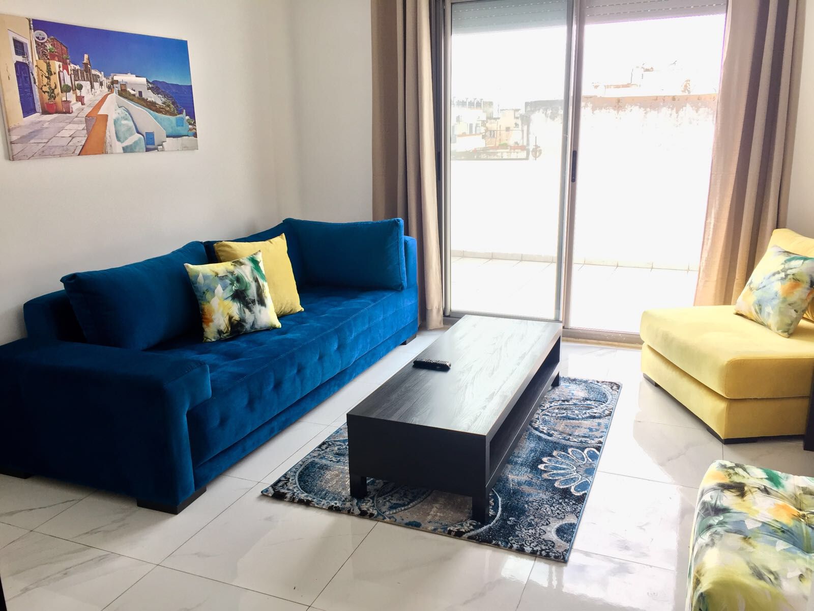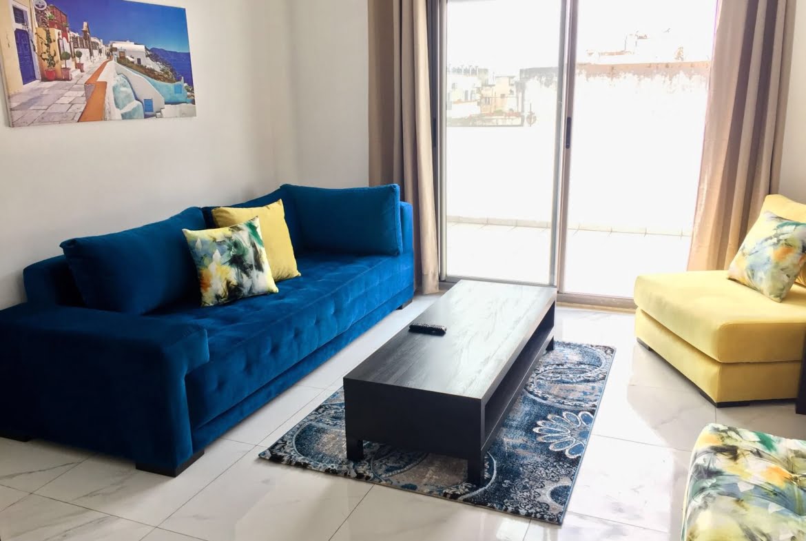 Immobilier-Casablanca-Location-Appartement-Meublé-Racine, d’une superficie de 54m² plus 19m² de terrasse, se trouvant au cinquième étage, pas loin d’Oliverie Maârif, ensoleillé et orienté plein sud, Proche de toutes les commodités, supermarché, restaurants et magasins H&M, Zara, etc…, l’appartement est sans vis-à-vis, comprenant un salon donnant sur une grande terrasse, cuisine entièrement équipée, deux chambres avec placards, une salle de bain avec cabine douche,
