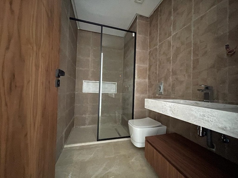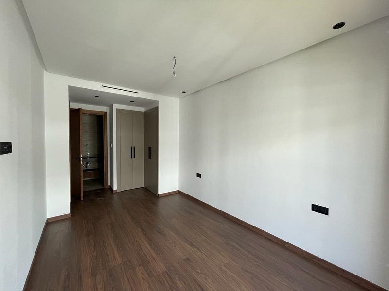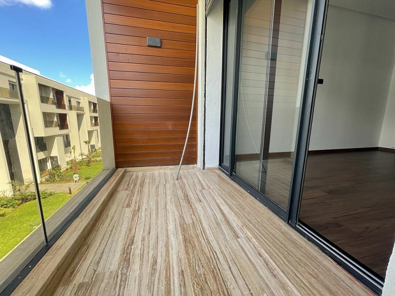 Immobilier-Casablanca-Location-Appartement-Neuf-Bouskoura est équipé de la climatisation centrale, parquet dans les chambres, terrasse avec habillage mural en bois