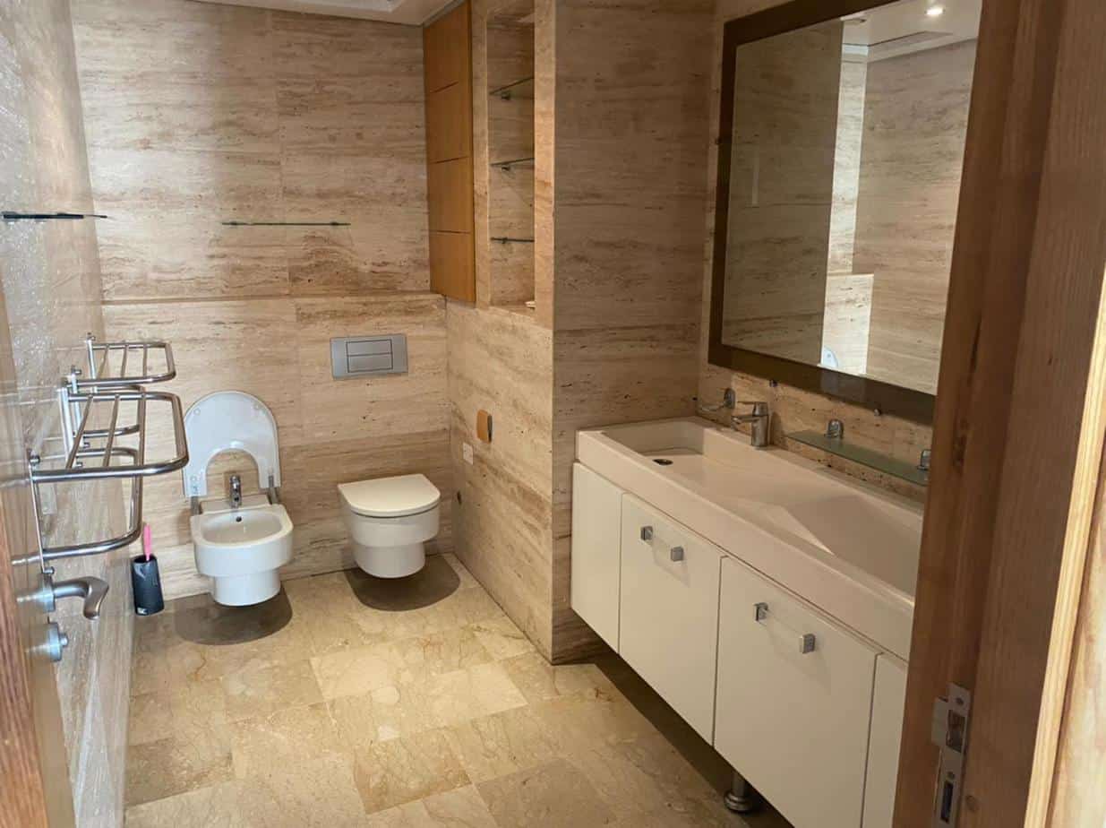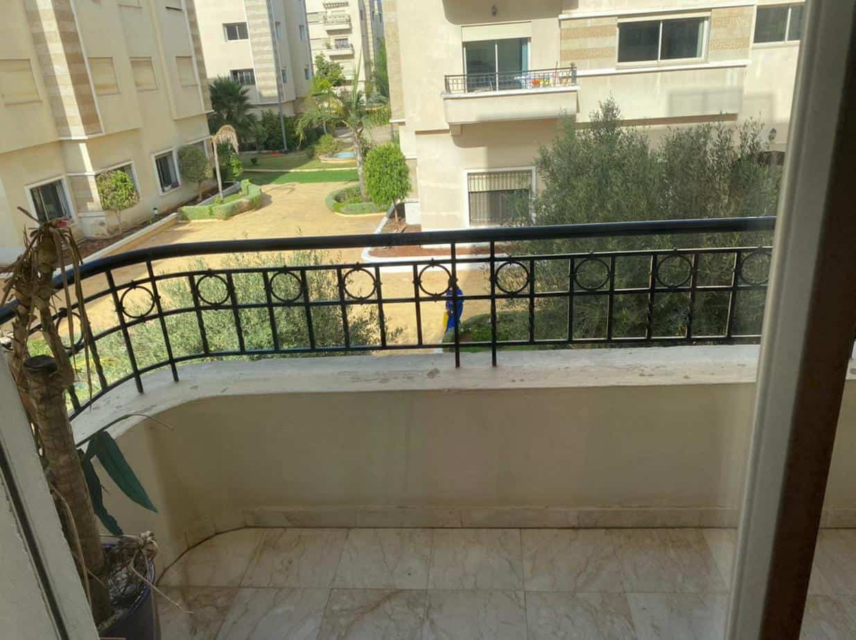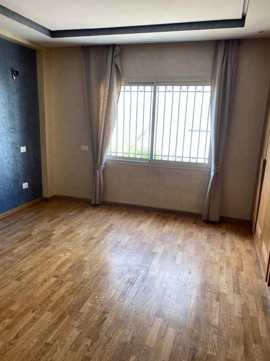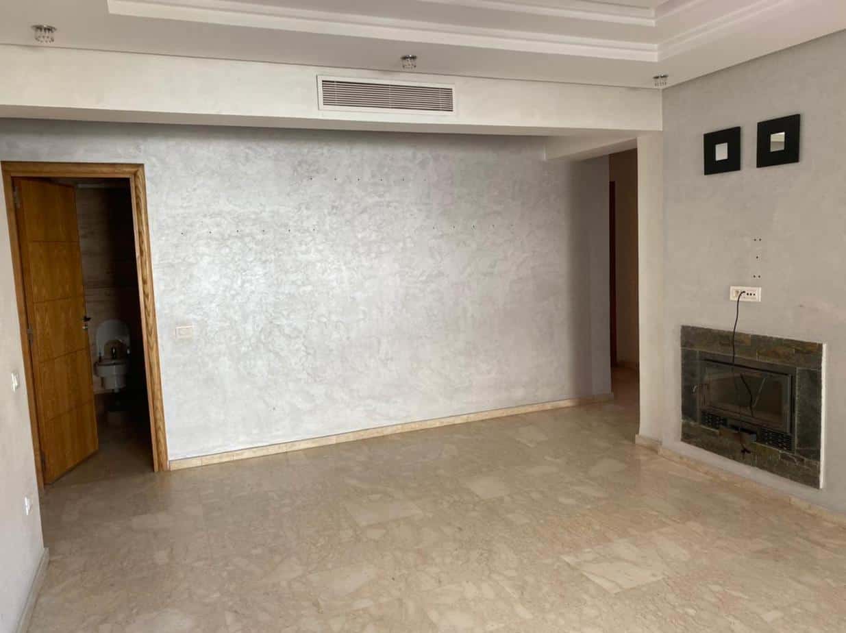 Immobilier-Casablanca-location-appartement-Oasis, appartement d’une superficie de 130m² dans une résidence de très haut standing et sécurisée, se trouvant au premier étage d’un immeuble de trois étages avec vue dégagée sur jardin, comprenant un salon avec coin cheminée, cuisine équipée, salle d’eau invités, chambre parentale dont placards et salle de bain avec baignoire, deux chambres avec placards pour enfants, salle de bain avec douche, place au parking