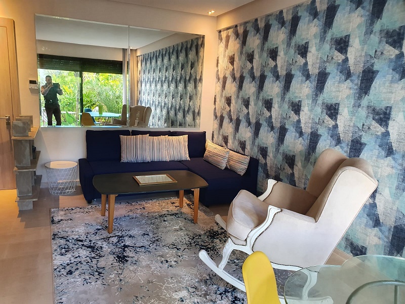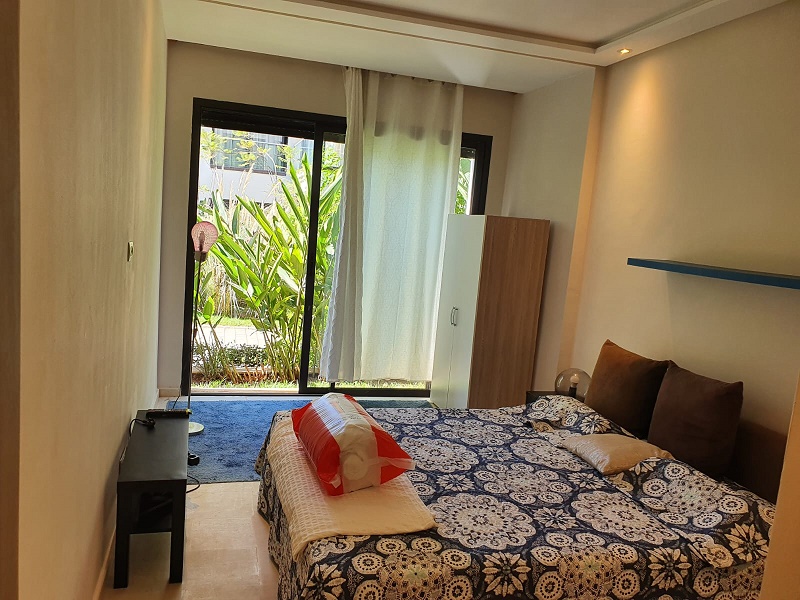 Immobilier-Casablanca-Location-Studio-Meublé-Ain Diab, ce luxueux studio neuf de très haut standing, est situé en rez-de-jardin d’une superficie de 60m² et 15m² de jardin, un vrai havre de paix dans une résidence sécurisée 24/24, joliment meublé, et bien ensoleillé comprenant un salon européen avec coin salle à manger donnant sur un petit jardin et une cuisine entièrement équipée attenante, une salle d’eau invités, une chambre parentale dont placards et salle de bain avec cabine douche à l’italienne, et une place au parking