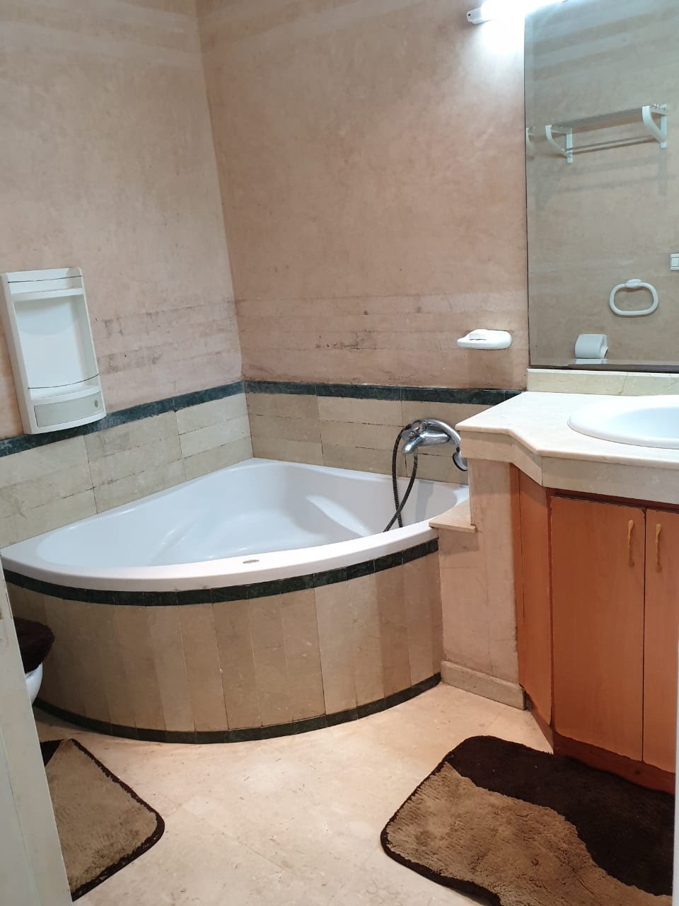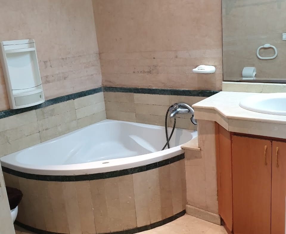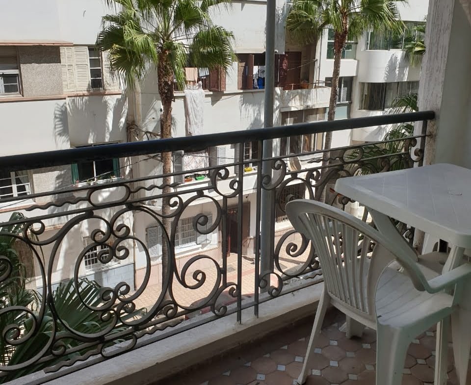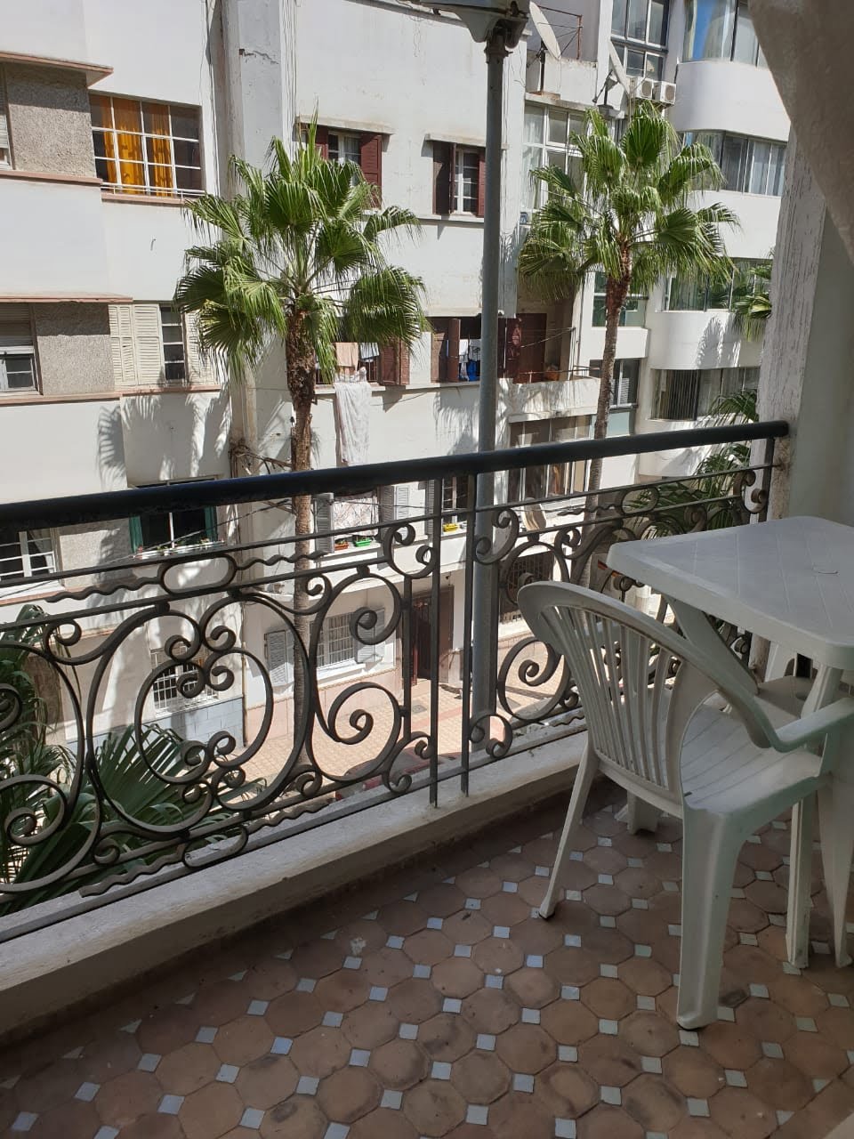 Immobilier-Casablanca-Location-Studio-Meublé-au-Centre-Ville, quartier mersultan proche de toutes commodités, et transports se trouvant au deuxième étage, dans une residence sécurisé et bien entretenu comprenant un salon en L européen avec coin salle à manger et cuisine entièrement équipée attenante, chambre à coucher avec grand lit et placards, salle de bain avec baignoire, couloir avec placards de rangement, balcon avec table et chaises, place au parking