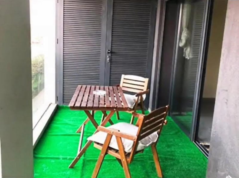 Immobilier-Casablanca-Location-Studio-Meublé-Casa-Finance-City, se trouvant au deuxième étage dans une résidence sécurisée avec espace vert, proche de toutes les commodités, dans l’un des quartiers récent de Casablanca, comprenant un salon européen avec baies vitrées donnant sur une terrasse avec table et chaises, une cuisine entièrement équipée attenante, une chambre à coucher avec placards et grand lit donnant sur un balcon, une salle de bain avec cabine douche à l’italienne, et une place au parking