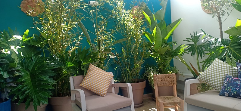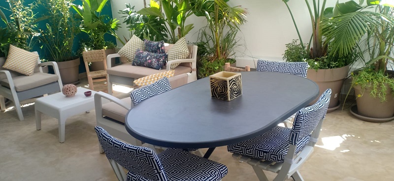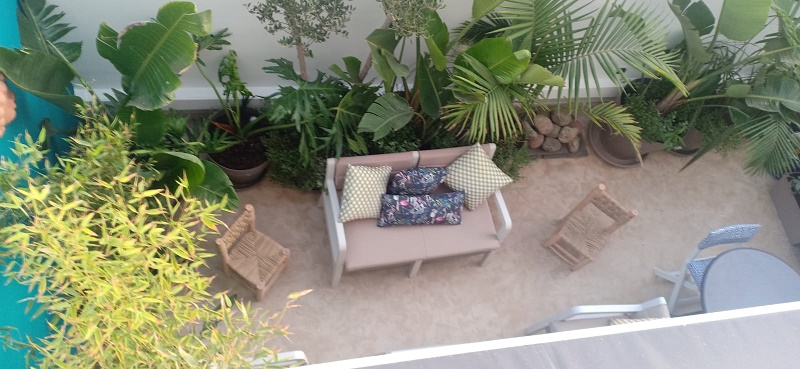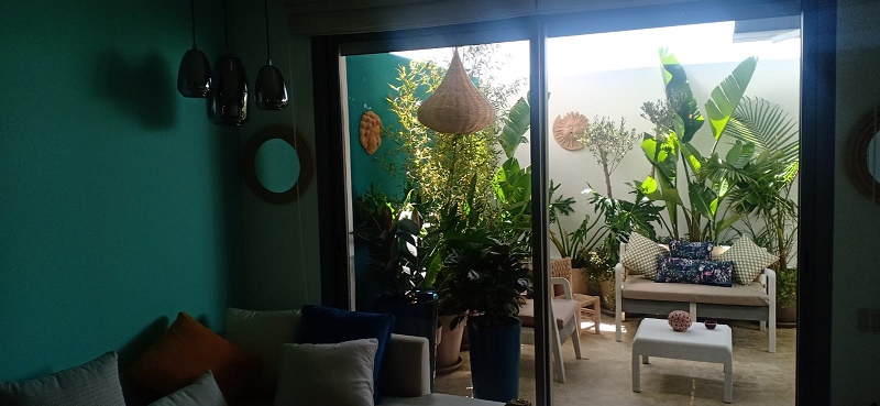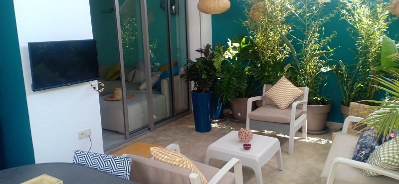 Immobilier-Casablanca-Location-Studio-Meublé-Quartier-Laymoun d’une superficie habitable de 50m² avec une grande terrasse de 24m², Immeuble moderne, idéalement situé entre Casa Finance City et Sidi Maârouf et à proximité de l’hôpital Cheikh Khalifa, Ce bien d’exception conçu comme une suite en appart-hôtel a l’avantage de disposer d’un très bel espace de vie extérieur, comprenant un salon moderne avec coin salle à manger, cuisine américaine entièrement équipée, une grande chambre à coucher, salle de bain, terrasse aménagée (table avec chaises, plantes, TV), place au parking