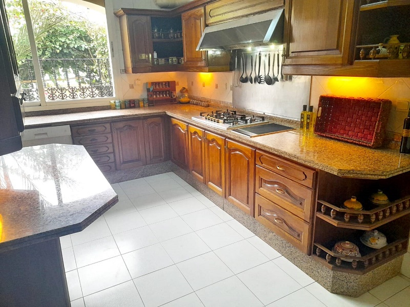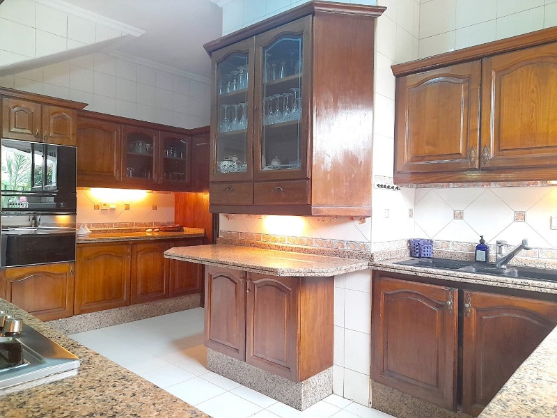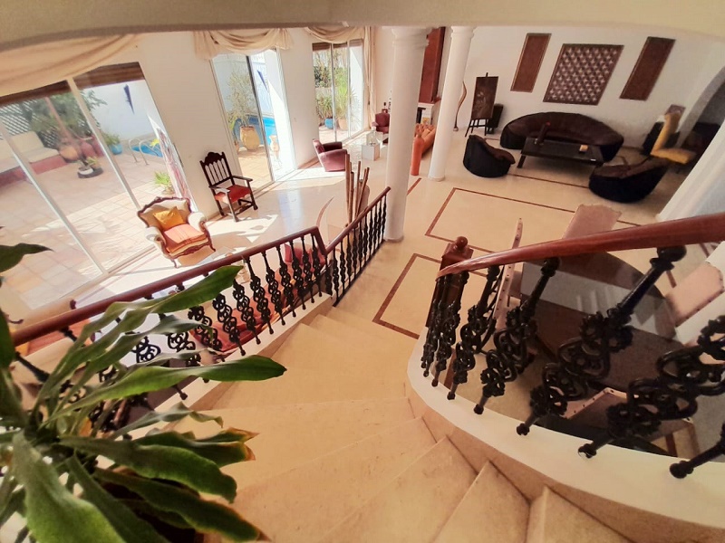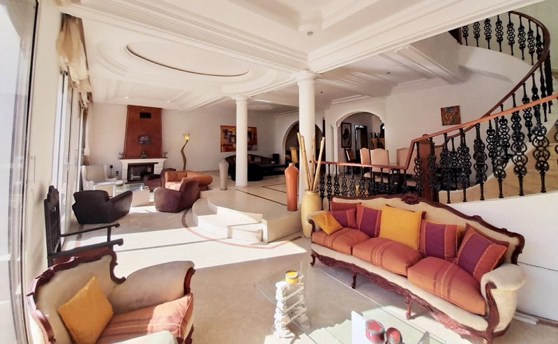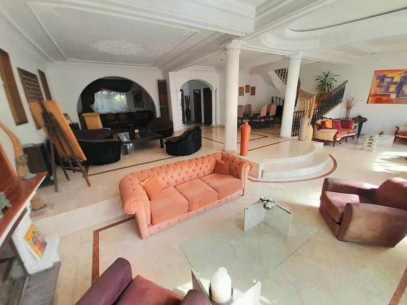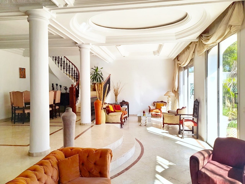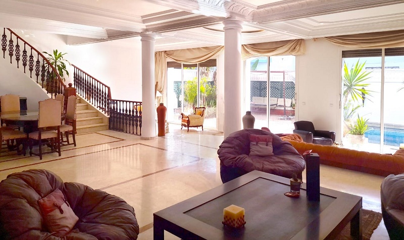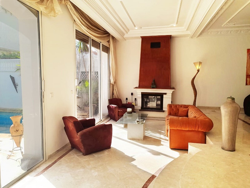 Immobilier-Casablanca-Location-Villa-Meublée-ou-vide-Ain Diab, villa d’une superficie de 700m² habitable, exposée plein sud, très bien située, quartier calme, superbes prestations, à 5mn de la mer et du Morocco Mall, comprenant au RDC : quadruple salons avec coin cheminée, espace salle à manger, le tout donnant sur terrasse, un beau jardin et piscine, une cuisine moderne et entièrement équipée, vestiaire invités,
