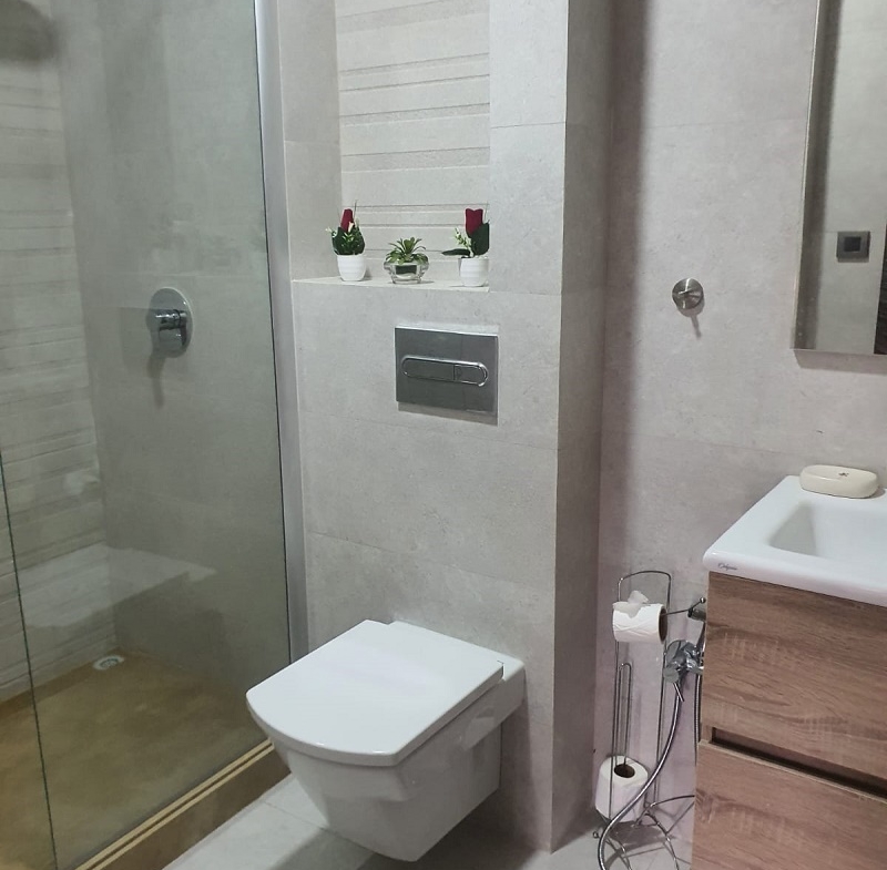 Immobilier-Dar-Bouazza-Appartement-Meublé-en-Location, ce Magnifique appartement d’une superficie de 107m², tout neuf jamais habité au premier étage vue sur piscine meublé situé à Dar Bouazza dans une résidence fermée et sécurisée comprenant un hall avec salle à manger (table et chaises), un salon européen avec coin cheminée donnant sur une magnifique terrasse , une salle d’eau invités, une suite parentale avec placards et salle de bain avec douche à l’italienne et une terrasse, une autre chambre à coucher avec rangements, une salle de bain avec douche, une cuisine entièrement équipée, et une place au parking titré ,