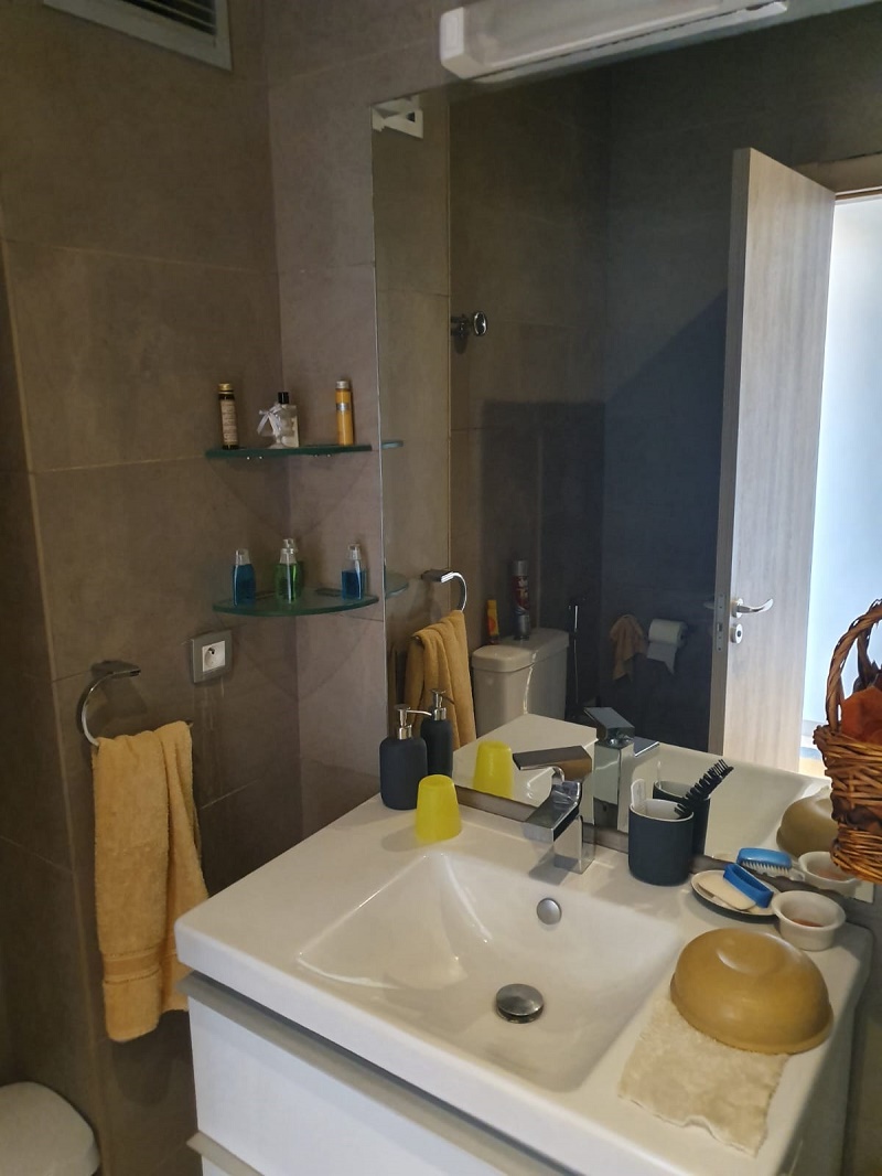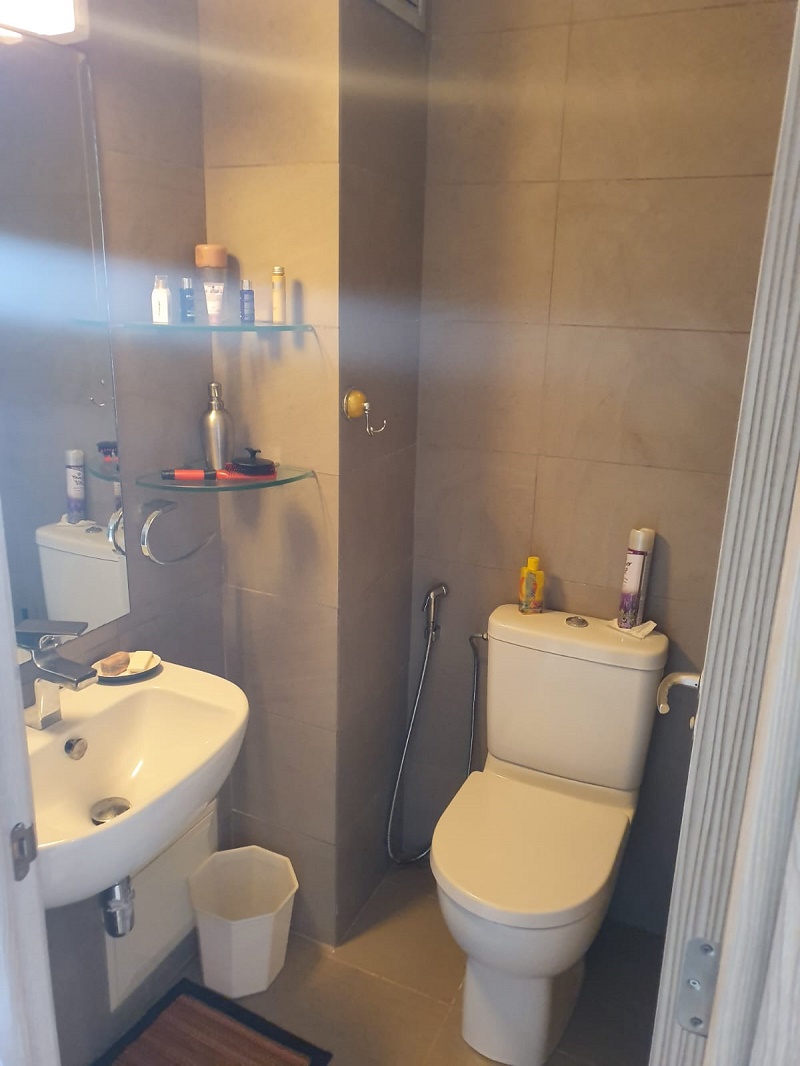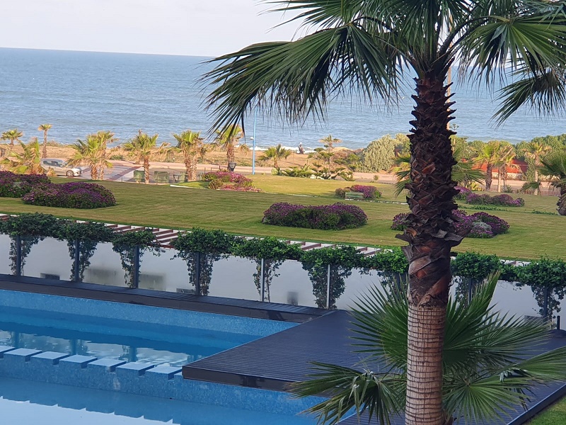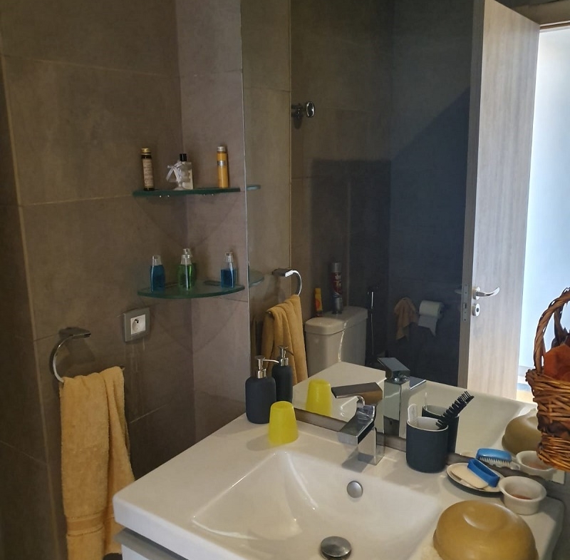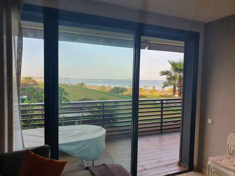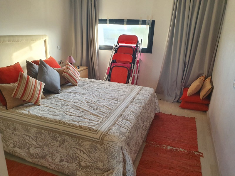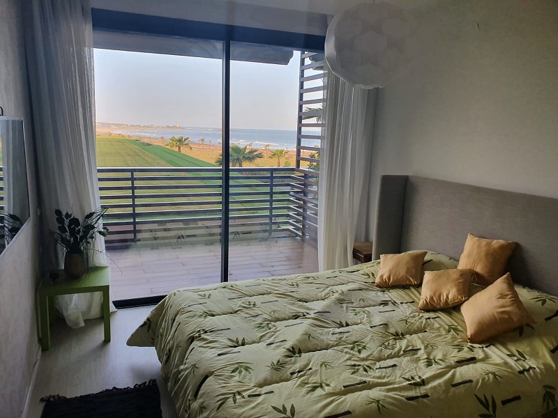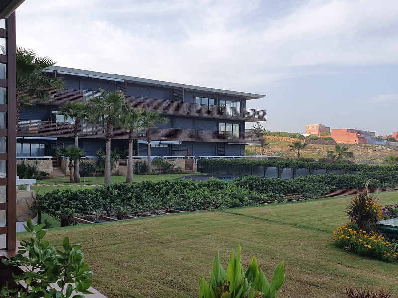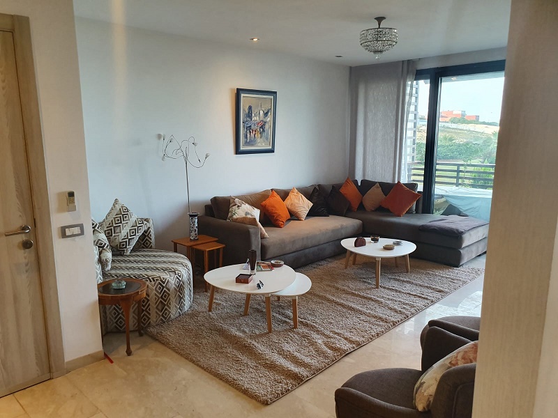 Immobilier-Dar Bouazza-Location-bel-Appartement-Meublé, ce Magnifique appartement est à 10mn de l’école Belge, dans une résidence sécurisée avec une vue imprenable sur mer et espace vert, comprenant un salon européen en L avec des petites tables basses et coin télévision donnant sur une belle terrasse, une salle d’eau invités, cuisine entièrement équipée, deux chambres à coucher avec placards dont une avec terrasse, une salle de bain avec cabine douche, place au parking