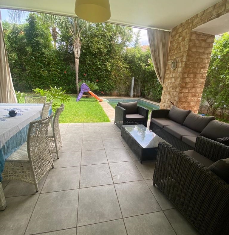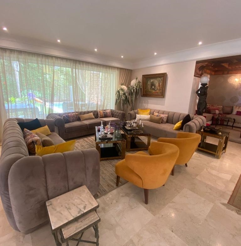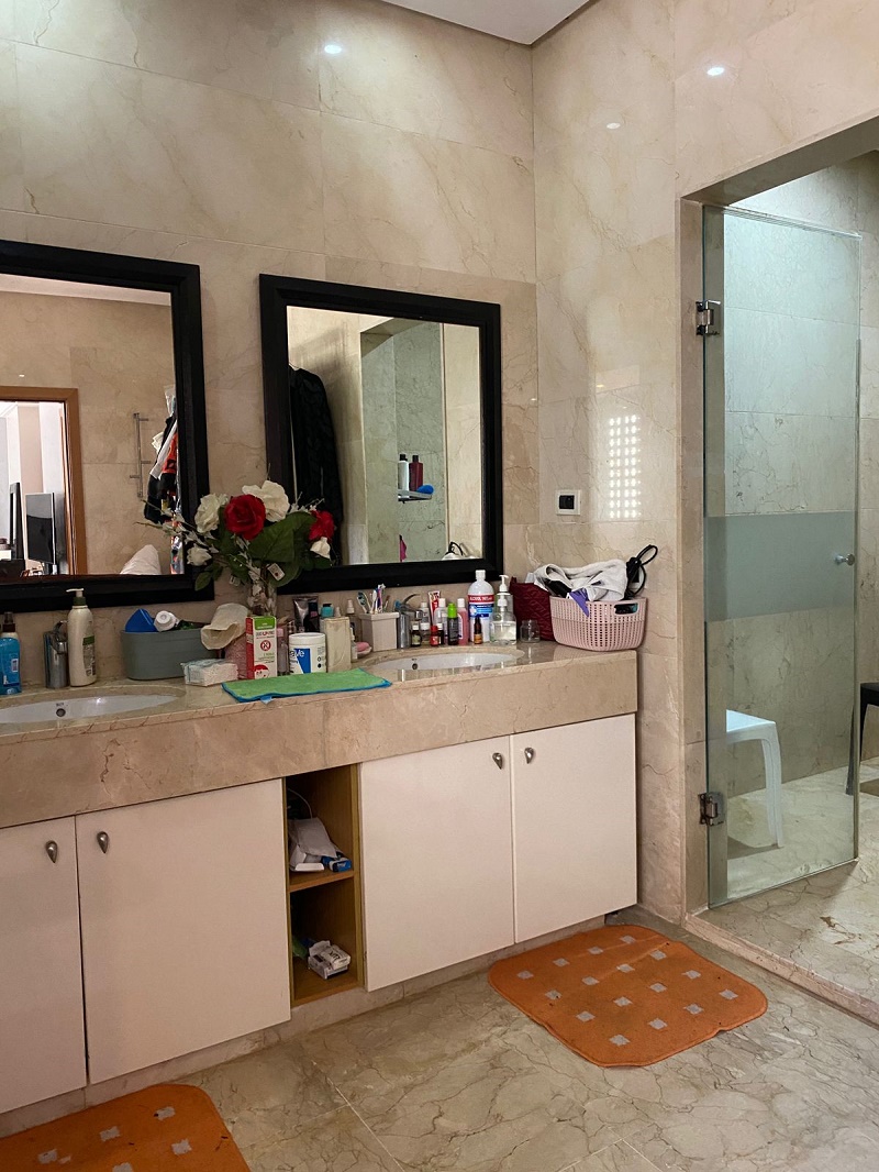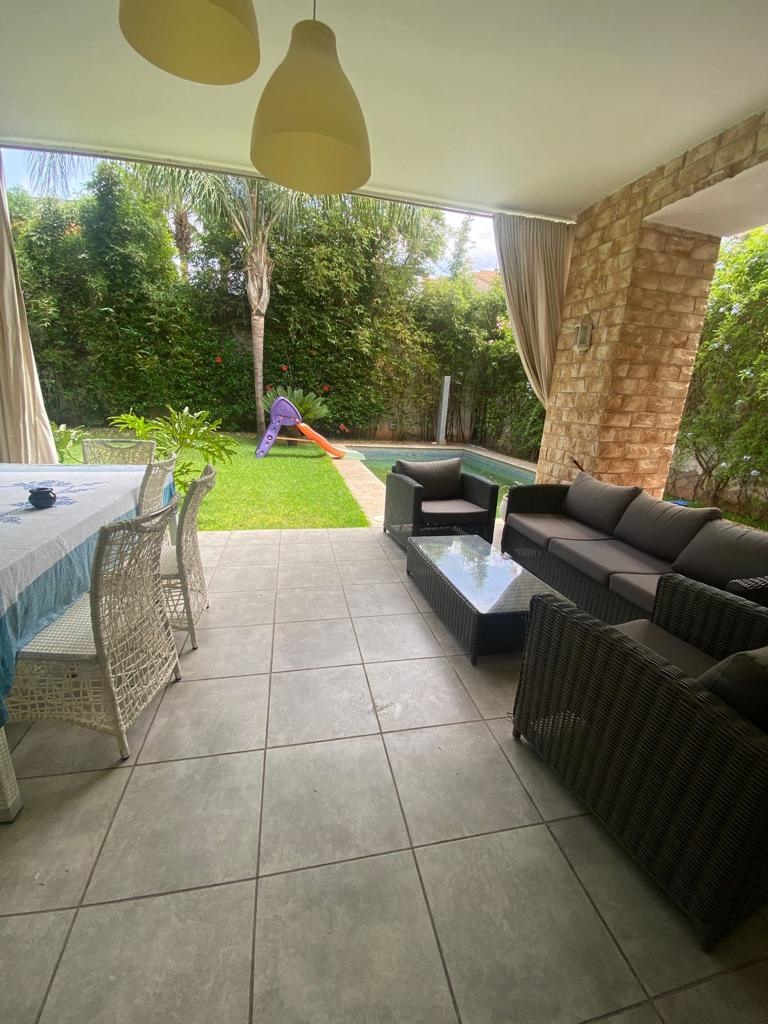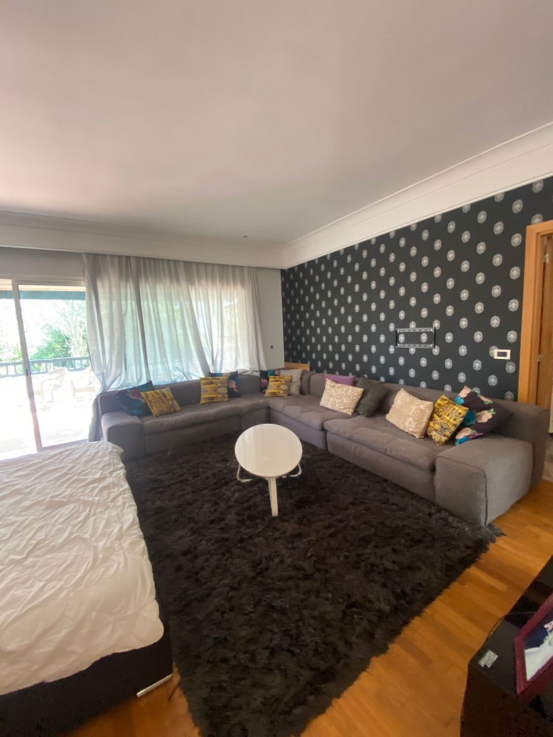 Immobilier-Dar Bouazza-Location-Villa-Meublée, d’une superficie de 700m sise dans une résidence sécurisée, proche de toutes les commodités (école, supermarché, restaurant…), comprenant au RDC: un triple salon joliment meublé moderne avec baies vitrées donnant sur une terrasse avec salon jardin et belle piscine, un grand patio avec canapés et un beau séjour, une salle d’eau invités, une belle cuisine fonctionnelle et entièrement équipée, une chambre pour le personnel de maison avec ses sanitaires, une autre cuisine à l’extérieur avec salle d’eau, garage pour voitures