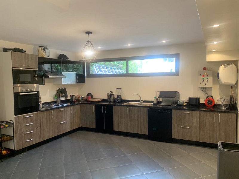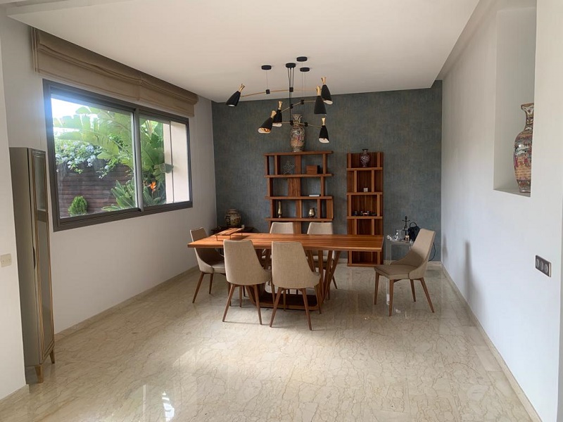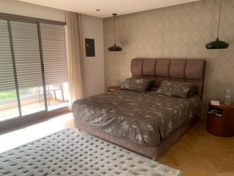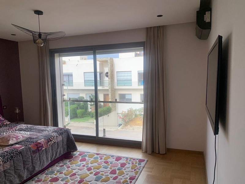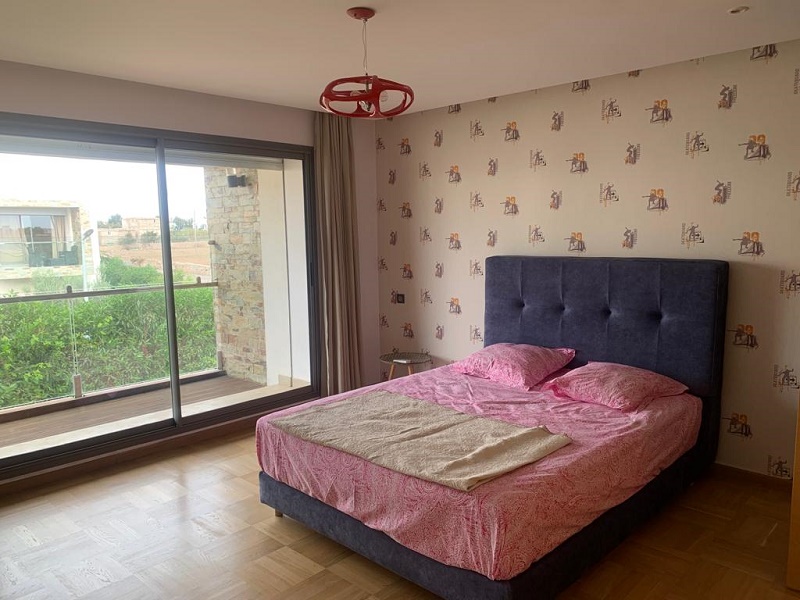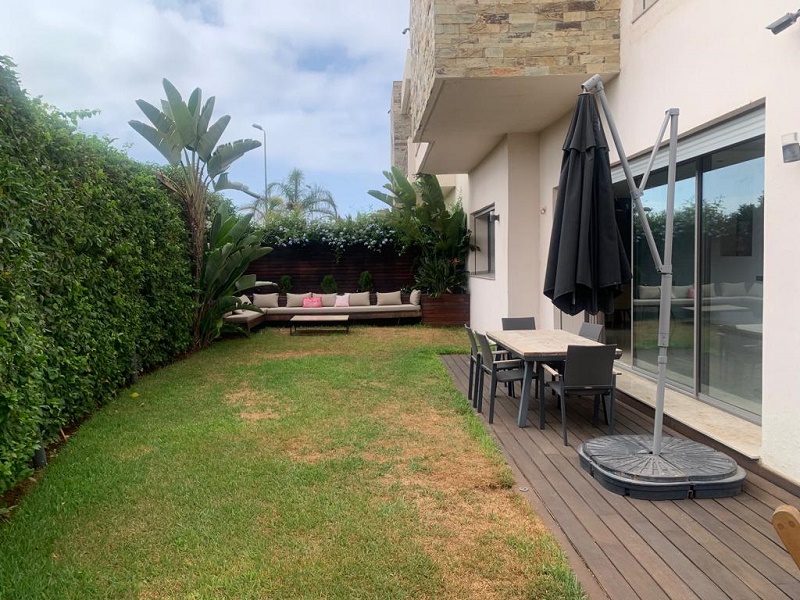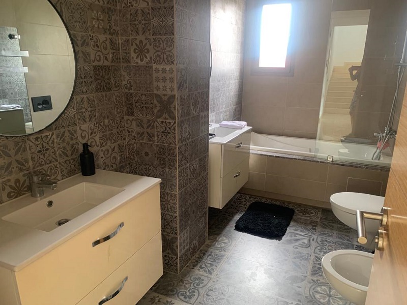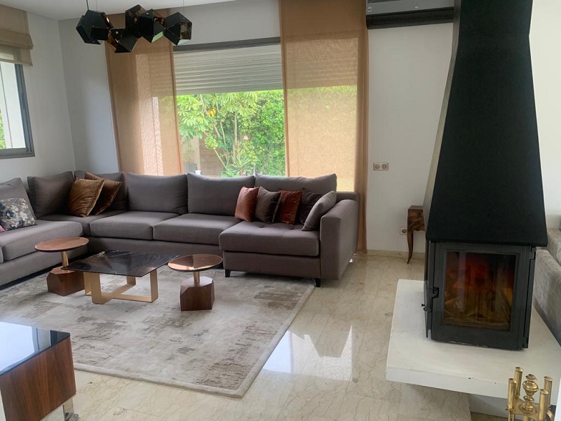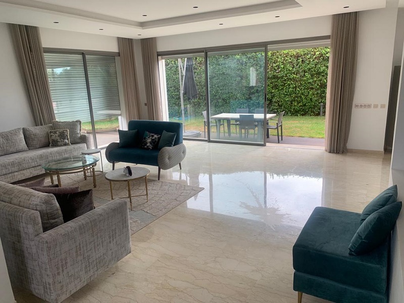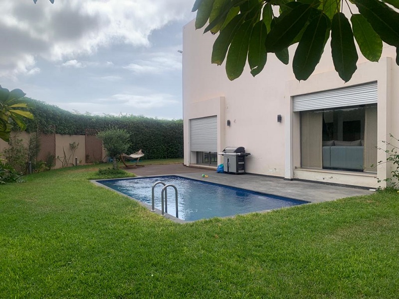 Immobilier-Dar Bouazza-Location-Villa-Meublée, d’une superficie de terrain de 500m² construit 400m² sur trois niveaux, angle orienté sud-ouest, dans une résidence sécurisée sur Dar Bouazza proche de toutes commodités (écoles, supermarché, restaurant…), comprenant un triple salon avec coin cheminée avec vue sur un beau jardin et la piscine, espace salle à manger, salle d’eau invités, à l’étage on y trouve une suite parentale dont dressing et salle de bain avec baignoire, une suite junio dont placards et salle de bain avec douche, deux chambres à coucher avec placards, salle de bain avec cabine douche, le sous-sol contient une grande cuisine entièrement équipée (avec possibilité de la mettre au rez de chaussée, une chambre pour le personnel et sanitaire, garage pour deux voitures,