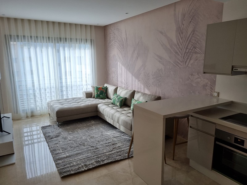 ce studio comprend un salon européen, une chambre à coucher avec grand lit et placards, salle de bain avec douche à l’italienne, une cuisine entièrement équipée, et une place au parking,