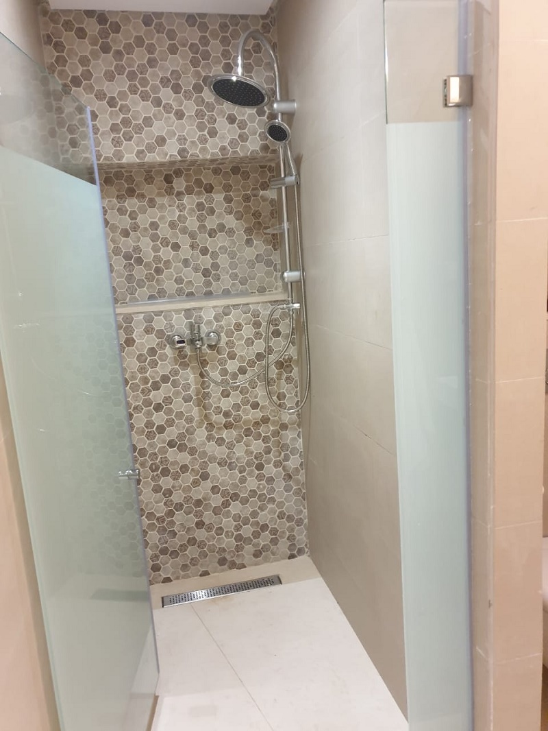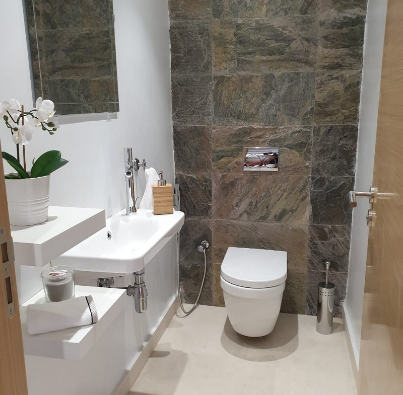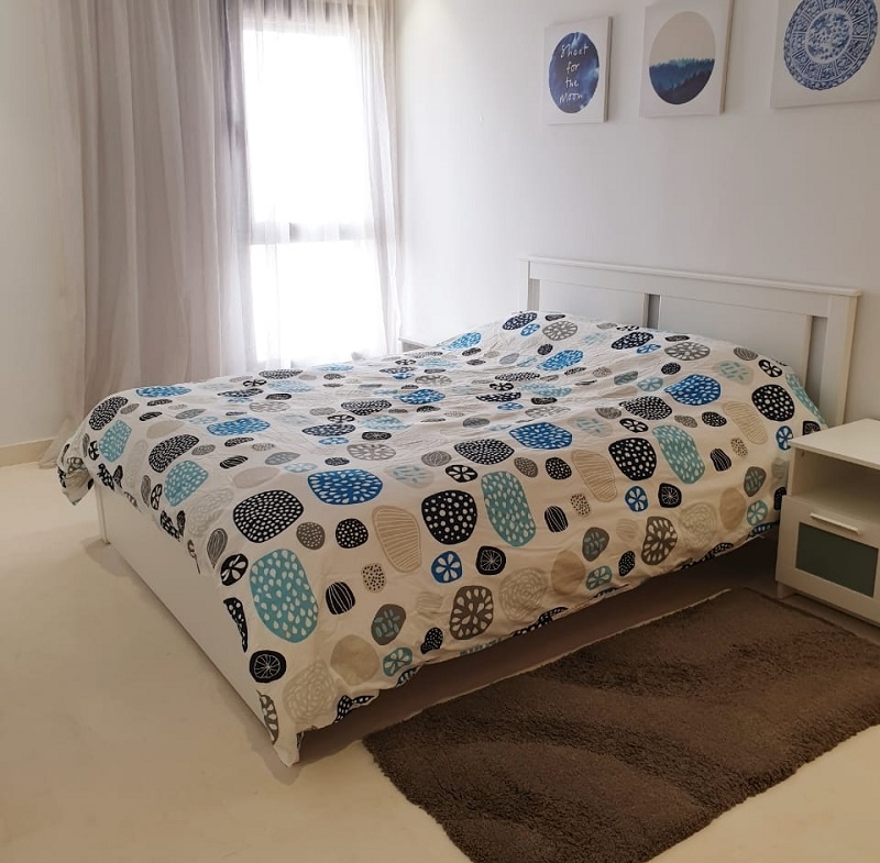 Location-Appartement-Meublé-Casablanca-Finance-City, meublé avec goût, dans une résidence sécurisée avec espace vert, se trouvant en étage élevé, au 6ème sans vis-à-vis comprenant un spacieux salon européen avec canapés en U et espace salle à manger, chambre parentale dont placards avec salle de bain avec cabine douche, cuisine entièrement équipée, une autre chambre à coucher, salle de bain avec douche et place de parking