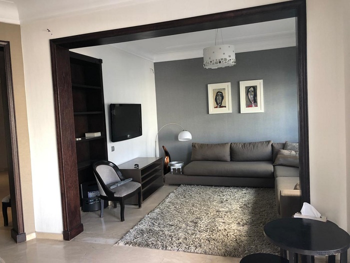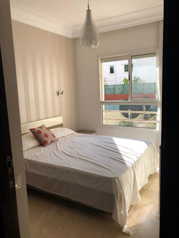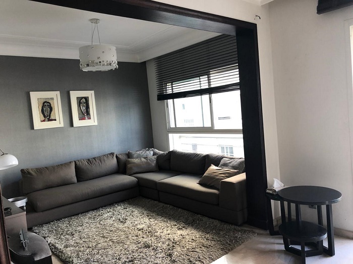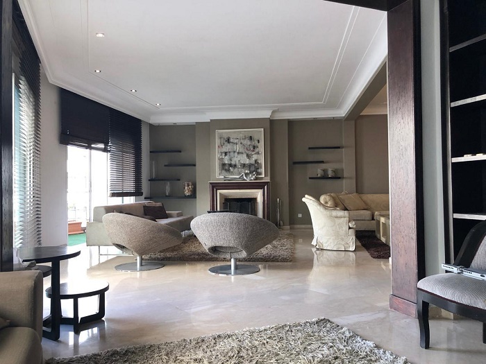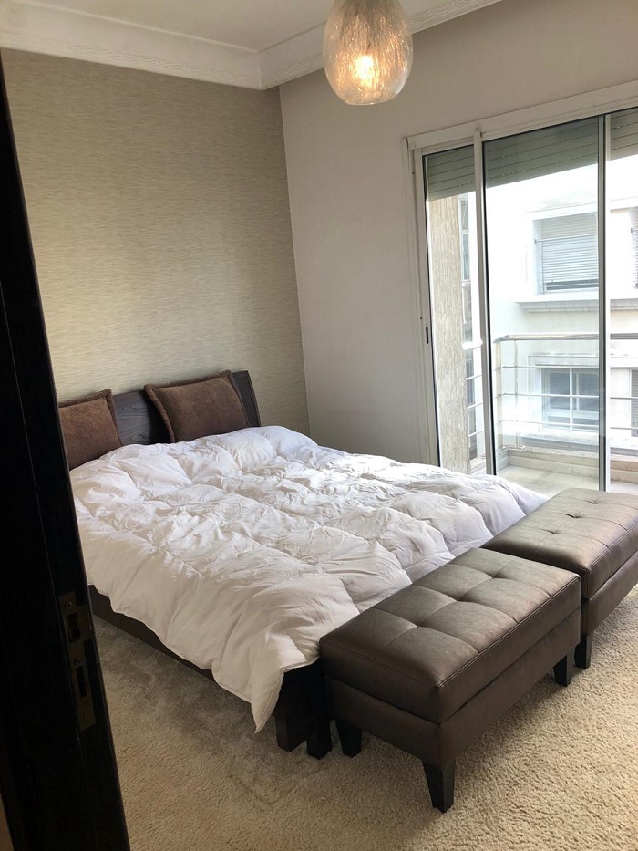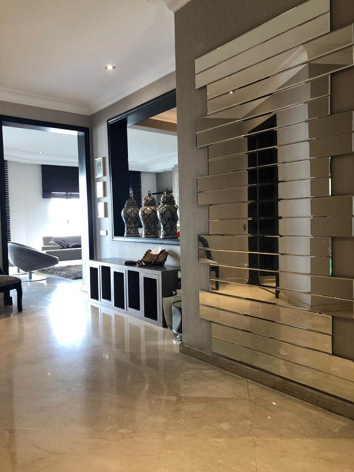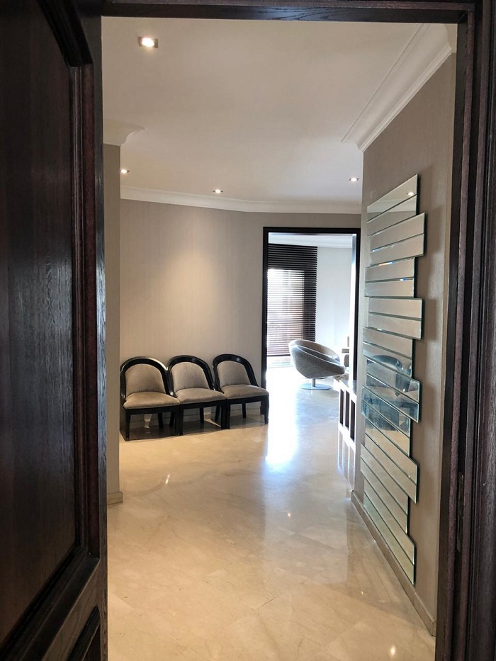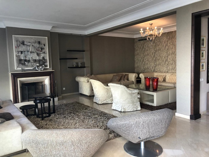 Location-Appartement-Meublée-Racine Ext d’une superficie de 176m², appartement sans vis à vis et seul au palier, comprenant un double salon européen et marocain moderne, un séjour avec coin salle à manger, une salle d’eau invités, une cuisine entièrement équipée, une suite parentale avec grand lit dont salle de bain avec baignoire et dressing, deux chambres pour enfants avec placards, salle de bain avec baignoire, deux places au parking, et box