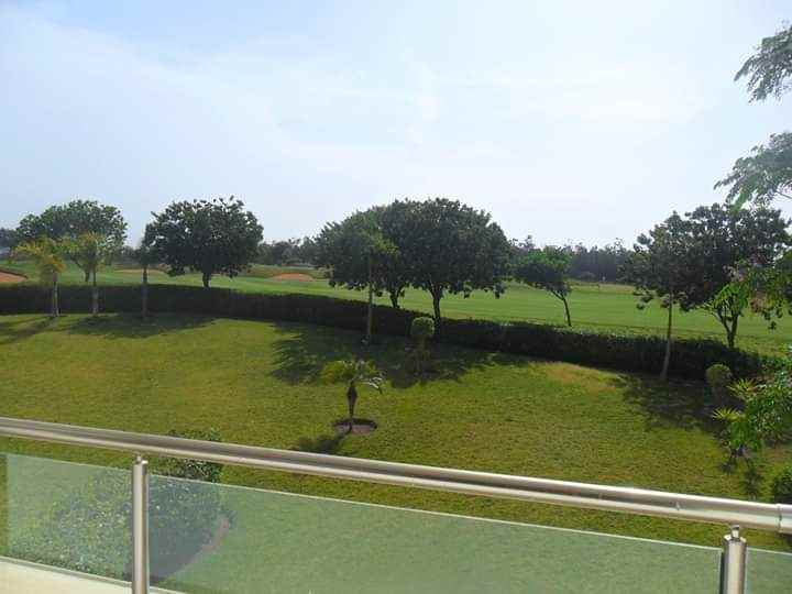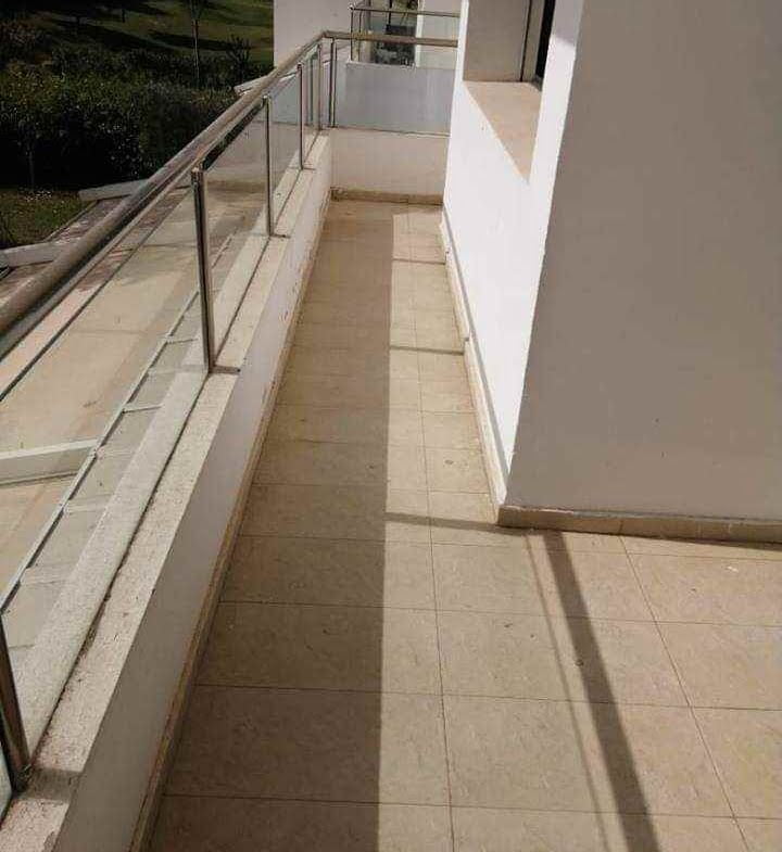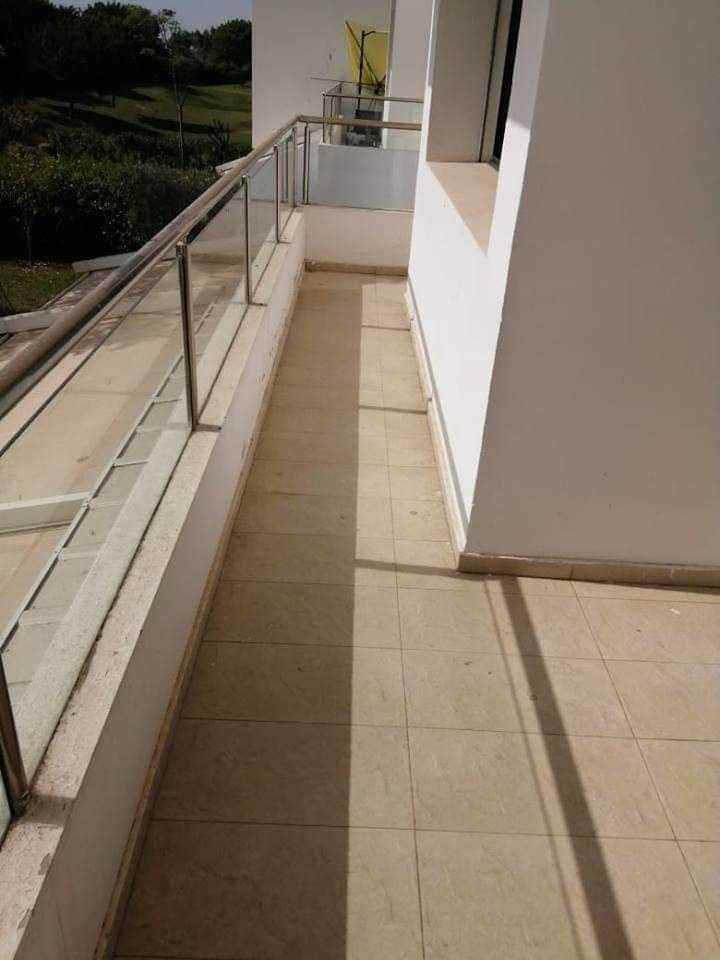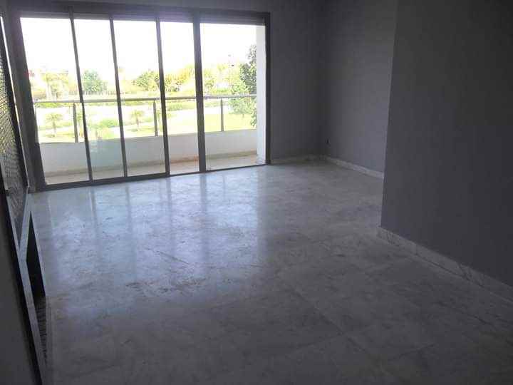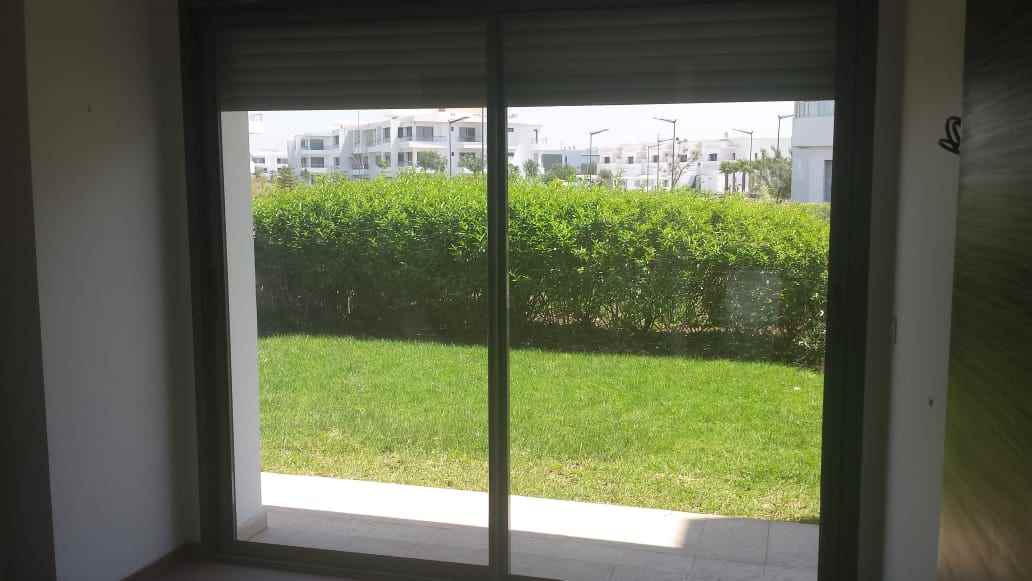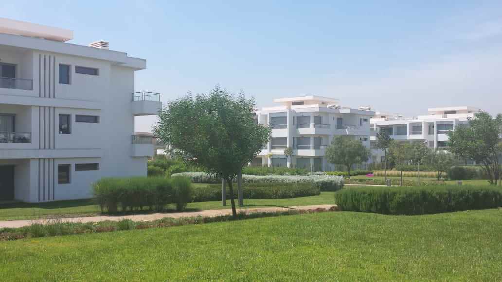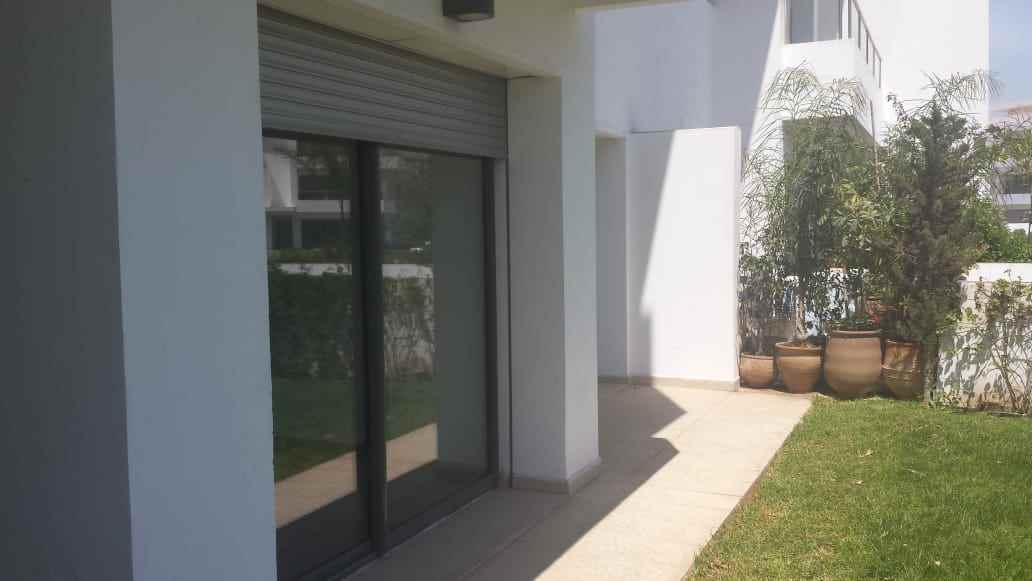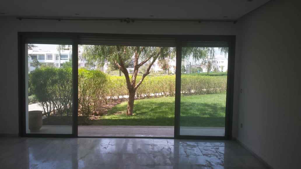 Immobilier au Maroc, LOCATION-APPARTEMENT-REZ-DE-JARDIN-BOUSKOURA, ville verte, d’une superficie de 140m² et 16m² de terrasse, 100m² de jardin privatif donnant sur les salons et chambres, très ensoleillé, avec climatisation centralisée, comprenant 1 vaste double séjour avec coin feu ouvert sur terrasse et jardin, salle d’eau invités, suite parentale dont dressing et salle de bain, 2 chambres, salle de bain, garage et box le tout dans une résidence golfique, calme, très sécurisée avec piscine collective