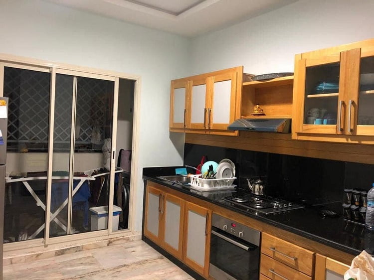 Immobilier-Casablanca-Location-Appartement-Vide-Meublé-Californie, appartement haut standing situé dans une résidence sécurisée, surveillée 24h/24h 7j/7j et dotée d’espace vert. Se trouvant au rez-de-chaussée, comprenant un salon européen, salle d’eau invités, grande cuisine entièrement équipée avec espace buanderie, deux chambres à coucher avec rangements, une salle de bain avec douche à l’italienne, et une place au parking
