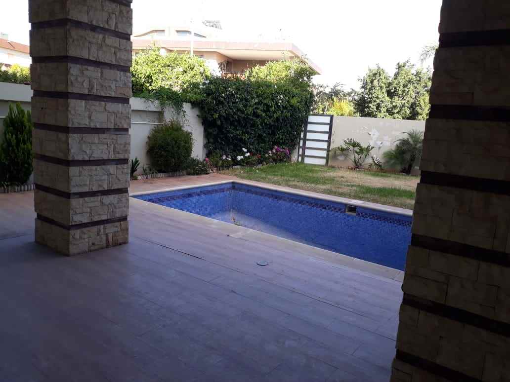 Location-belle-villa-moderne-sur-bouskoura-ville-verte avec deux façades dans une résidence sécurisé d’une superficie d’environ 340m terrain et de 400m construit composé d’un RDC avec grand double salon baie vitré donnant sur la piscine et le jardin, un séjour, une cuisine entièrement équipé avec coin buanderie, une chambre de personnel avec ses sanitaires, et parking pour deux places de voitures