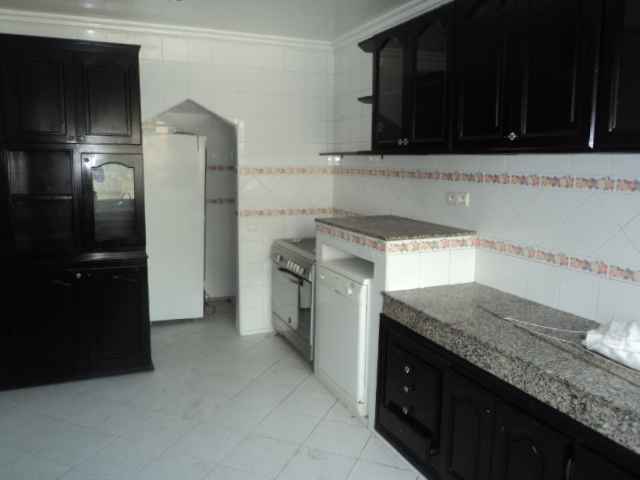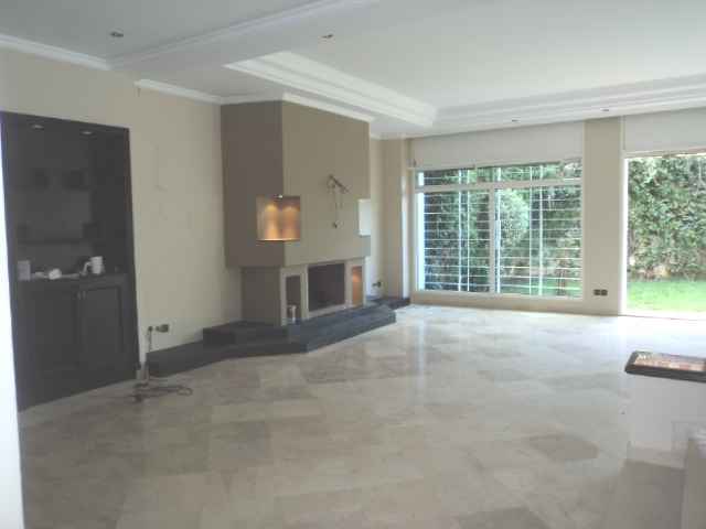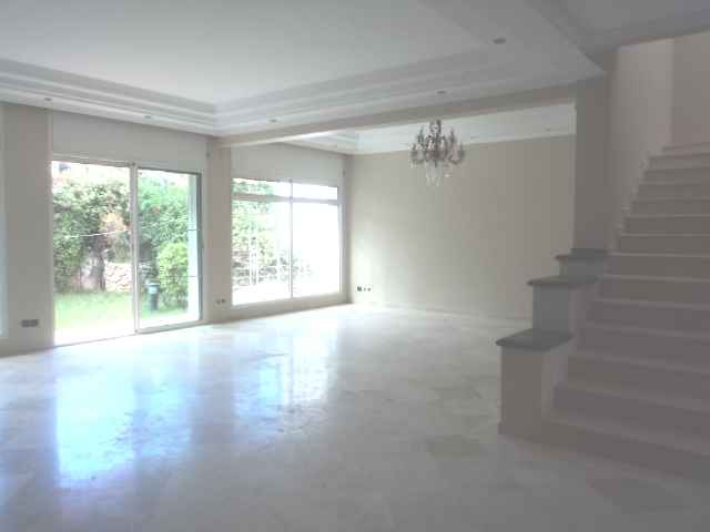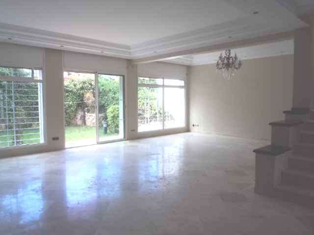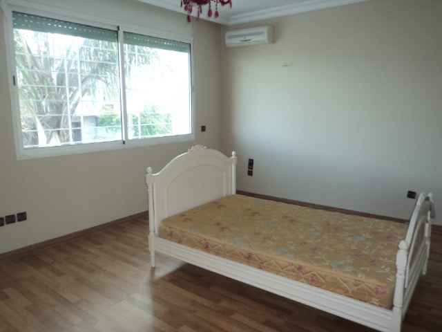 LOCATION-BELLE-VILLA SUR-AIN-DIAB composée au RDC : double salon avec coin cheminée donnant sur le jardin, salle d’eau, séjour, cuisine avec espace buanderie, Étage : deux grandes chambres avec placards et climatisation, suite parentale dont dressing et salle de bain avec baignoire Sous-Sol : chambre pour le personnel avec sa salle de bain, une autre chambre (KGB), garage fermé avec grand espace pour voitures