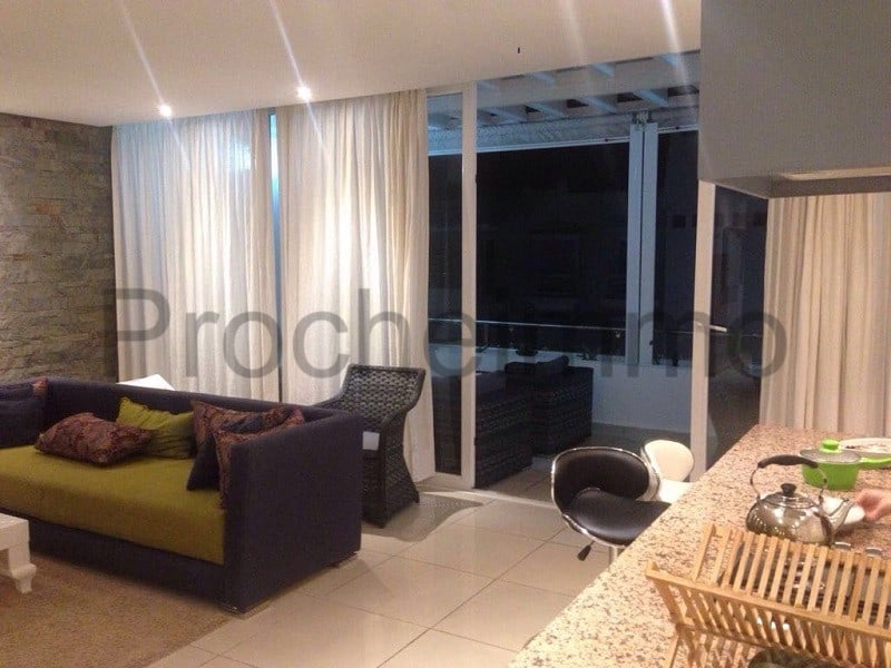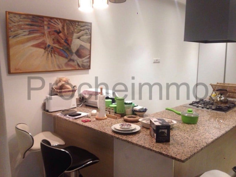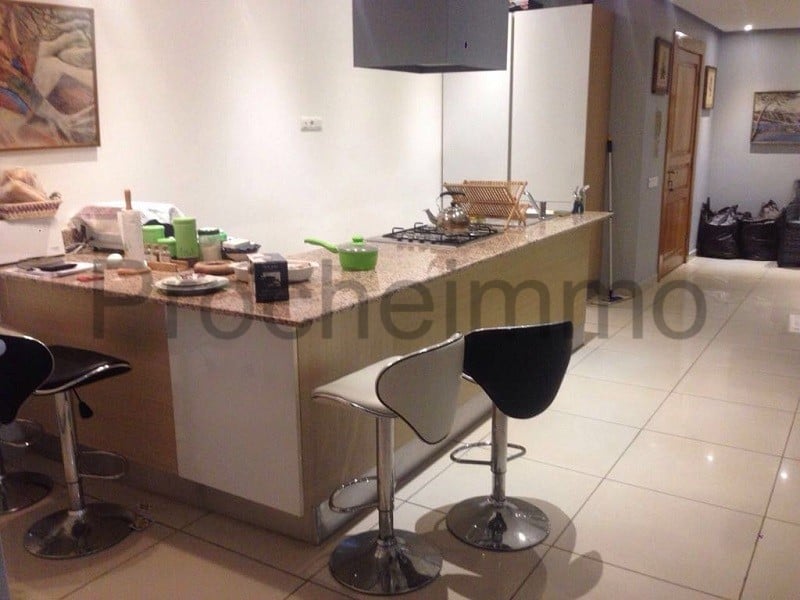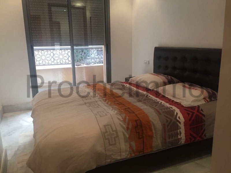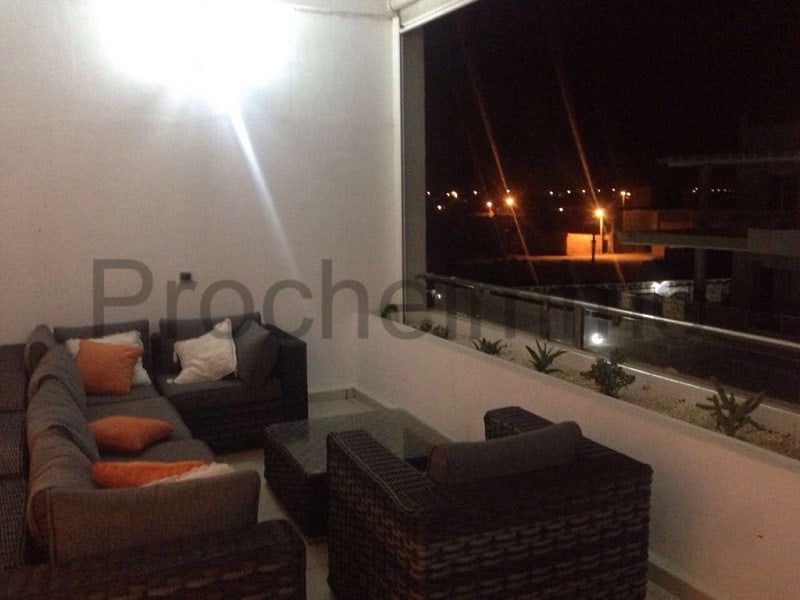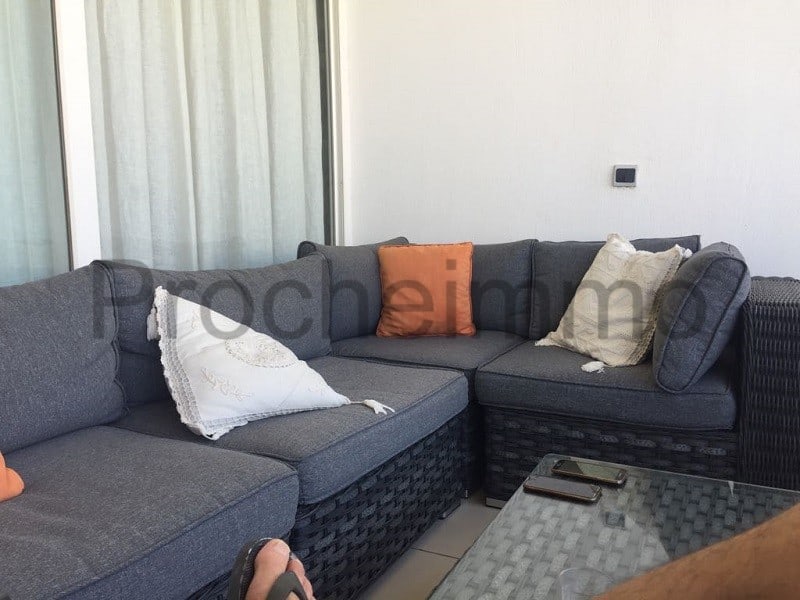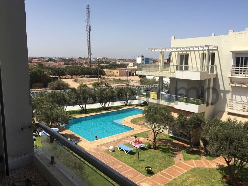 Location appartement meublé, situé dans une résidence balnéaire à Dar Bouazza, comprenant un salon avec cuisine attenante, une chambre avec placards, salle de bain avec douche, suite parentale dont dressing et salle de bain, grande terrasse, piscine privative, parking, sécurisée, location courte durée